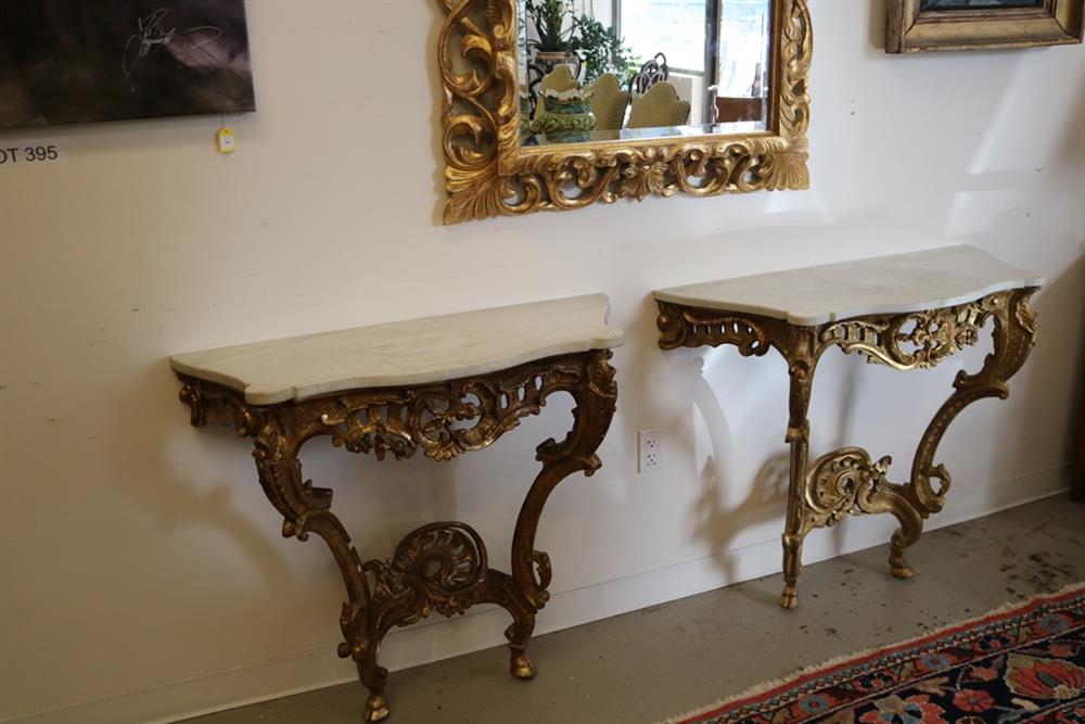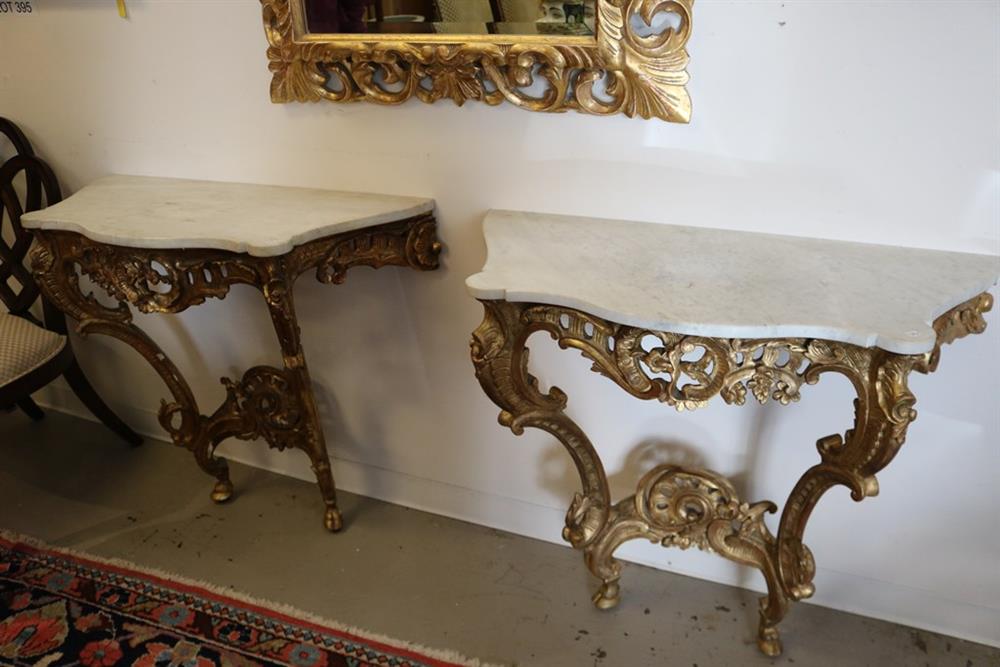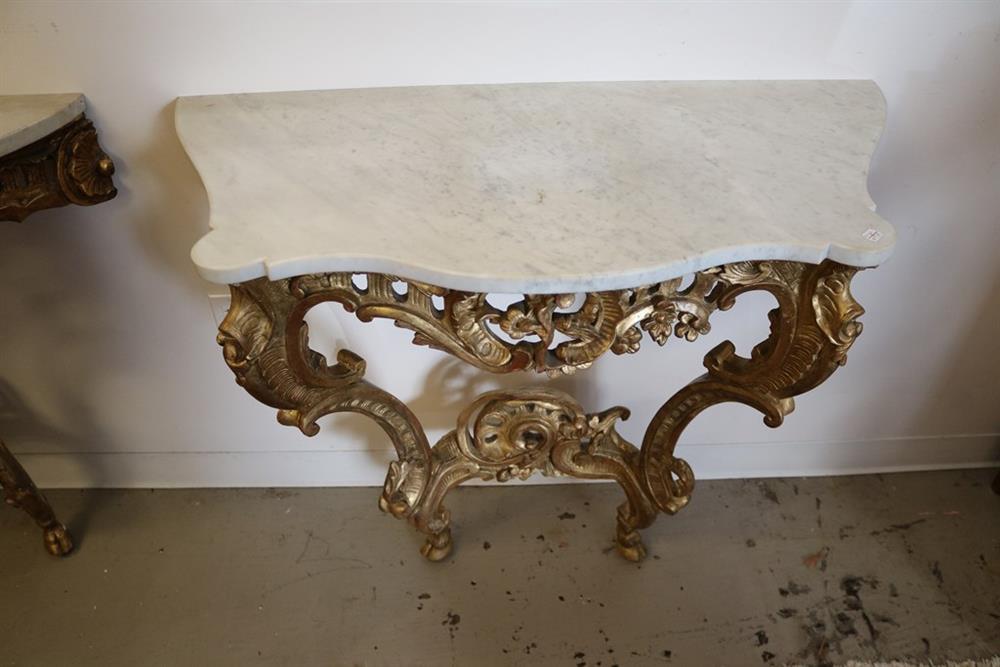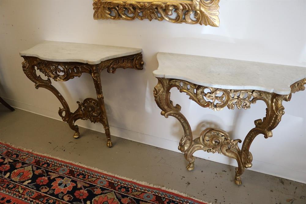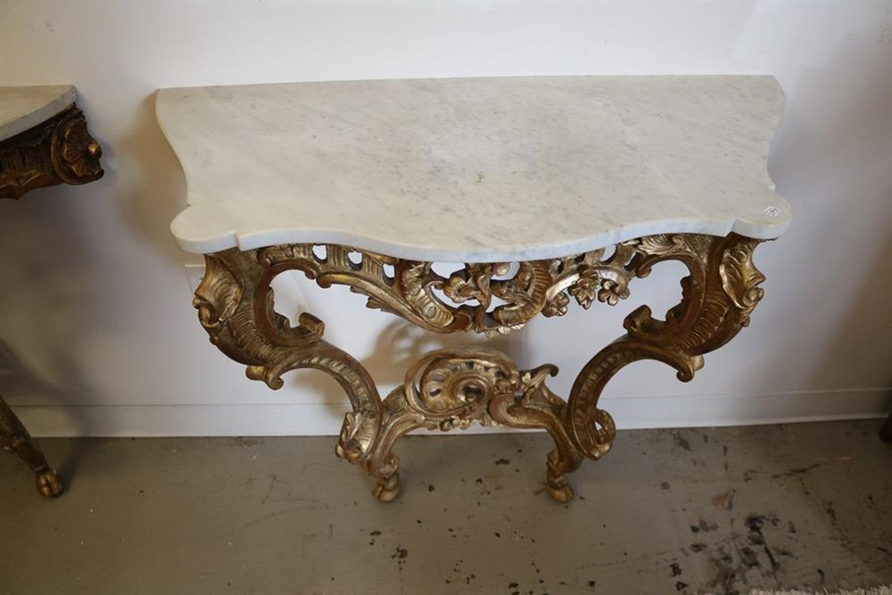 LOUIS XV GILTWOOD CONSOLE TABLE AND ANOTHER EN SUITE OF LATER DATE. Each with shaped, grey-veined white marble top above a waved, pierced frieze carved with C-scrolls and flowers; re-gilded. - H: 35 1/4". W: 38". D: 17 3/4". PROVENANCE:Estate of Baroness Marie-Christine Boulart-Deschamps, Washington, DC Estimate $3,000-4,000