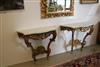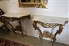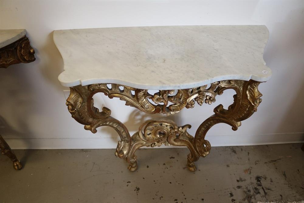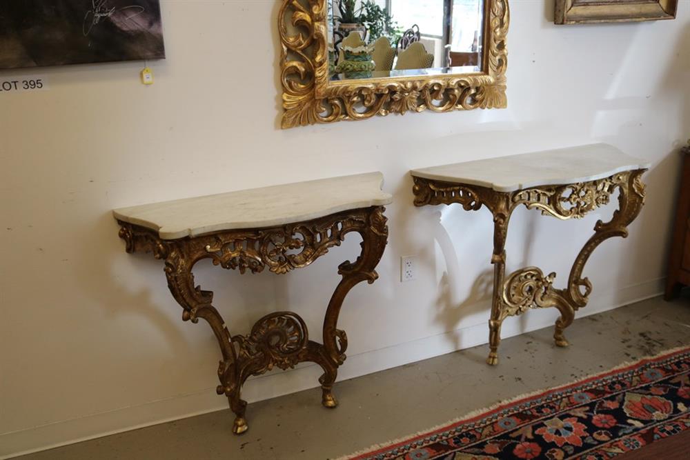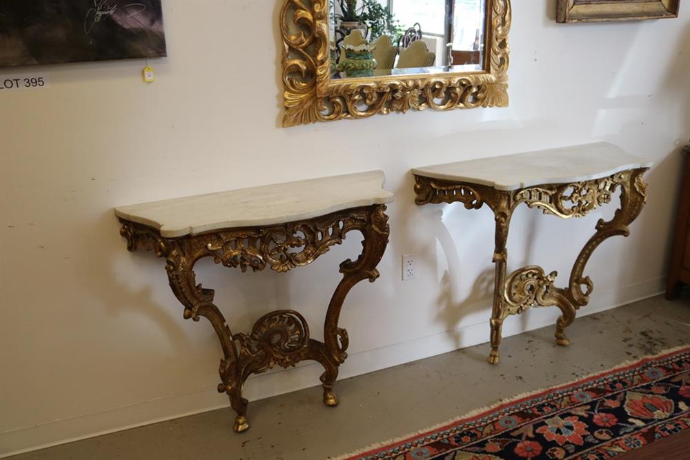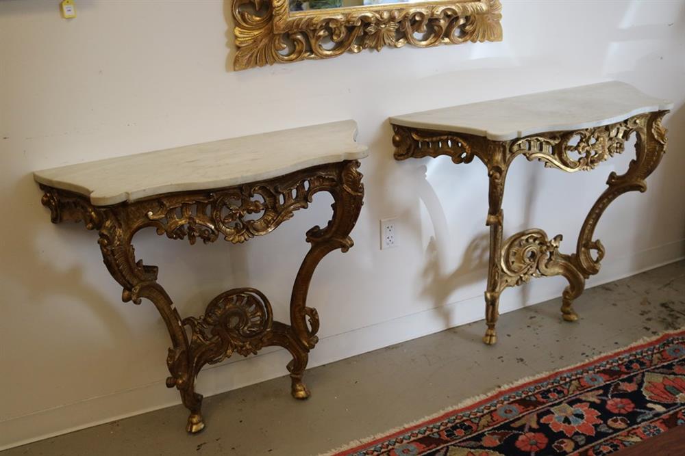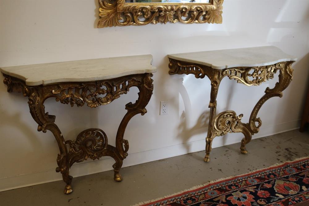 LOUIS XV GILTWOOD CONSOLE TABLE AND ANOTHER EN SUITE OF LATER DATE. Each with shaped, grey-veined white marble top above a waved, pierced frieze carved with C-scrolls and flowers; re-gilded. - H: 35 1/4". W: 38". D: 17 3/4". PROVENANCE:Estate of Baroness Marie-Christine Boulart-Deschamps, Washington, DC Estimate $3,000-4,000