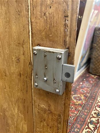 LOUIS XV PROVINCIAL FRUITWOOD CABINET WITH GRILLED DOORS. Flat molded pediment over pair grilled doors above pair paneled cabinet doors; three shaped interior shelves. H: 92 in.; W; 54 in.; at pediment, D; 21 in.Estimate $300-500