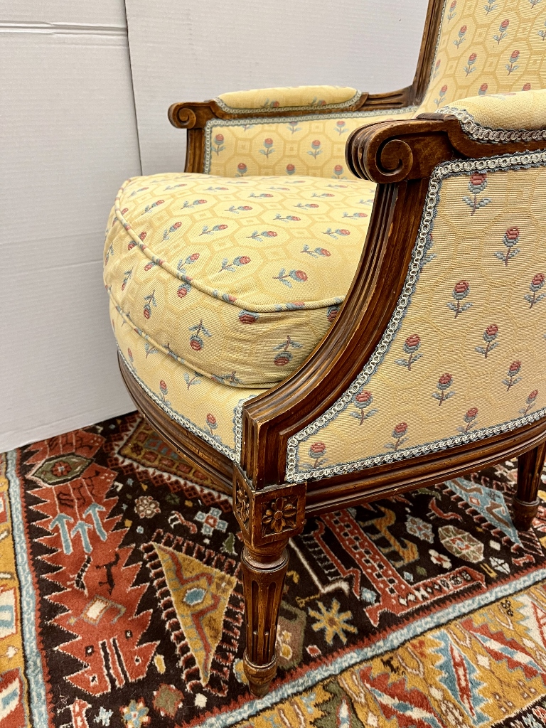 LOUIS XVI STYLE CARVED FRUITWOOD UPHOLSTERED BERGERE. Floral pattern upholstery with yellow ground.Estimate $150-250