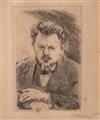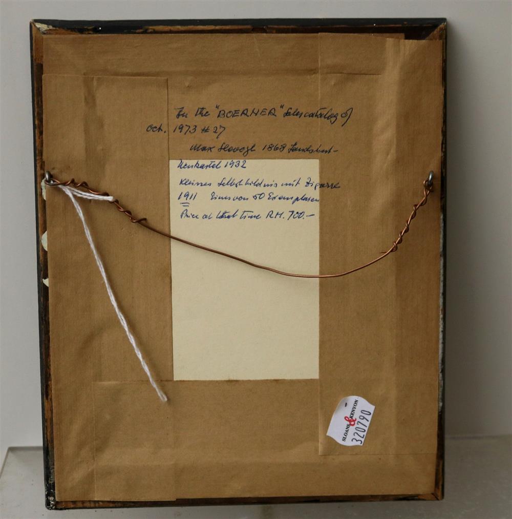 MAX SLEVOGT (German, 1868-1932). Small self-portrait with cigar. 1911, Etching on paper. Pencil signed lower right hand corner. Framed. Not examined out of frame. - Sight: 4 x 2.75 inches; frame: 8 x 6.75 inchesEstimate $100-150