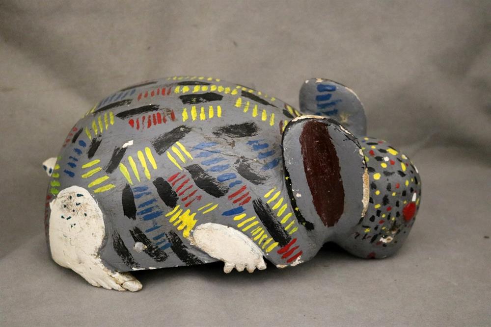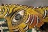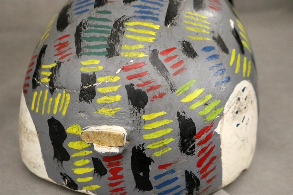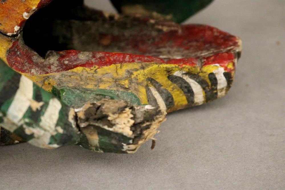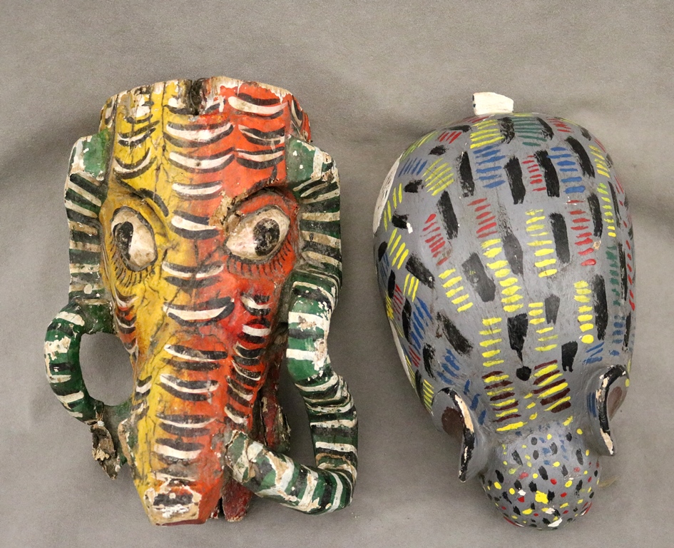 MEXICAN POLYCHROMED CARVED FESTIVAL MASKS. Set of 2 Mexican polychromed carved festival wooden masks used for festival or dances, specifically in the regions like Guerrero or Michoacan, known for their rich tradition of mask-making. - Height: 12 to 17 inches. Estimate $150-200