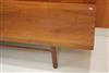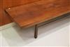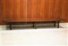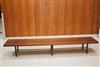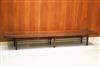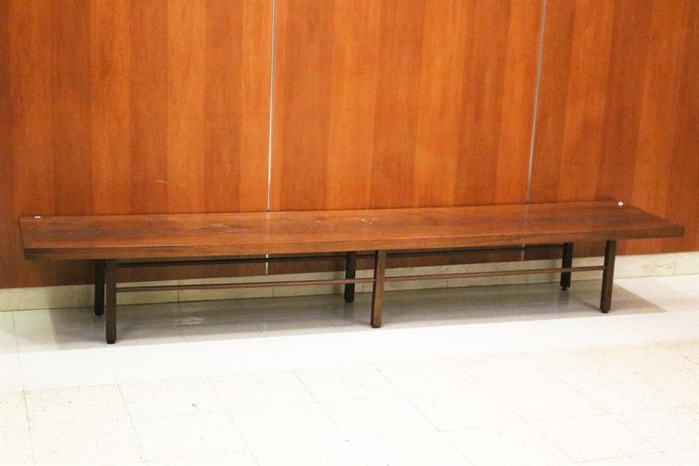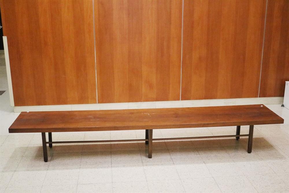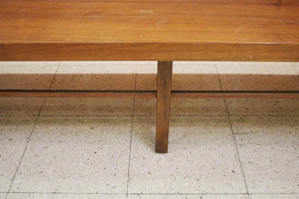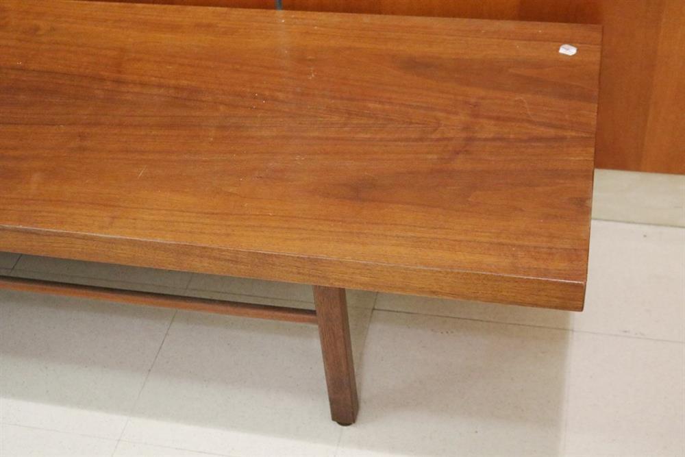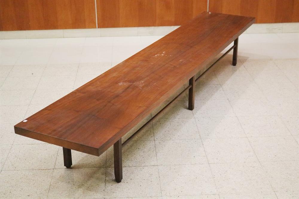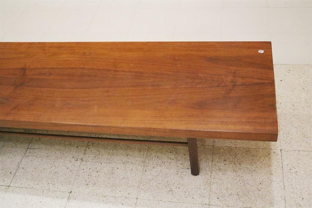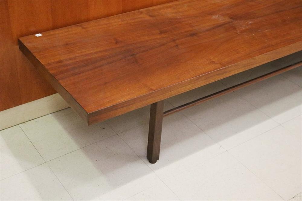 MID-CENTURY MODERN MILO BAUGHMAN FOR THAYER COGGIN WALNUT SLAB-TOP LOW RECTANGULAR TABLE. Six squared legs joined by rod stretchers. - H: 14 1/2 in. L: 106 in. W: 20 in.Estimate $200-300