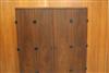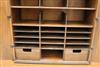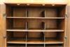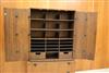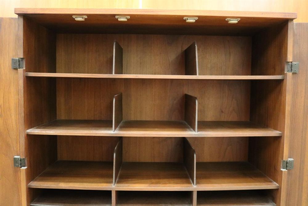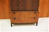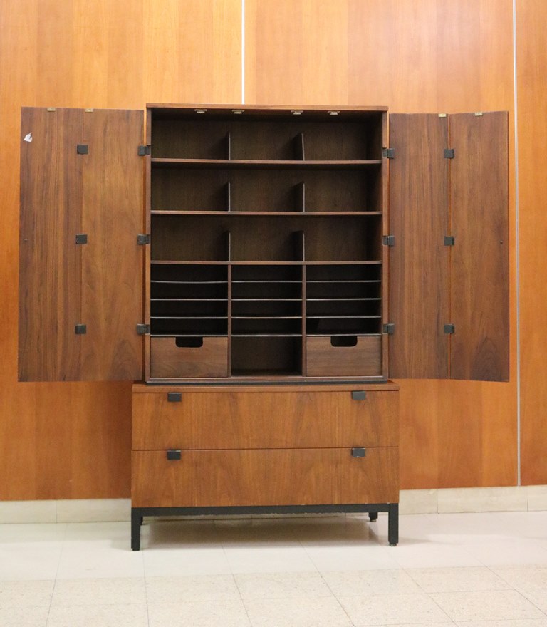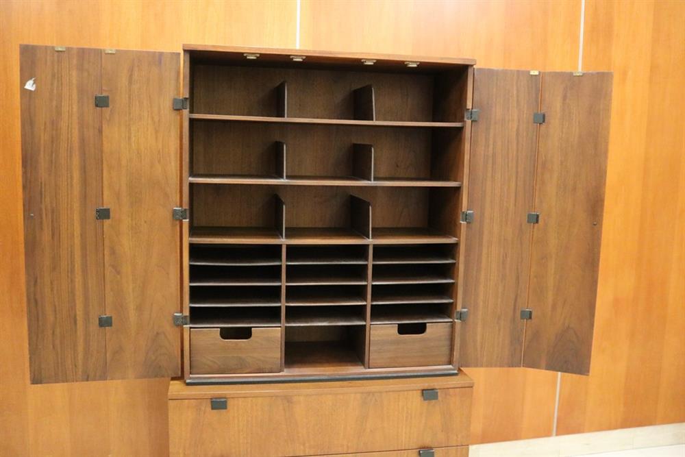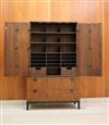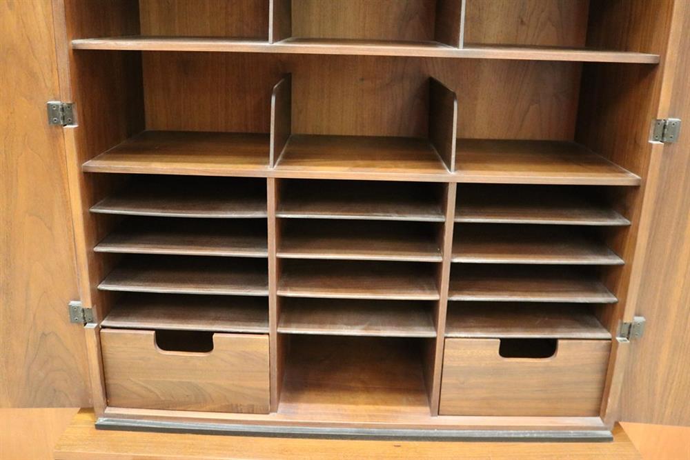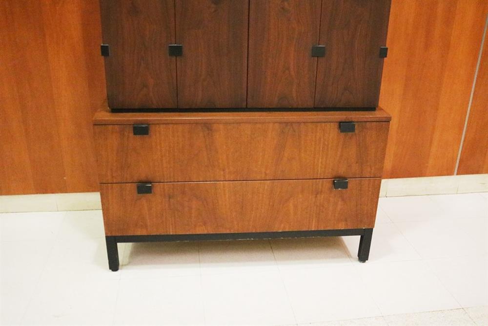 MID-CENTURY MODERN WALNUT GENTLEMEN'S CHEST / BUREAU BY MILO BAUGHMAN FOR DIRECTIONAL. In two parts. Upper section has pair two-panel hinged doors opening to arrangement of divided shelves and drawers; lower section has two full-width drawers; ebonized geometric mounts and pulls - H: 66 in. W: 40 in. D: 18 in. Estimate $1,000-2,000