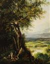MOSES WEBSTER (English, 1792 - 1870). An Artist Sketching Plein Air while at the Scottish Highlands, 1865, Oil on canvas. Signed and dated "Moses Webster 1865" lower right. Framed. - Sight: 39 x 54.25 inches; Estimate $4,000-5,600 ARTIST PROFILE: Painter of porcelain who replaced William Billingsley at the Derby Porcelain factory. Like Billingsley, Webster specialised in painting flowers. In the second decade of the nineteenth century Webster moved to the Nantgarw pottery, which was established by Billingsley in 1813. He later wroked as a watercolourist.