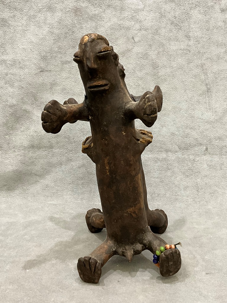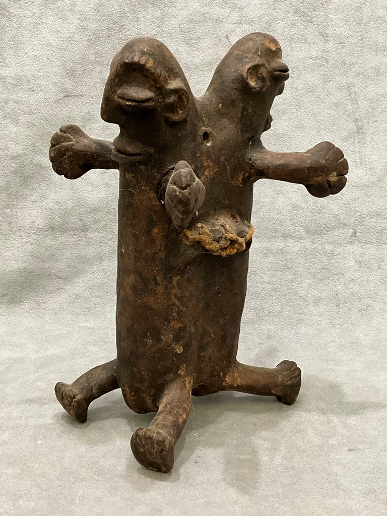NIGERIAN MBUTI PEOPLES MAMBILA JANUS DUAL-FACED FIGURE. Patinated dual faced figure. In various African cultures, the Janus motif, often depicted as dual-faced figures, holds deep cultural significance, representing dualities like past and future, life and death, or the spiritual and physical worlds. - Height approximately: 10.5 inches. Estimate $90-120