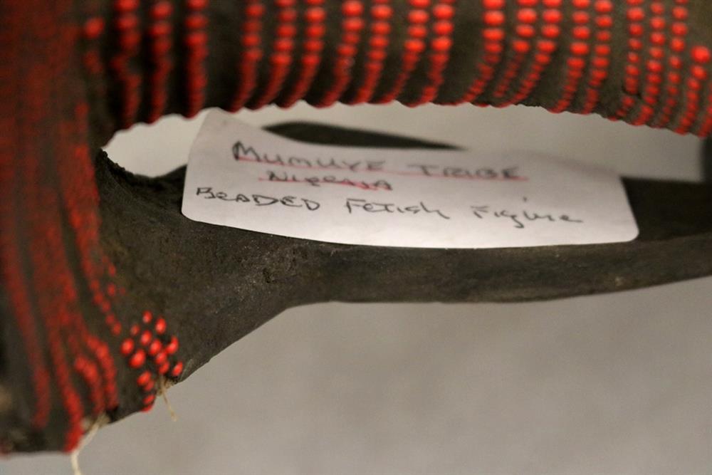 NIGERIAN MUMUYE PEOPLE IAGALAGANA FIGURE. A Mumuye figure is a type of sculpture created by the Mumuye people of northeastern Nigeria. These figures, known as Iagalagana, are traditionally used as representations of tutelary spirits. They are characterized by elongated features, particularly the earlobes, which are often stretched due to the Mumuye custom of inserting discs. The figure is adorned with beads and shells, which are typical embellishments found on Mumuye sculptures. - Height: 22 inches. Estimate $110-150