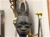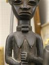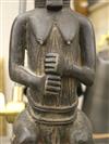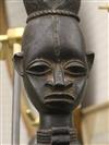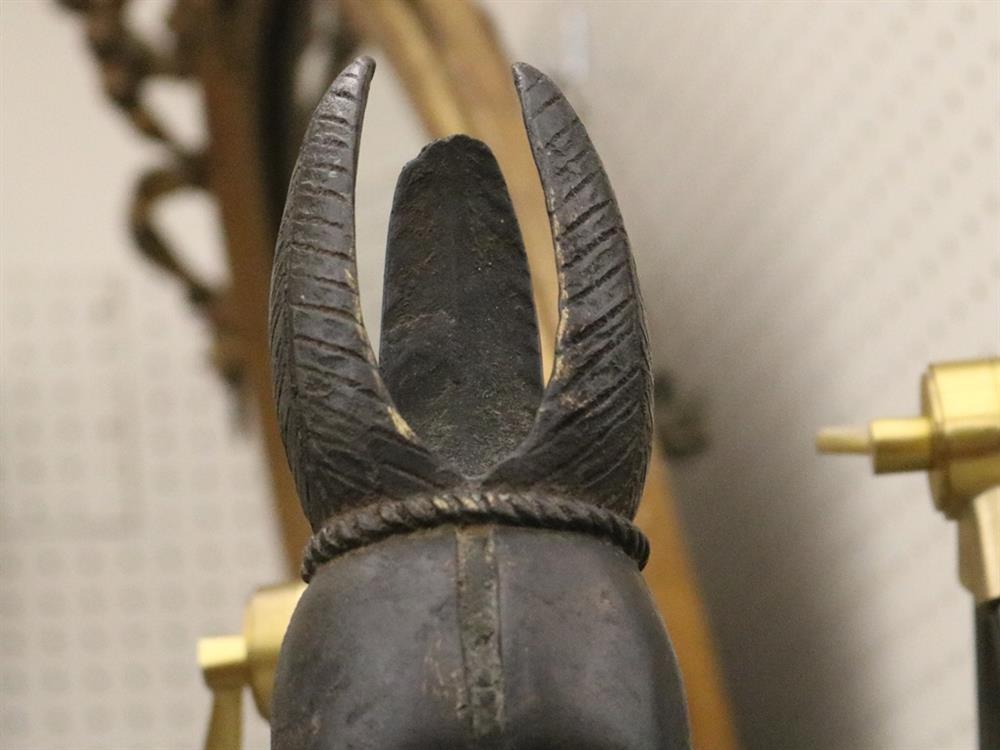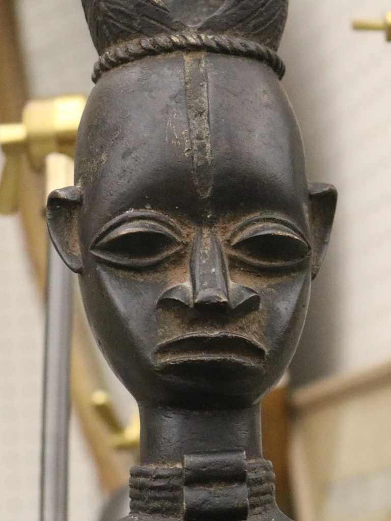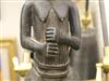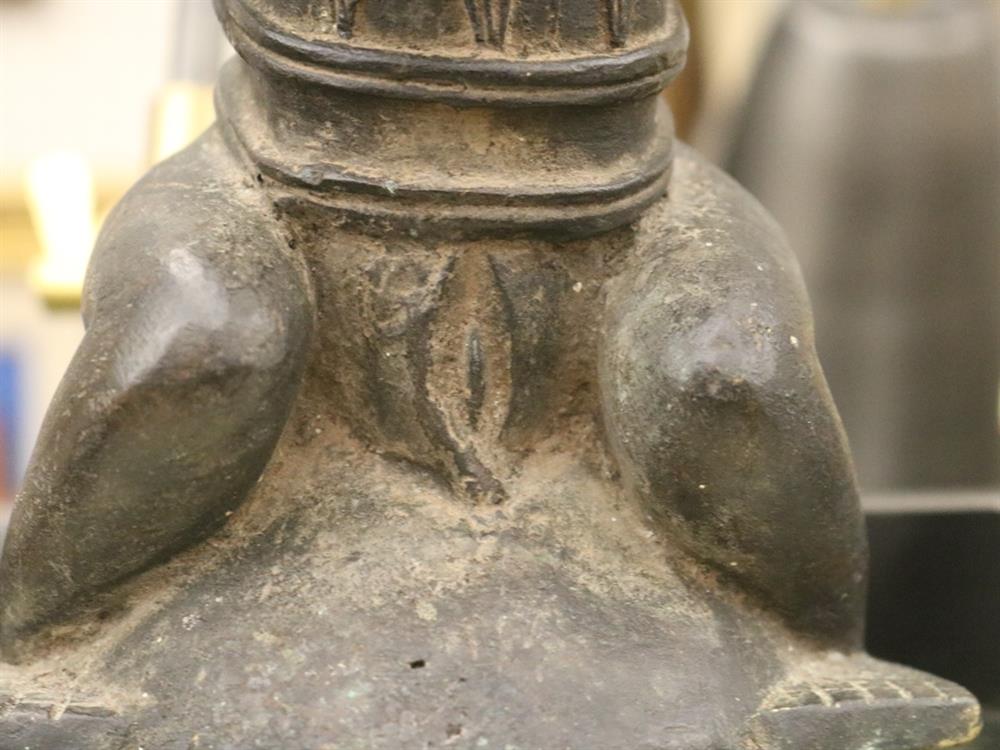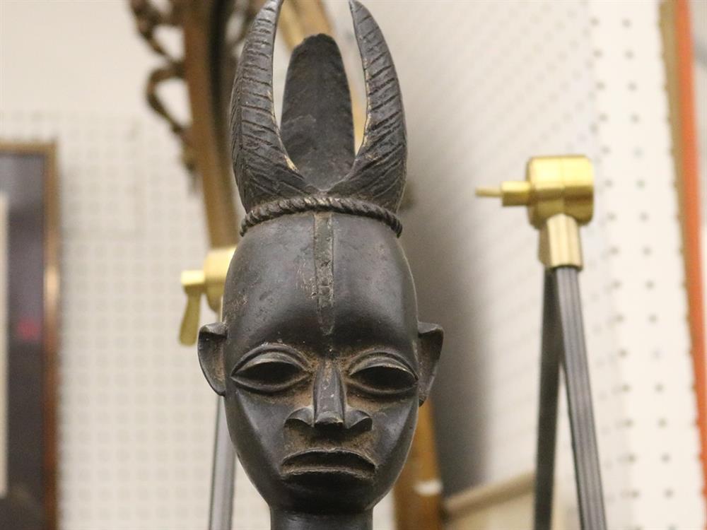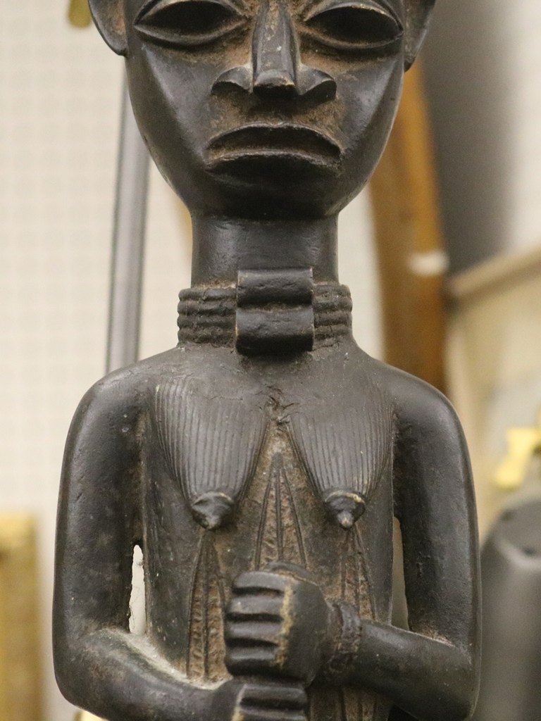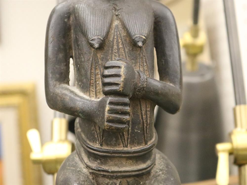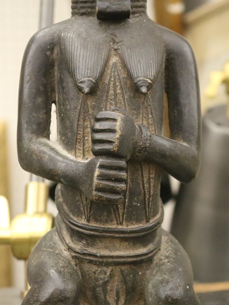 NIGERIAN YORUBA FEMALE OGBONI SHRINE FIGURE/EARTH SPIRIT, IJEBU OR OWU REGION. Patinated bronze (or a copper alloy) Nigerian Yoruba female Ogboni shrine figure which are associated with the Ogboni (or Ogboni) society, a fraternal institution among the Yoruba people of Nigeria, Benin, and Togo. The figure is seated with bent legs and feet on the ground. The hands are clenched in the "Ogboni clasp," a significant gesture indicating membership, secrecy, and fidelity. The figure has scarification marks on the torso, nipples, back, shoulders, and arms, and wears a wide niched waist band and a broad collar. It has an exaggerated nose, bulging eyes, and cupped ears. The figure wears a three-pointed crown-like headdress with a herringbone incised pattern. These figures are used by Ogboni Cult members as symbols of membership and are believed to represent the god Edan in physical form. They are also used in Ogboni sanctuaries, where larger figures may be present. The Ogboni society plays a significant role in Yoruba society, with the figures serving as important religious and political symbols. NOTE: There is a hand-written note at the base of the statue confirming its acquisition from the dealer Julius Hirsch Carlebach who owned the Carlebach Gallery (also known as the Julius Carlebach Gallery) in New York City. - Height: 18.5 inches. Estimate $1,500-2,500