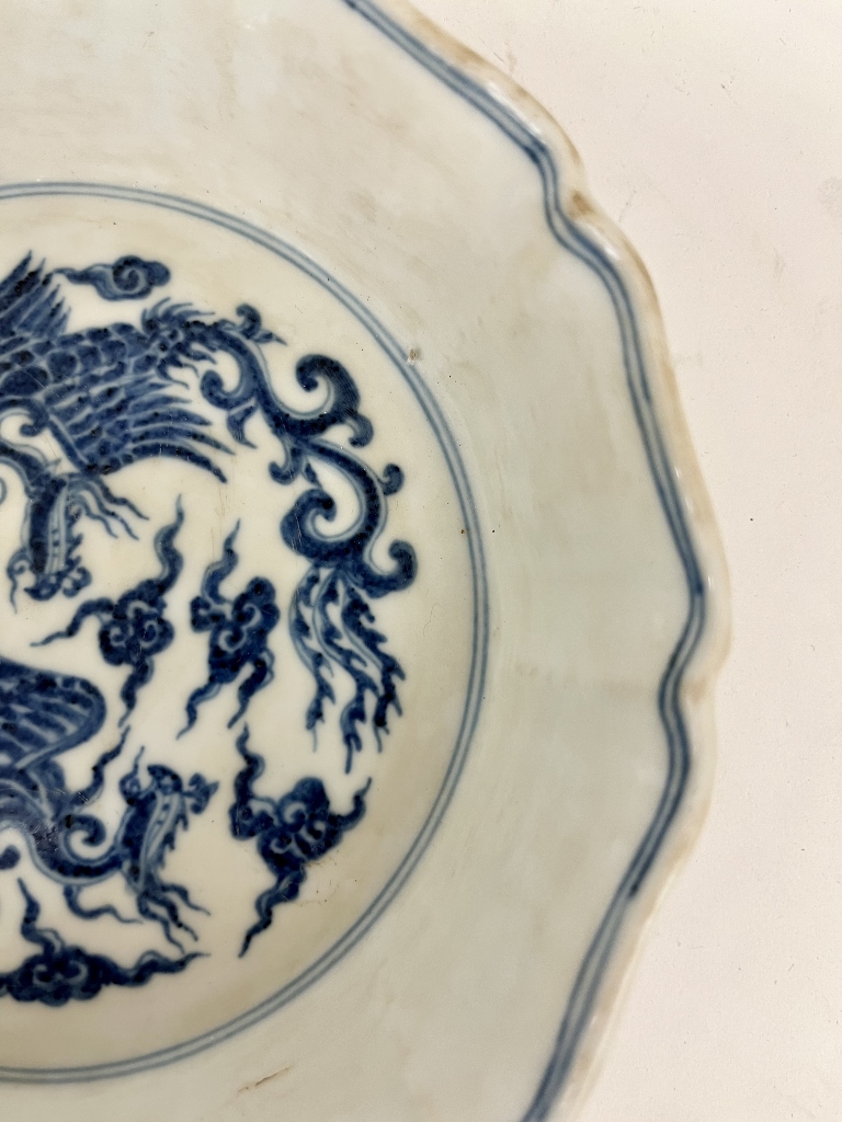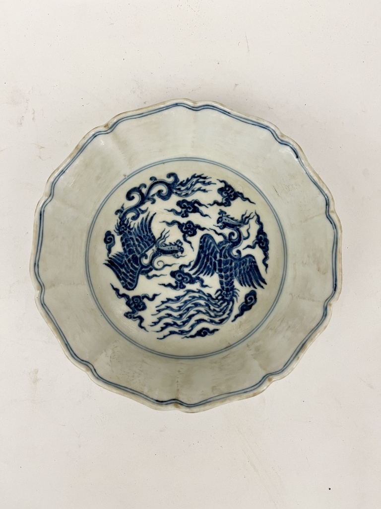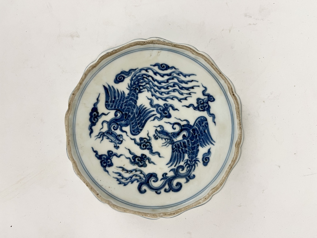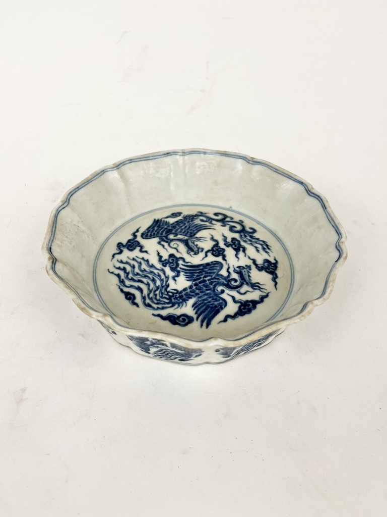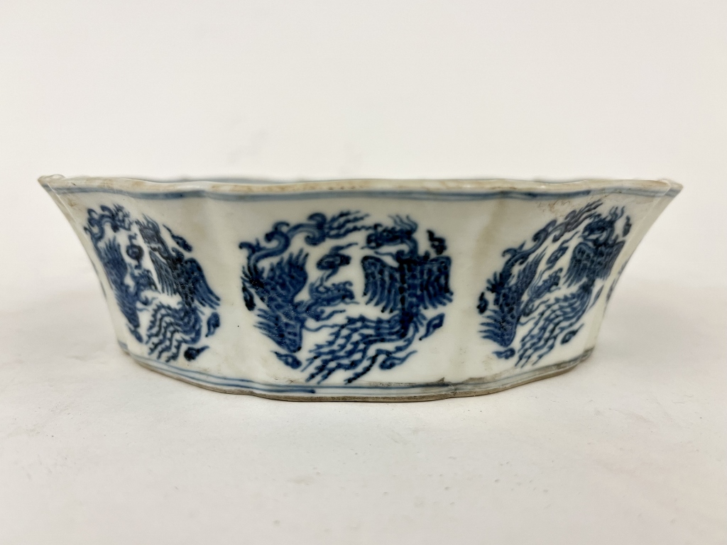 PAIR CHINESE BLUE AND WHITE PORCELAIN WASHERS. Flaring circular vessel with serpentine edge outline; interior, exterior and base decorated with mythical birds. - D: 7".Estimate $200-300