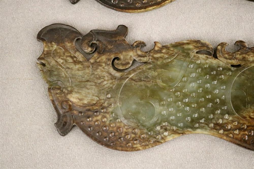 PAIR CHINESE EASTERN ZHOU JADE TIGER PENDANTS. Patinated and incised pair of green and russet jade pendants in the shape of tigers; Eastern Zhou period. Lengths: 19.5 cm, 7 7/16 inches; Reference: Jessica Rawson "Chinese Jades from the Neolithic to the Qing" p. 262, fig. 9. Lot is presented in a fitted box. Note: The Eastern Zhou[a] (c.?771 - 256 BCE) is a period in Chinese history comprising the latter half of the Zhou dynasty, following the Zhou royal court's relocation eastward to Chengzhou, near present-day Luoyang.