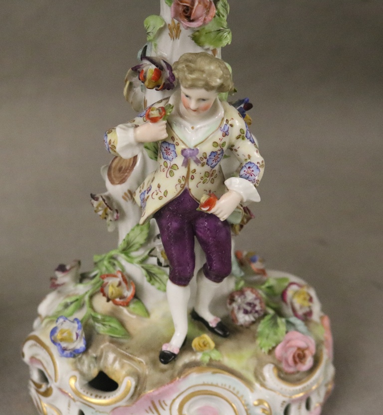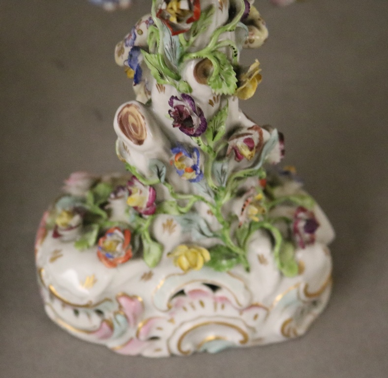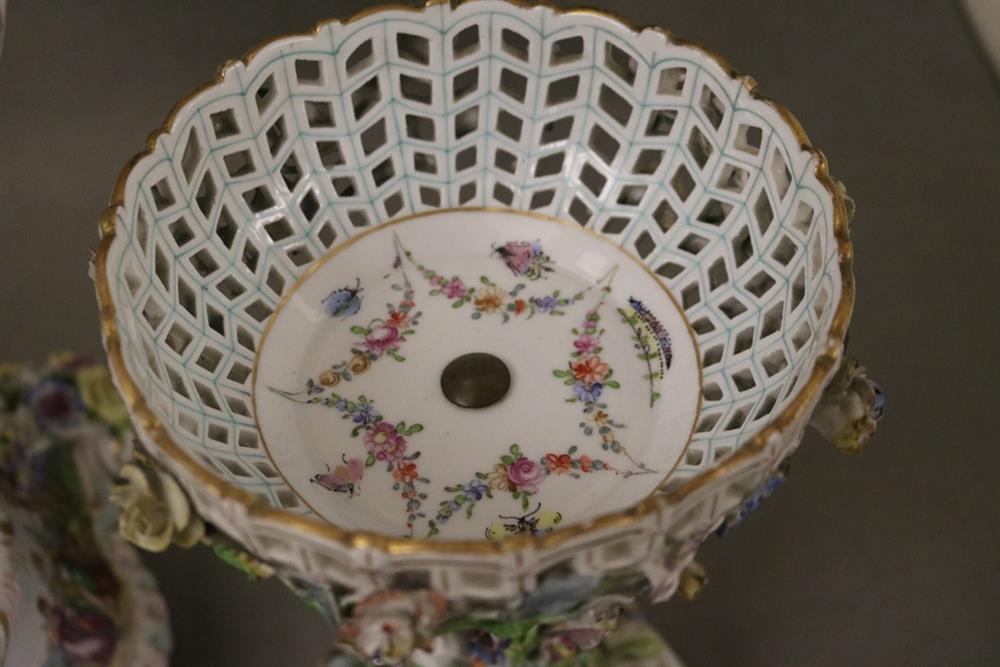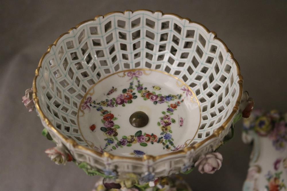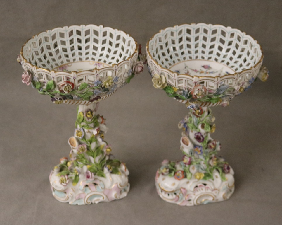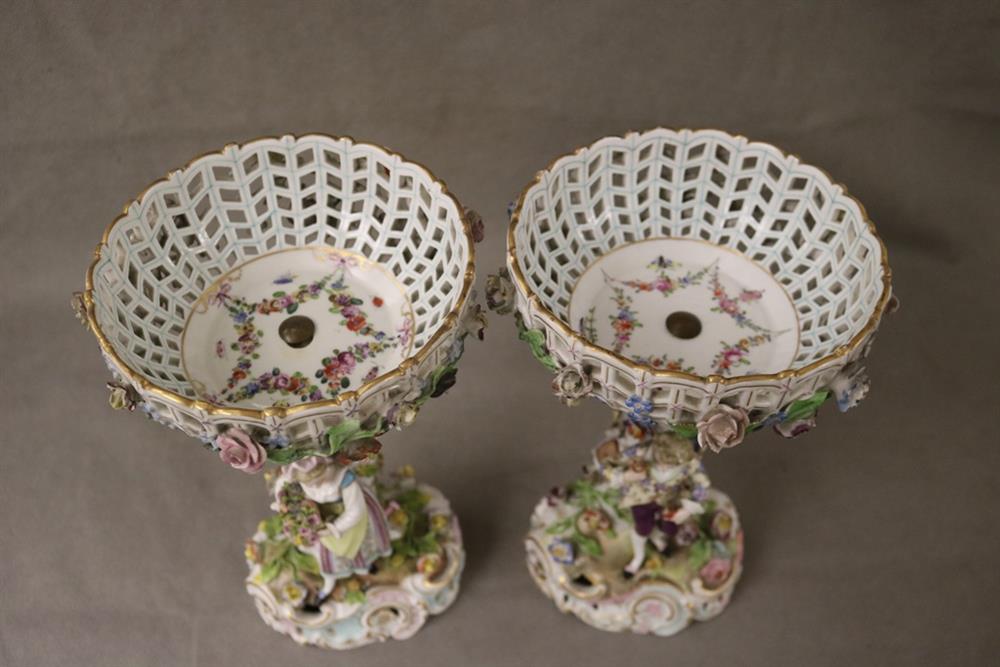 PAIR DRESDEN (CARL THIEME) POLYCHROMED PORCELAIN FIGURAL COMPOTES. Applied fully sculpted blossom decoration; floral sprays - Compote, H: 10 3/8 in.Estimate $300-400