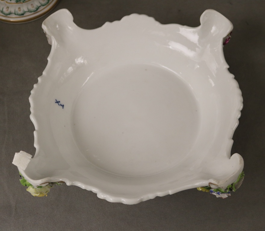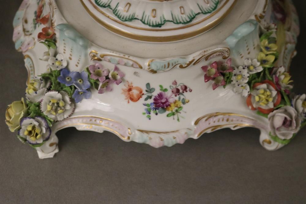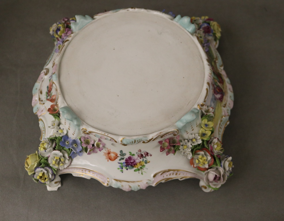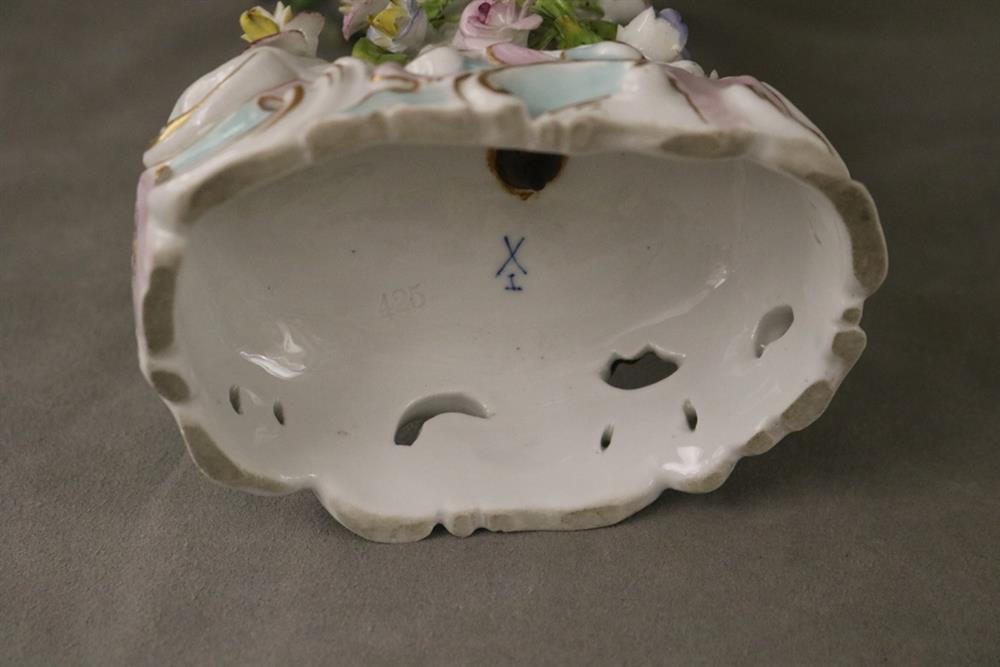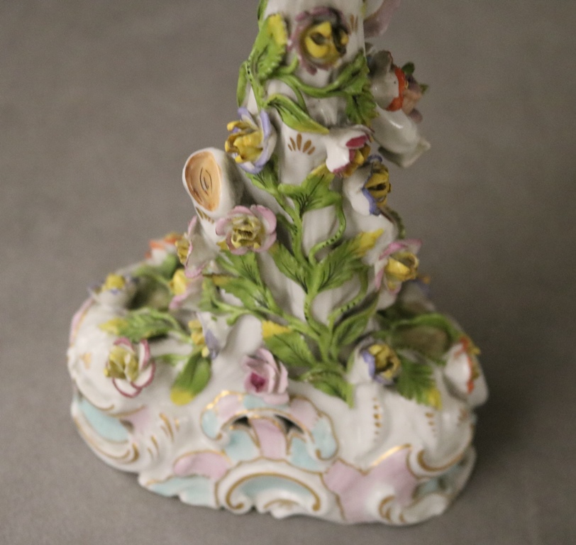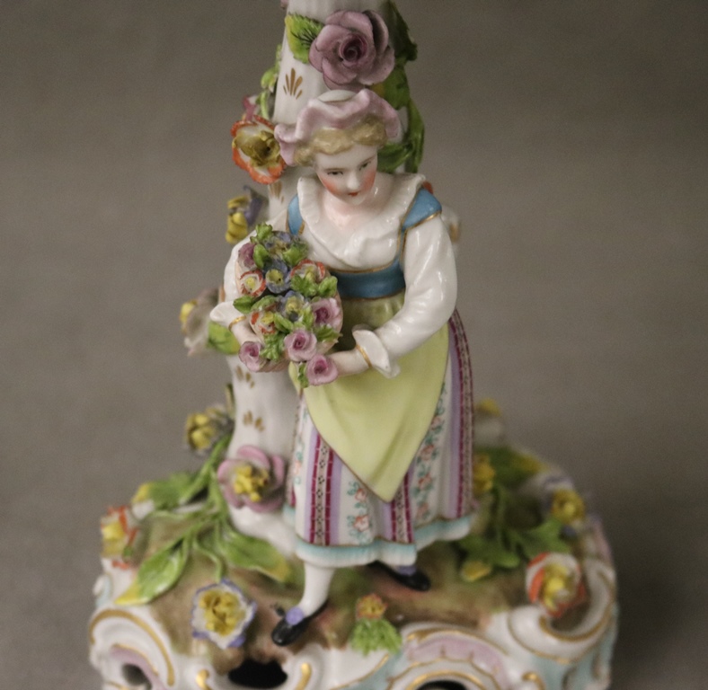 PAIR DRESDEN (CARL THIEME) POLYCHROMED PORCELAIN FIGURAL COMPOTES. Applied fully sculpted blossom decoration; floral sprays - Compote, H: 10 3/8 in.Estimate $300-400