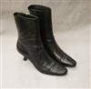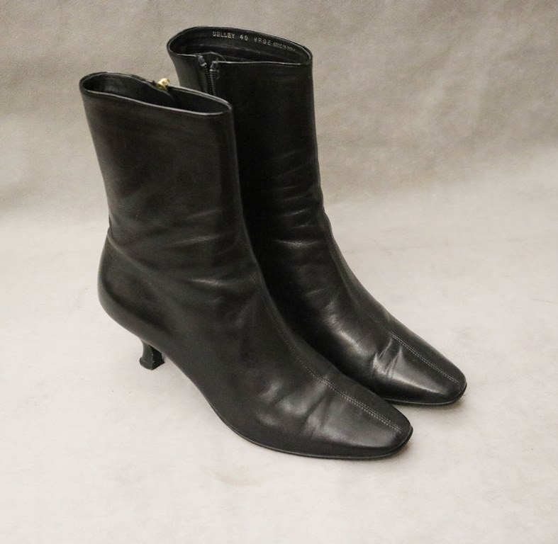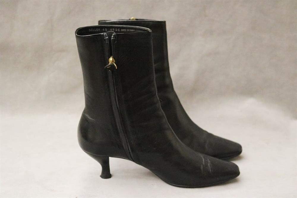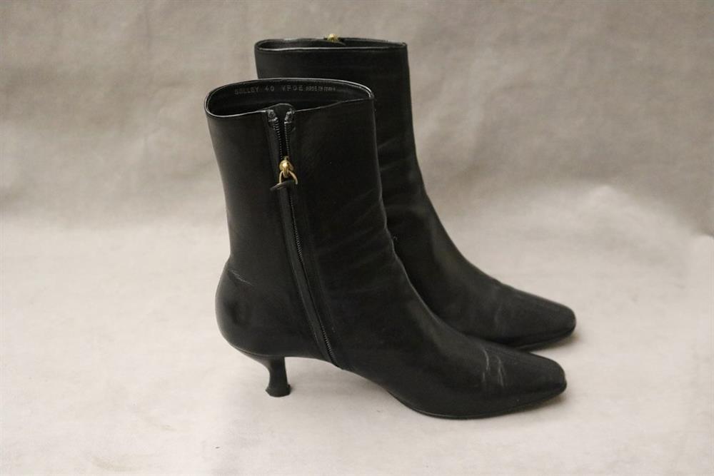 PAIR LADY'S BALLY BLACK LEATHER ANKLE BOOTS WITH KITTEN HEEL. Zipper opening at side. Gently worn. With original box.Estimate $75-125