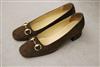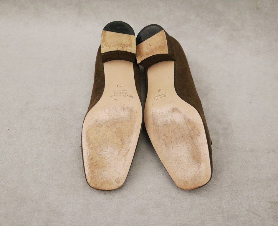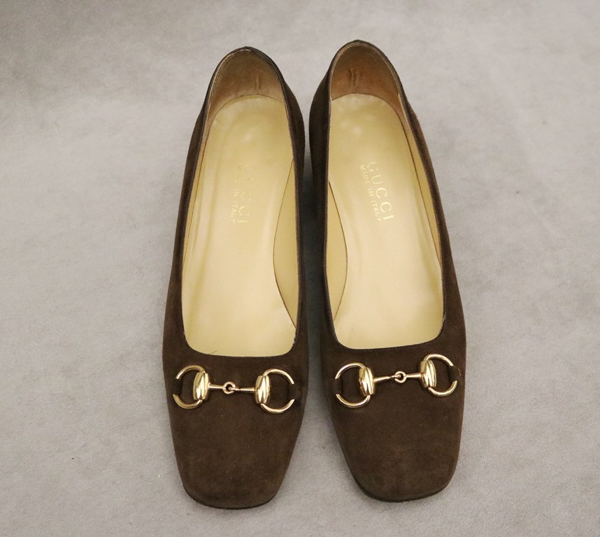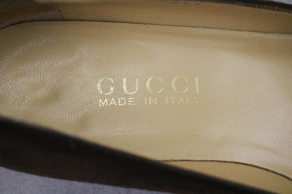 PAIR LADY'S BROWN SUEDE GUCCI LOAFERS WITH GOLD-TONE HORSEBIT, SIZE 9B. Two storage bags. Gently worn.Estimate $100-200