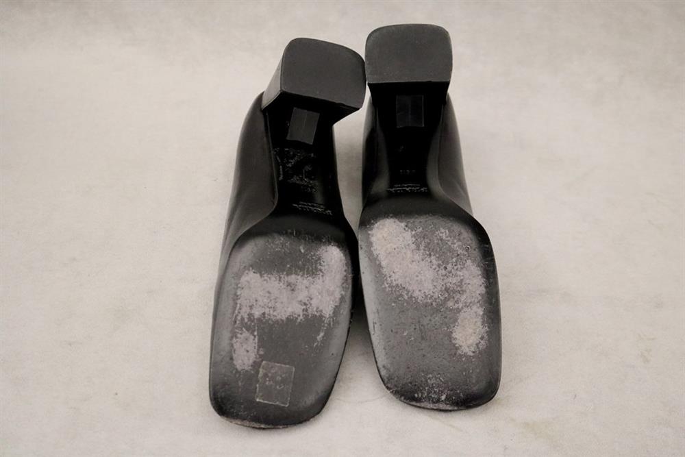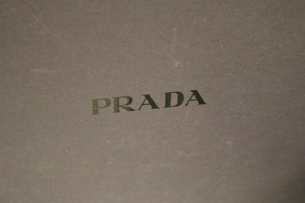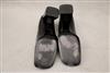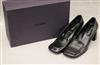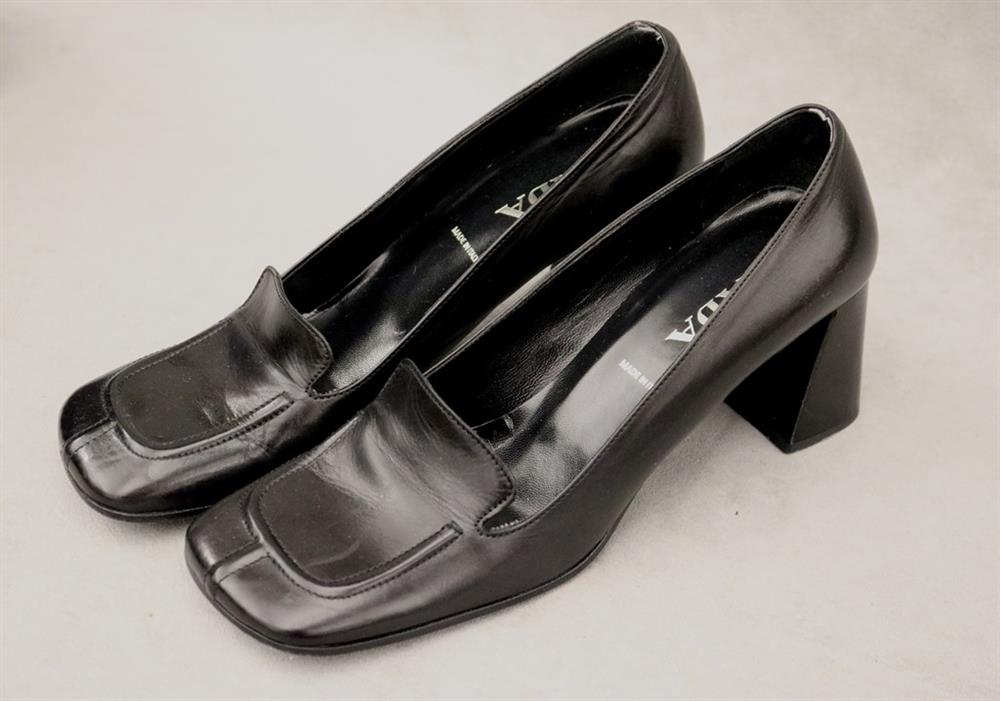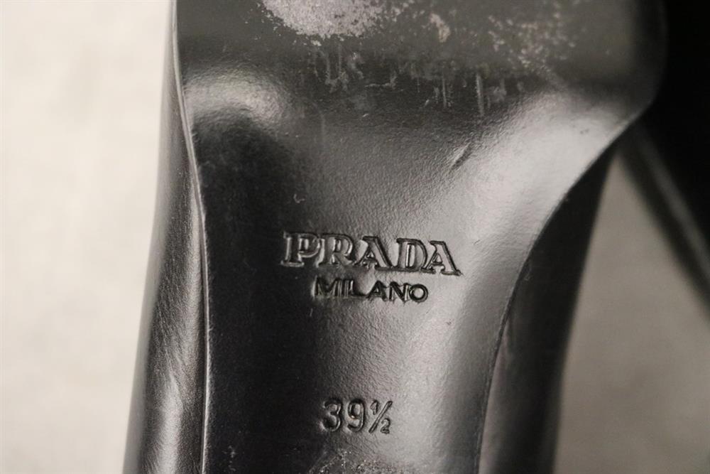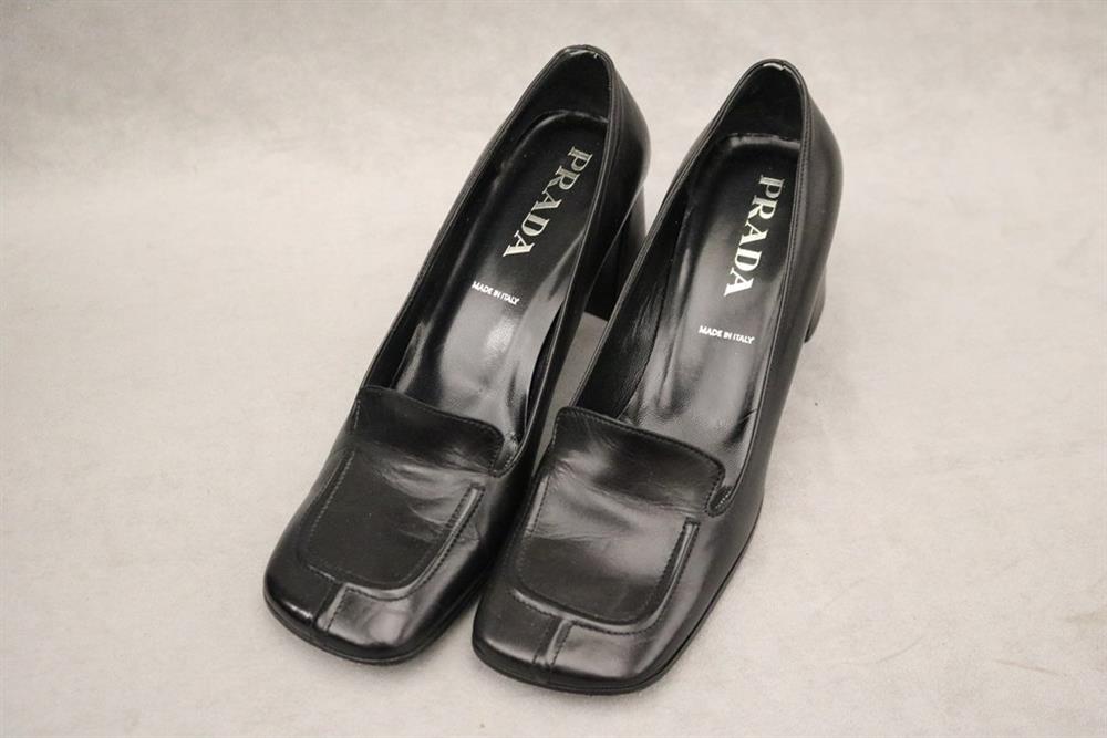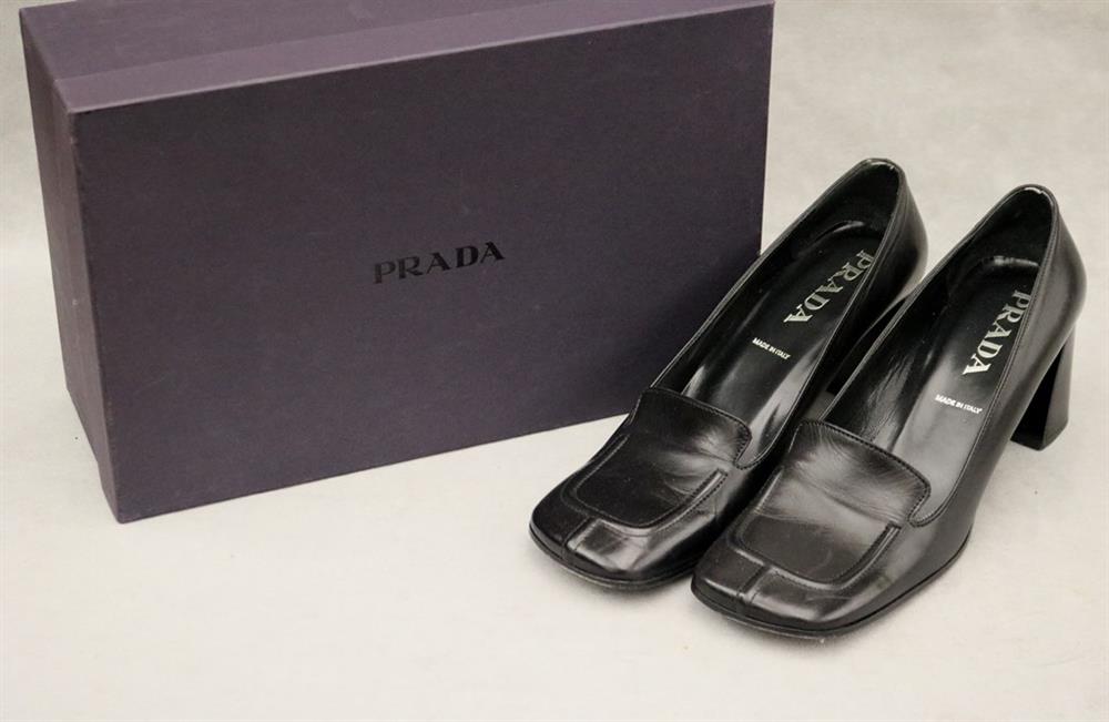 PAIR LADY'S PRADA BLACK LEATHER SQUARE-TOED PUMPS, SIZE 39 1/2. With original box. Gently worhEstimate $100-200