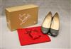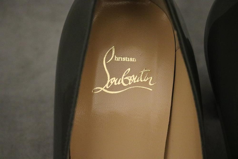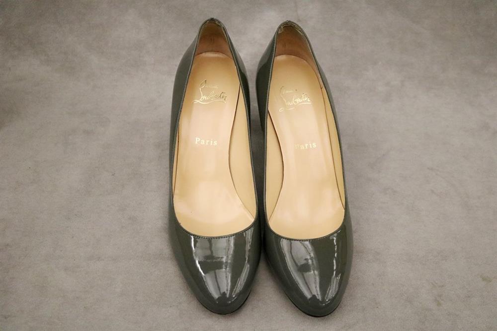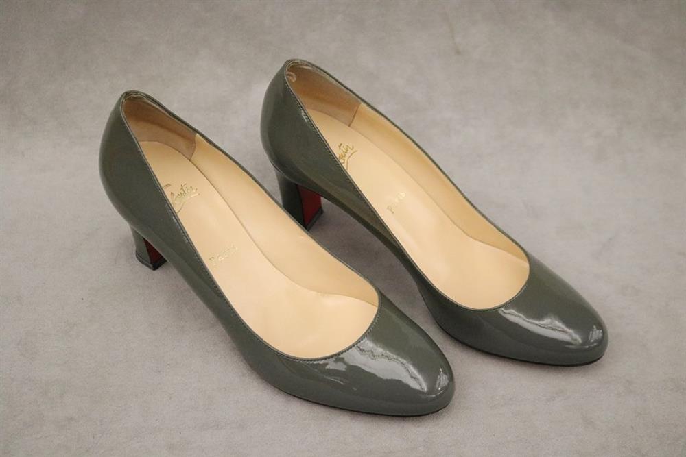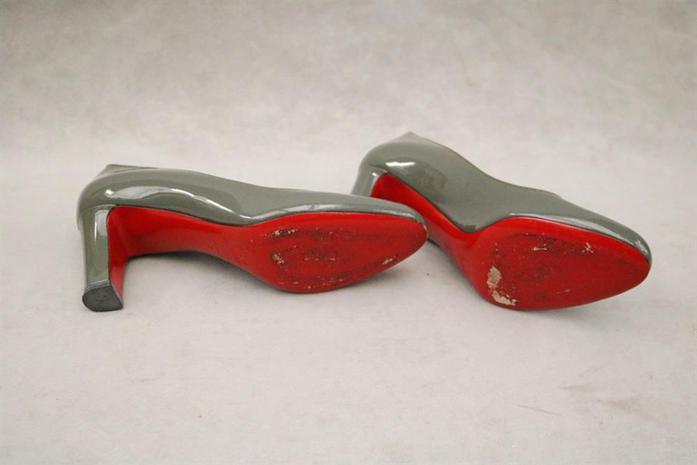 PAIR LADY'S CHRISTIAN LOUBOUTIN GRAY PATENT LEATHER "MYSTICA" PUMPS, SIZE 40. In original box; with storage bag.Estimate $100-150