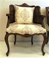 PAIR LOUIS XV STYLE FRUITWOOD DOUBLE-CANED, BARREL BACK ARM CHAIRS. Carved and molded frames; designer cream color embroidered twill upholstered shaped seats with double cording and matching square loose pillows.Estimate $300-400