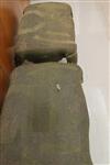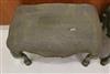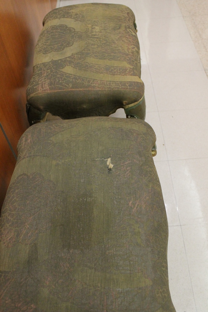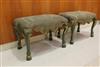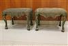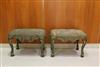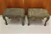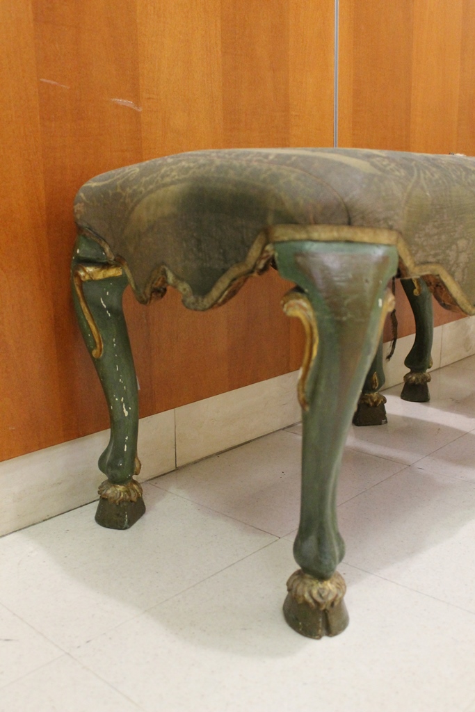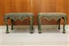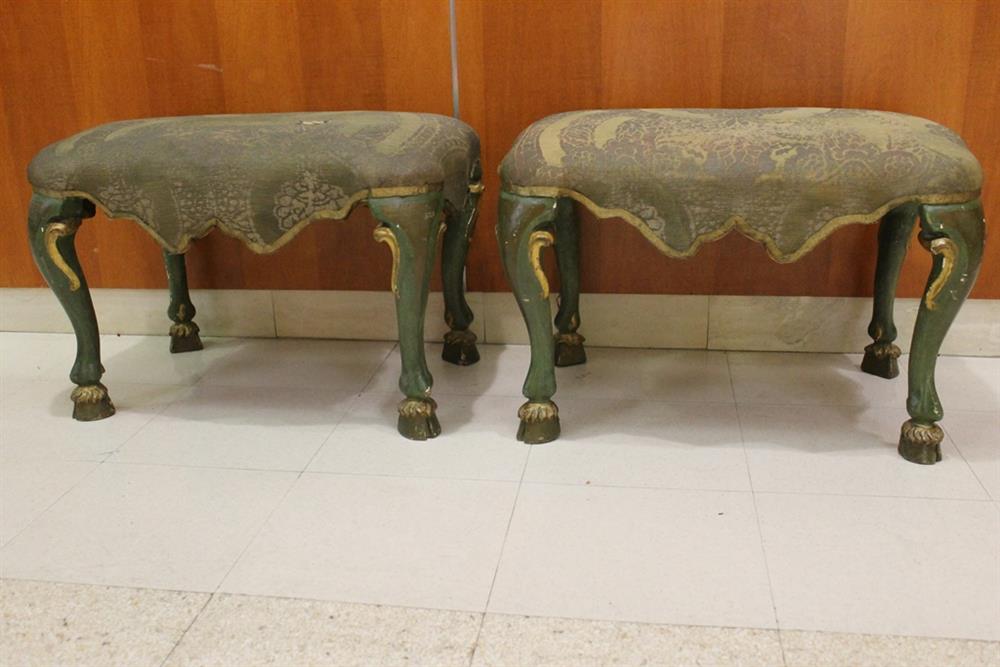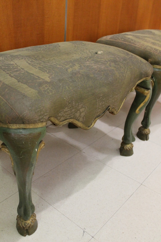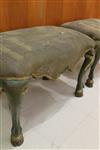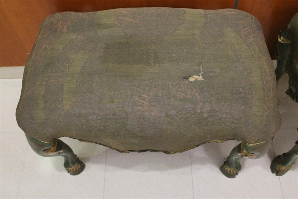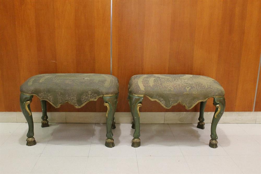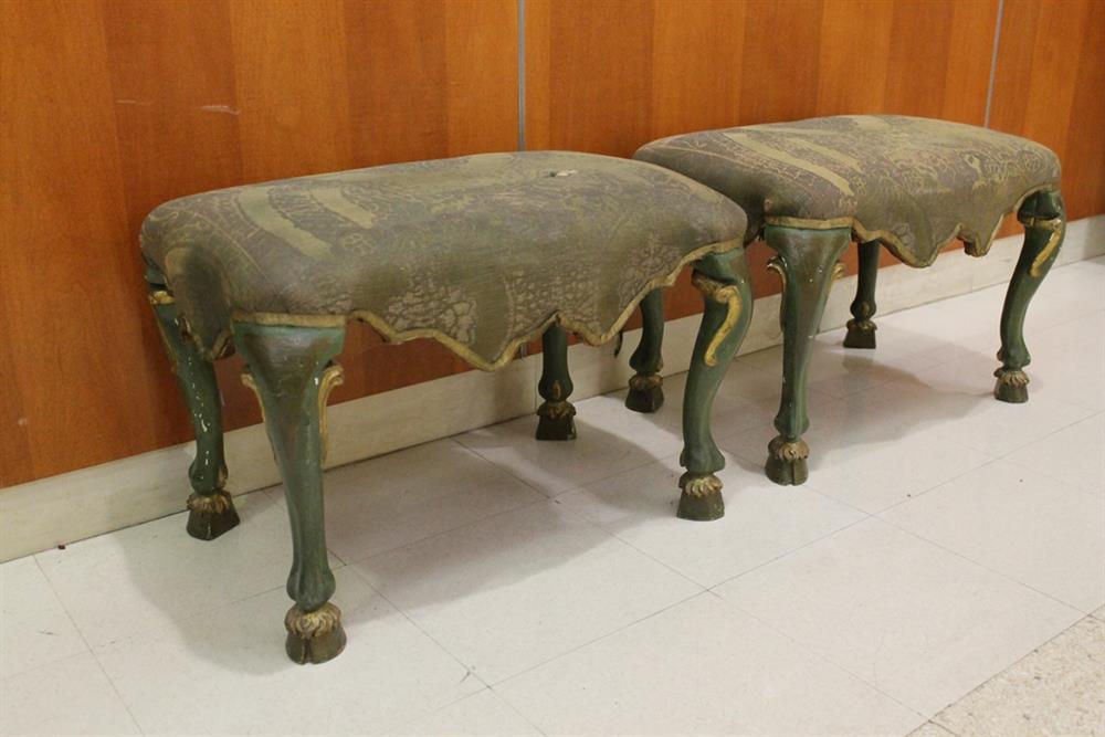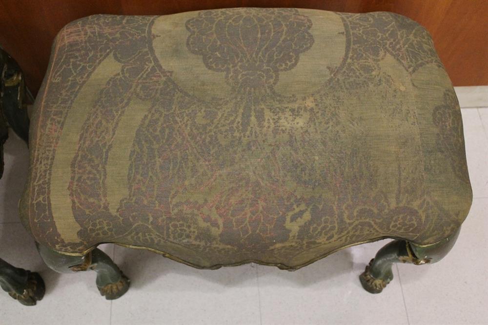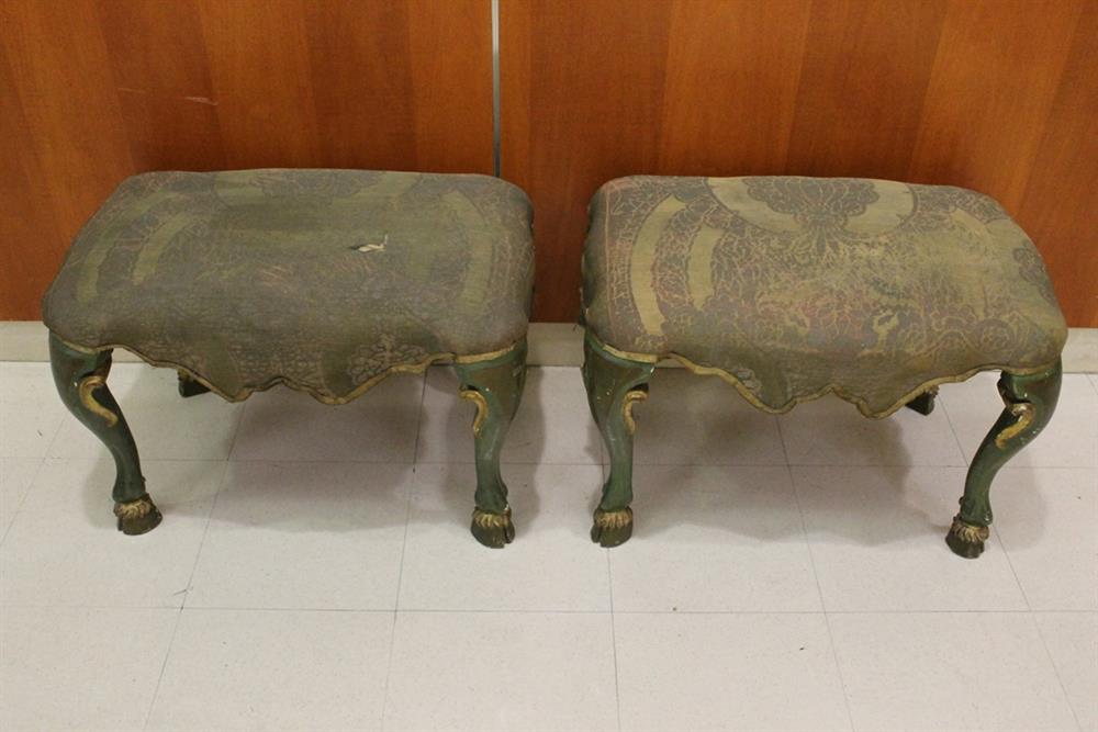 PAIR MID-18TH CENTURY TUSCAN GREEN PAINTED AND PARCEL-GILT UPHOLSTERED STOOLS. Shaped rectangular tops; waved aprons; pieds-de-biche. - H: 17 1/2". W: 26". D: 16". PROVENANCE:Estate of Baroness Marie-Christine Boulart-Deschamps, Washington, DC Estimate $1,500-2,000