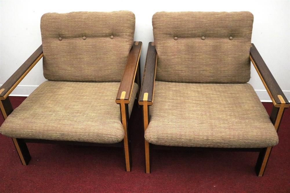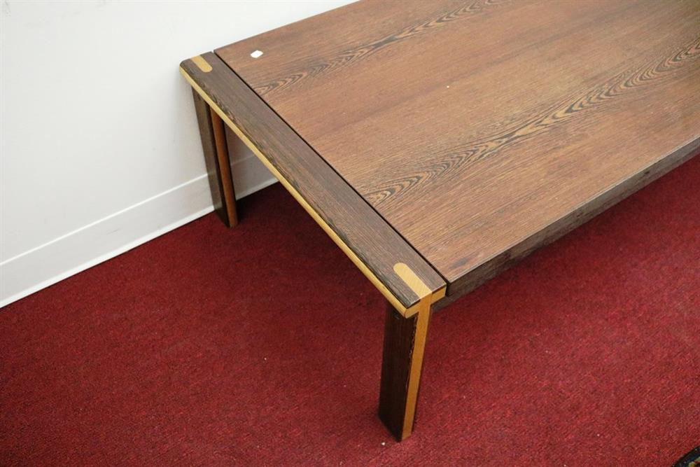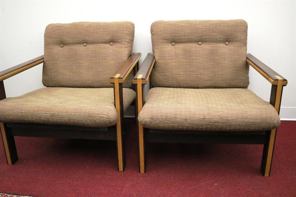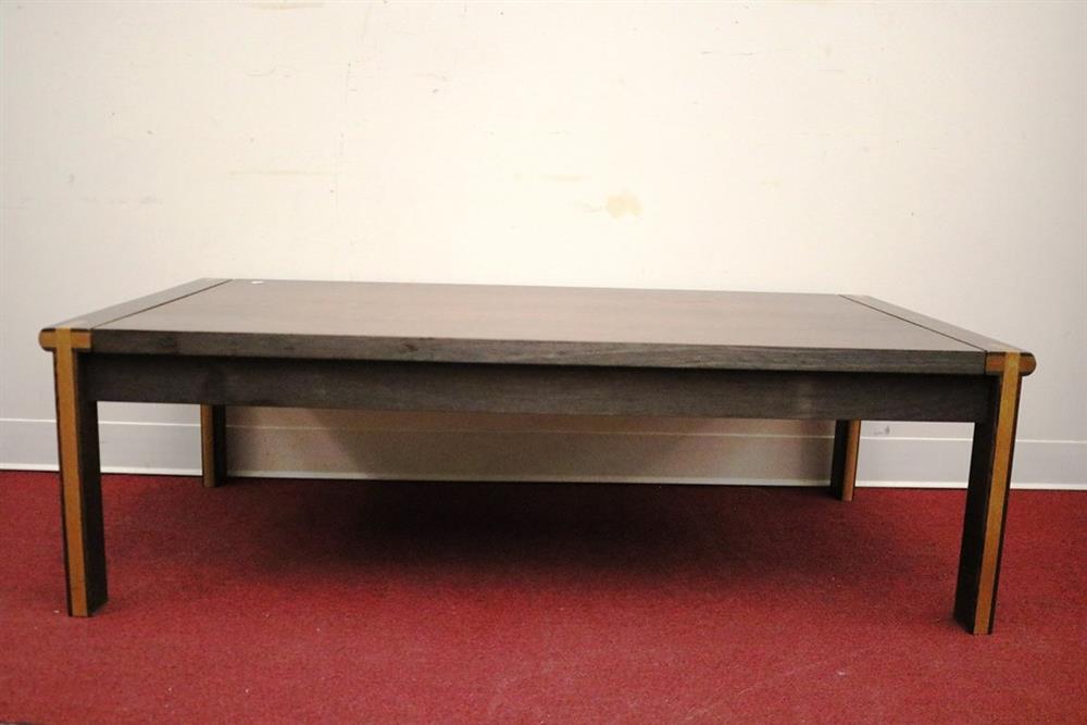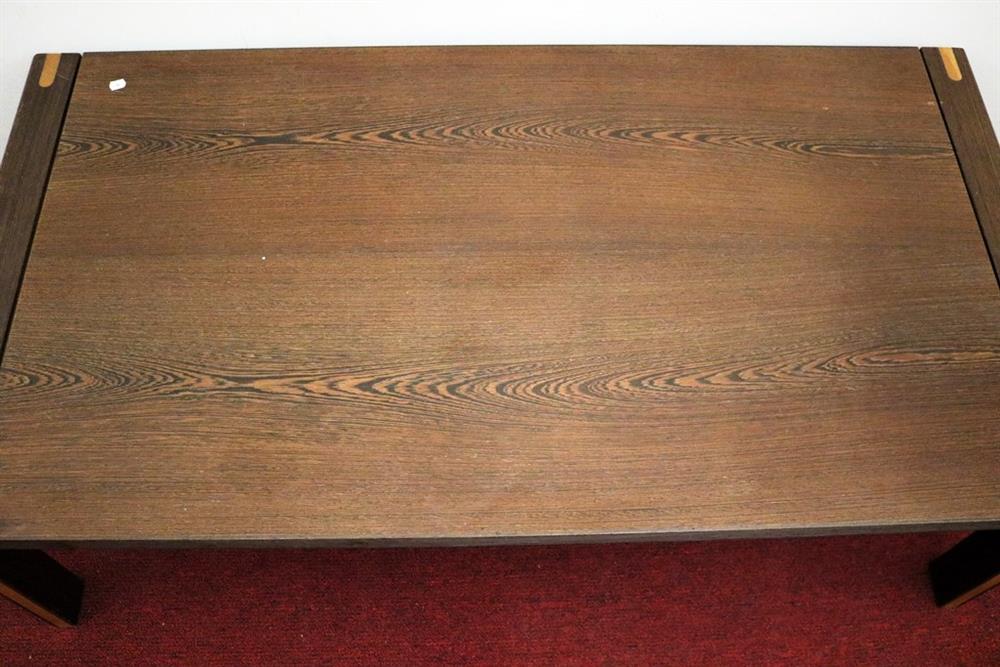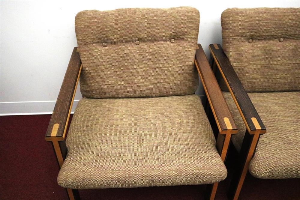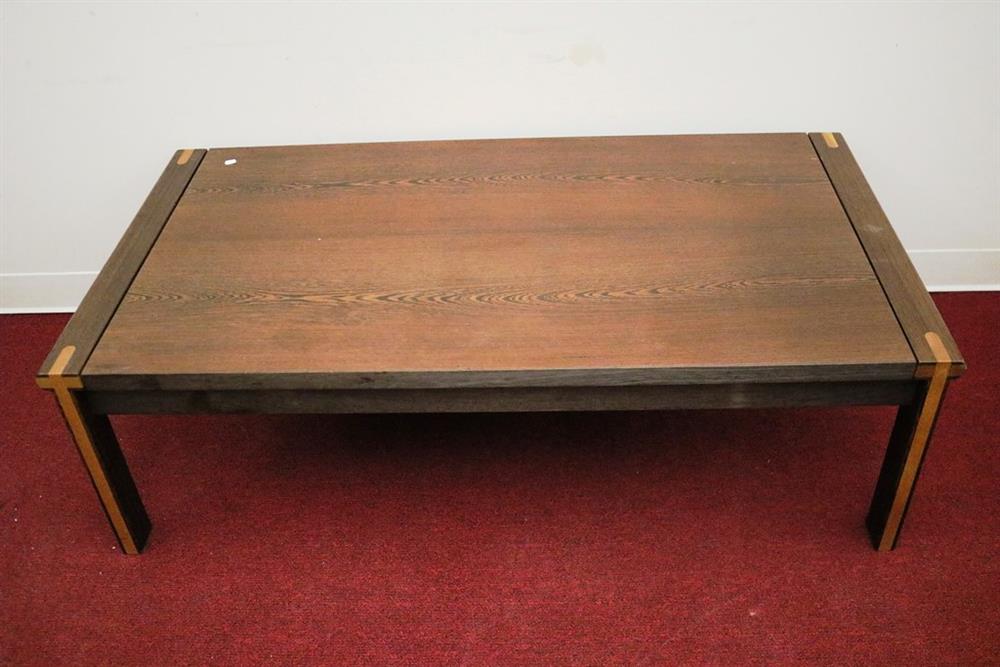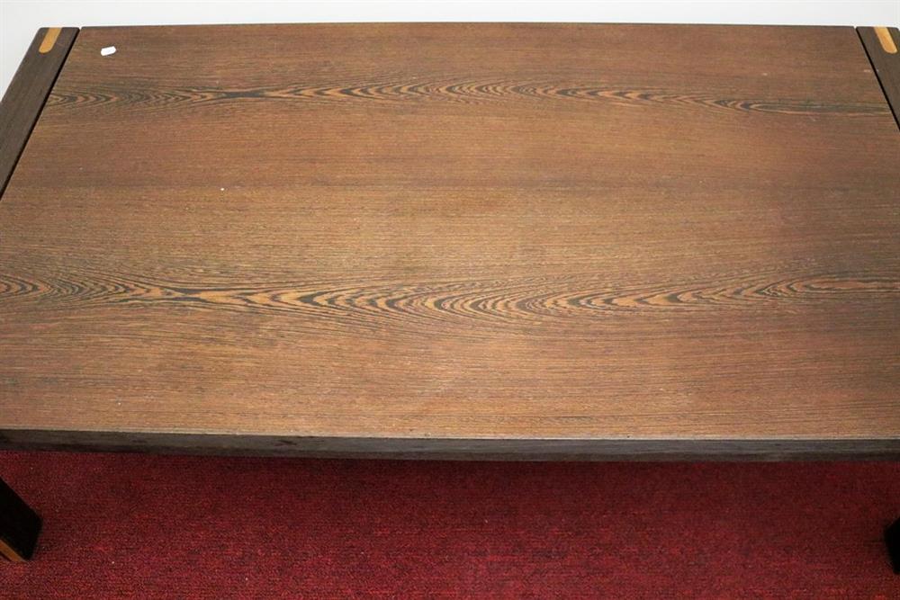 PAIR MID CENTURY MODERN INLAID MIXED WOOD OPEN-ARMCHAIRS WITH MATCHING RECTANGULAR-TOP COFFEE TABLE. Table has banded ends with rectangular block legs. - Table, H: 15 3/4 in,; Top, 15 3/8 in. x 26 7/8 in.
