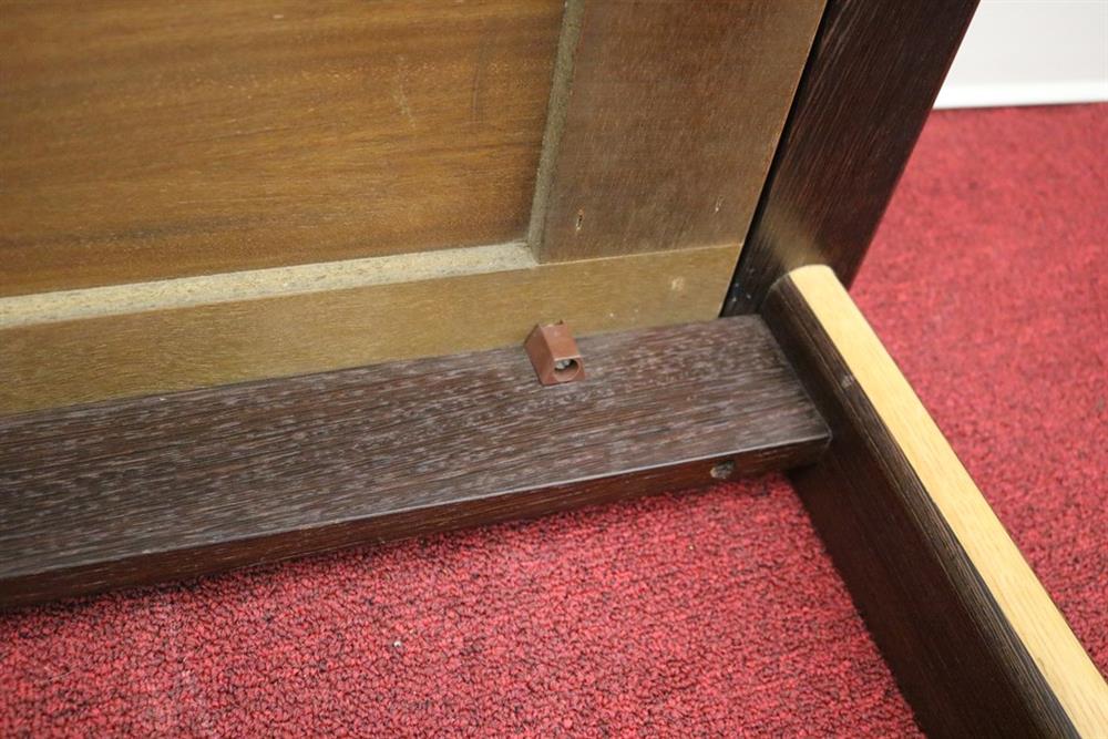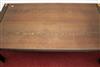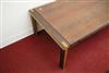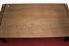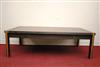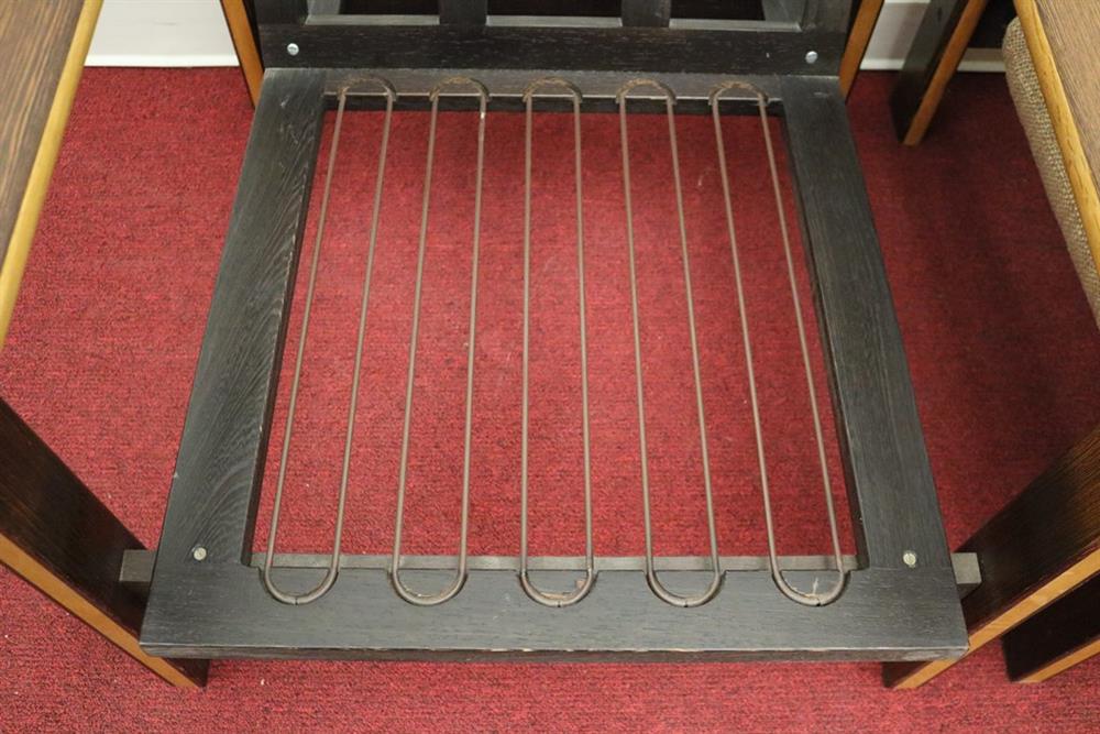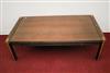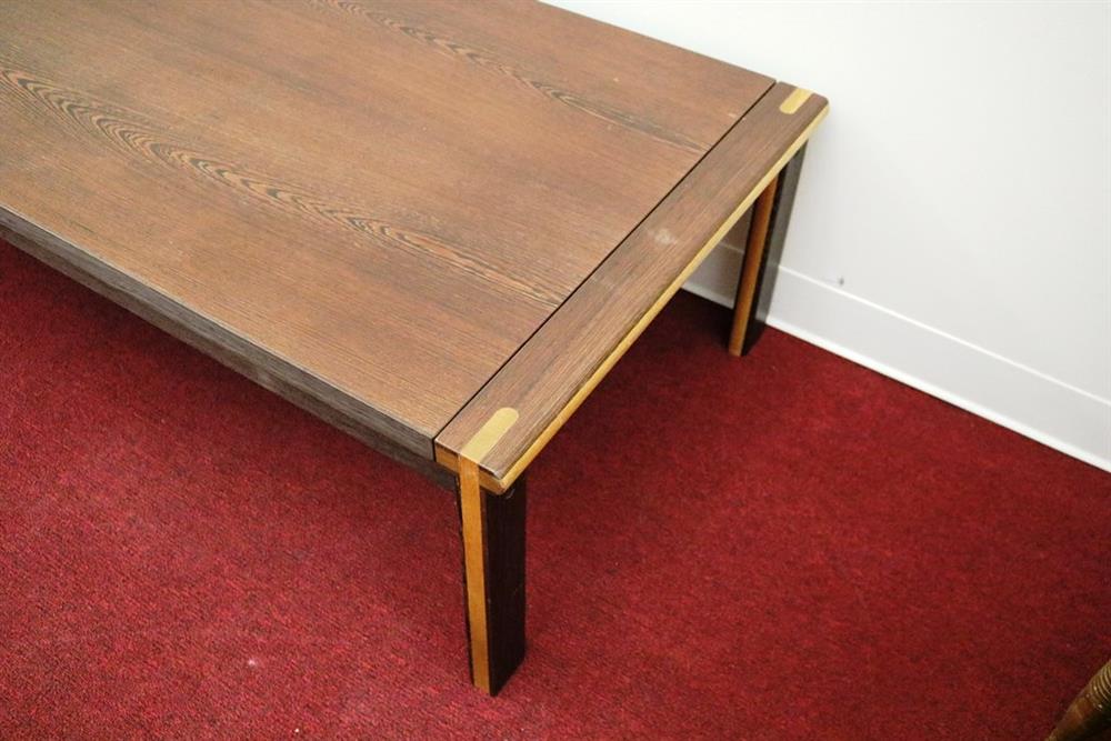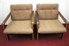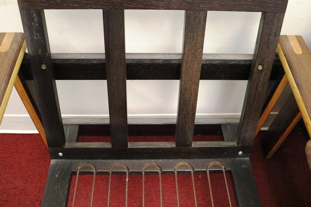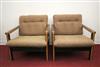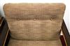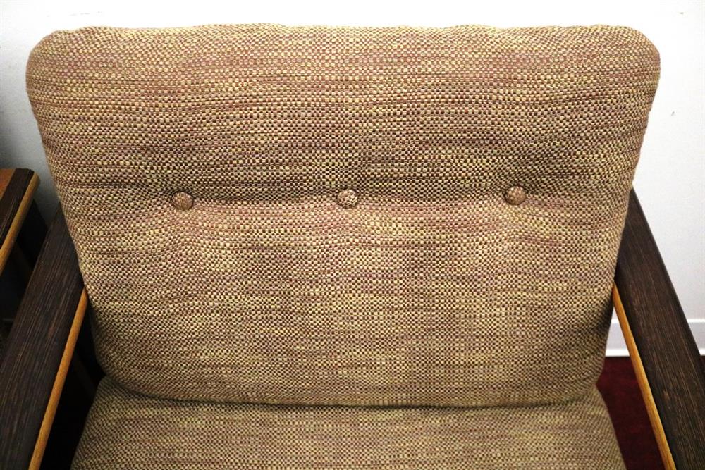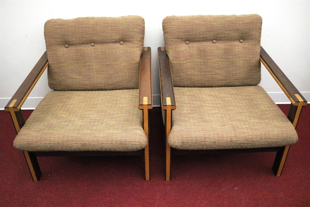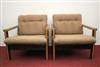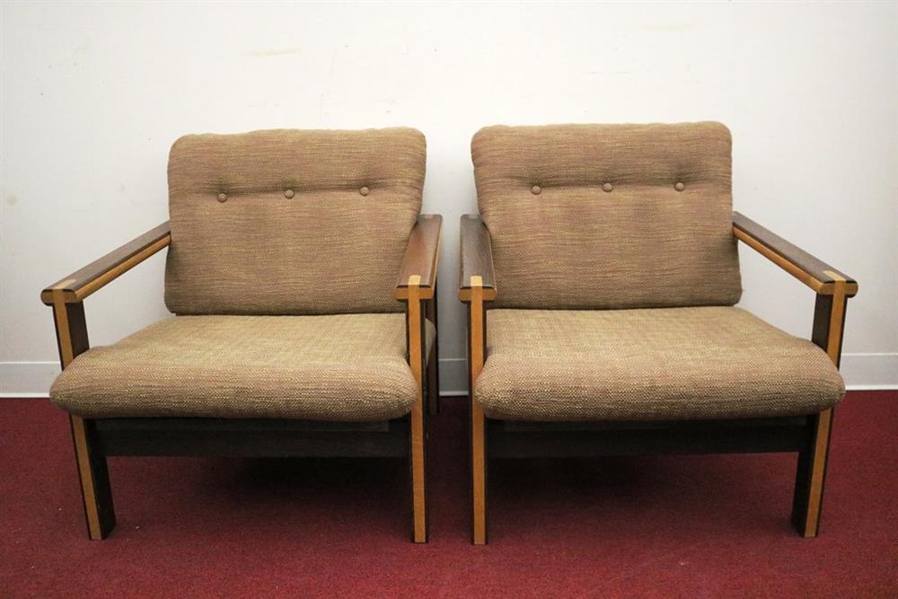 PAIR MID CENTURY MODERN INLAID MIXED WOOD OPEN-ARMCHAIRS WITH MATCHING RECTANGULAR-TOP COFFEE TABLE. Table has banded ends with rectangular block legs. - Table, H: 15 3/4 in,; Top, 15 3/8 in. x 26 7/8 in.