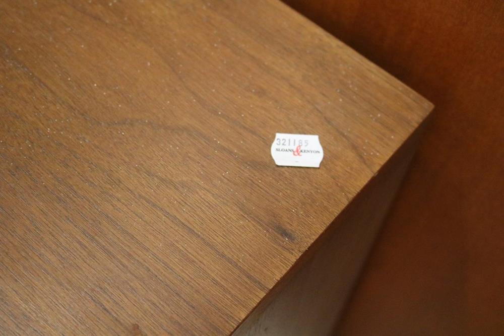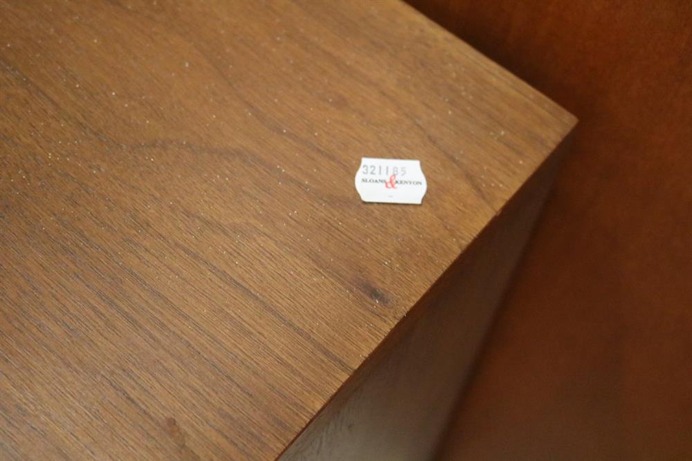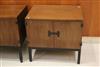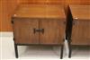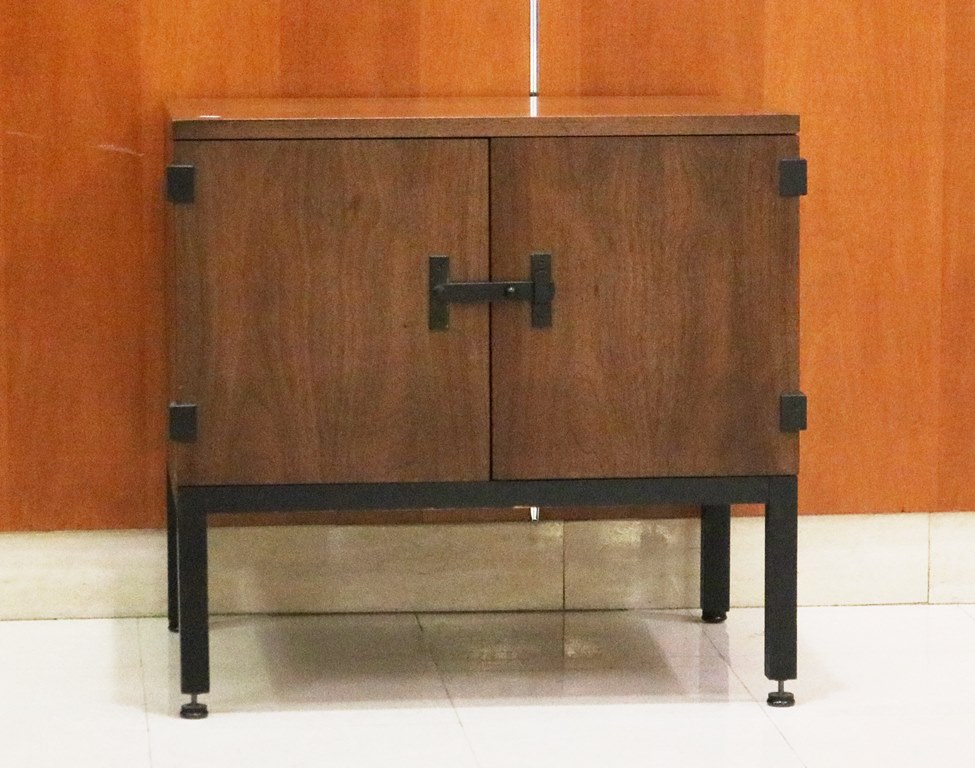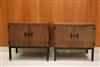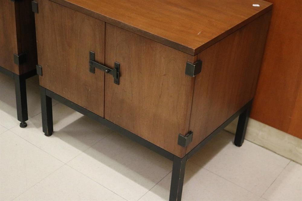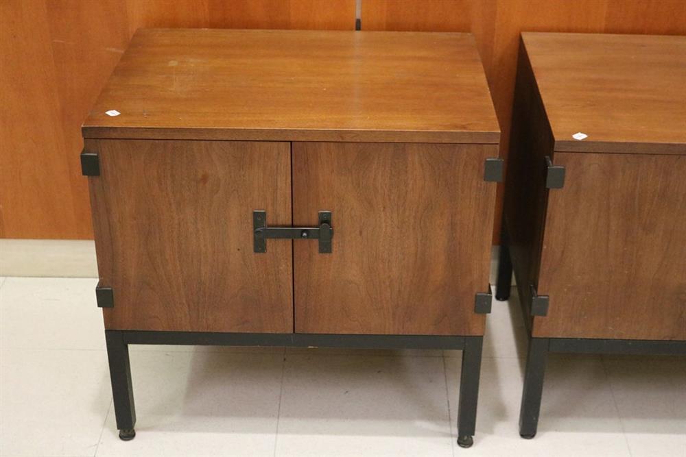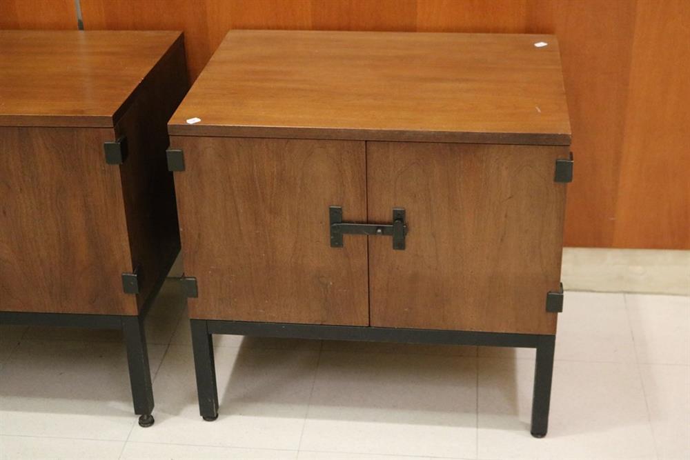 PAIR MID-CENTURY MODERN WALNUT BEDSIDE STANDS BY MILO BAUGHMAN FOR DIRECTIONAL. Each with pair cabinet doors; ebonized geometric mounts and latches - H: 22 in. W: 24 1/4 in. D: 18 1/4 in.Estimate $500-1,000
