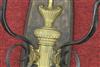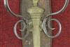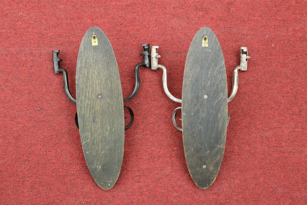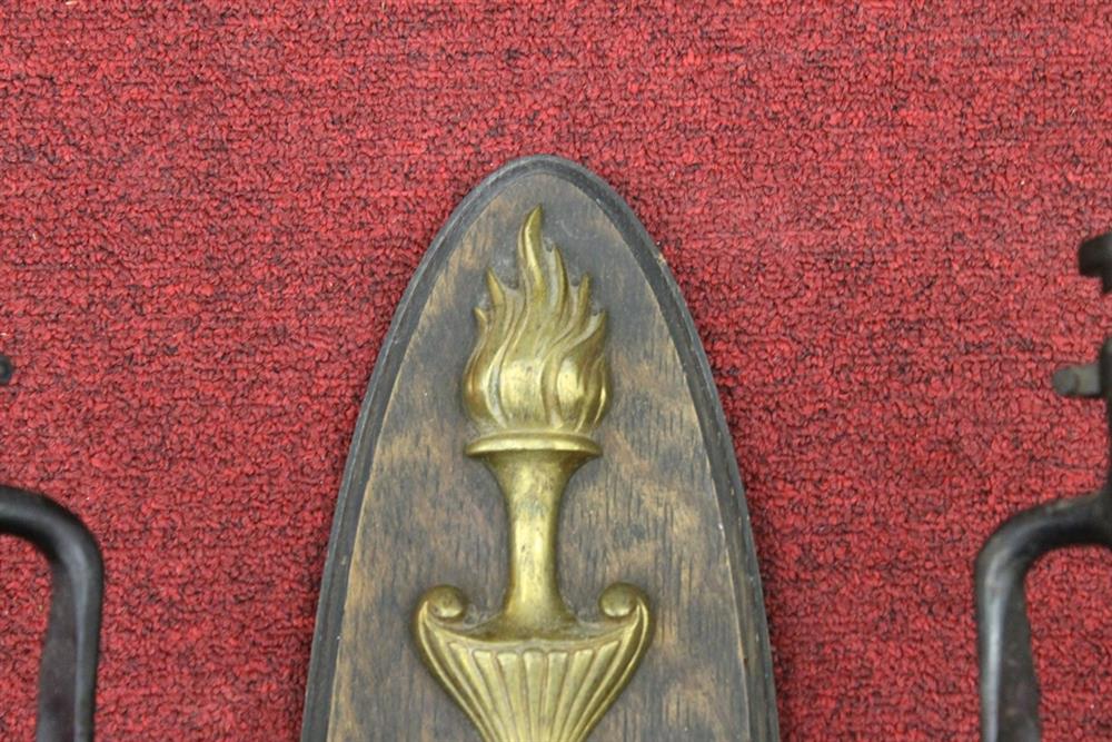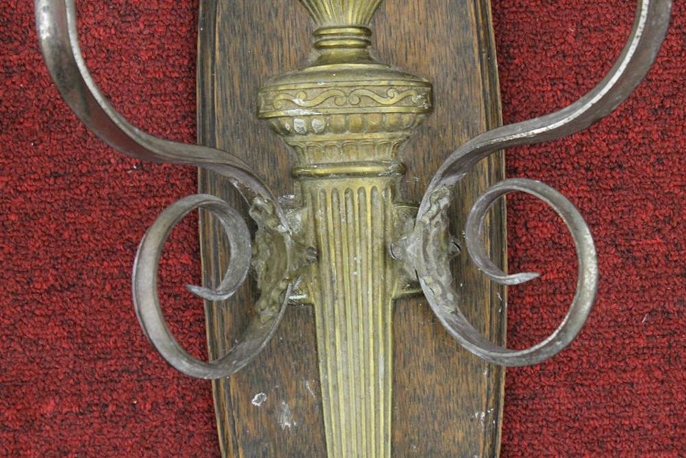 PAIR TORCH AND BAYONET WALL SCONCES. Late 19th century. Brass and steel elongated oval oak back panel. - Height: 19 1/4".Estimate $200-300