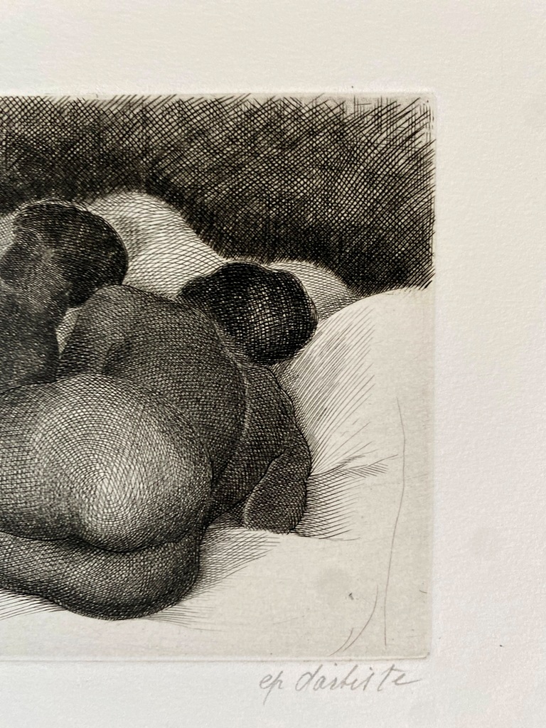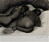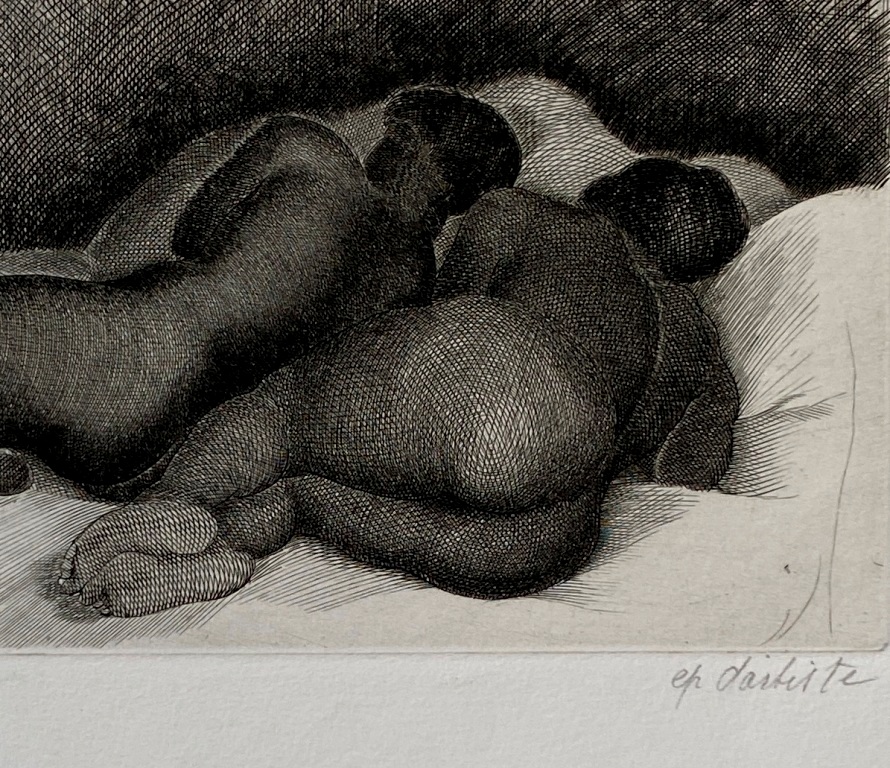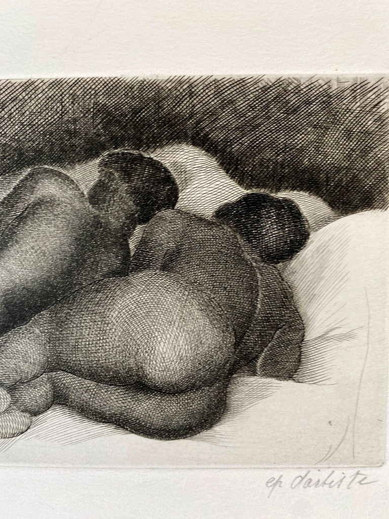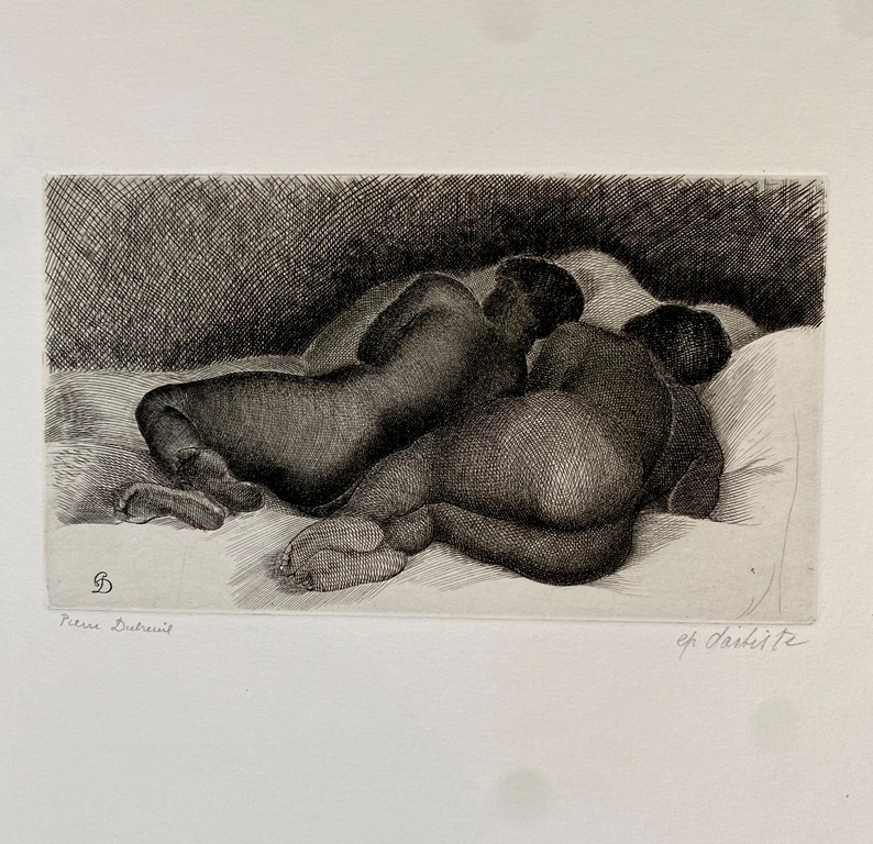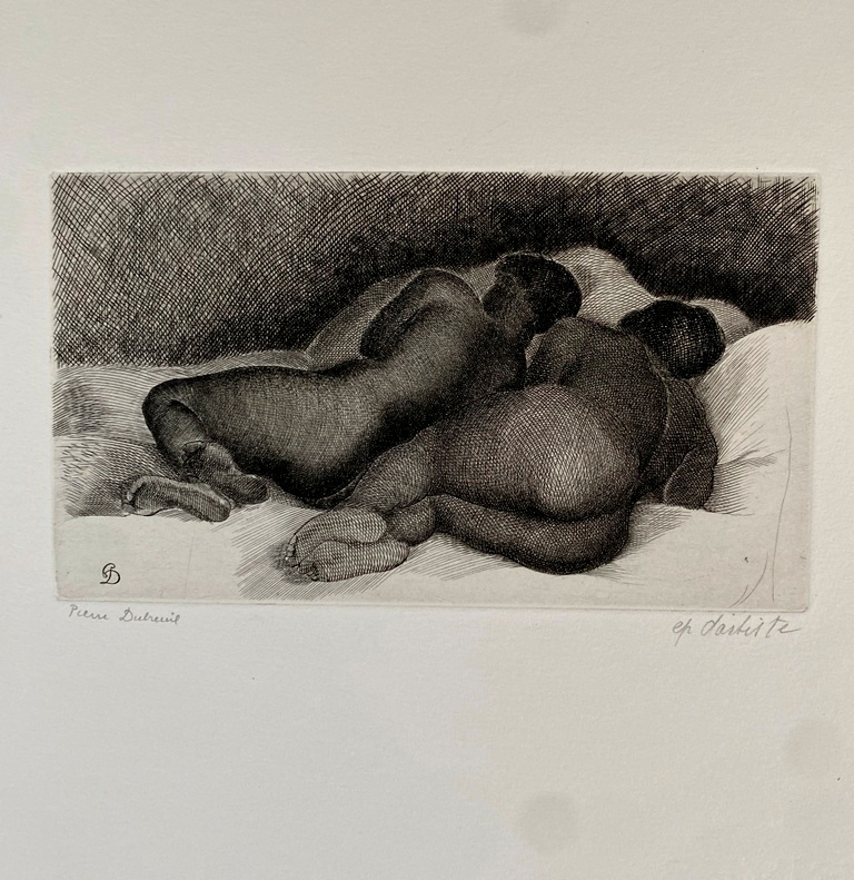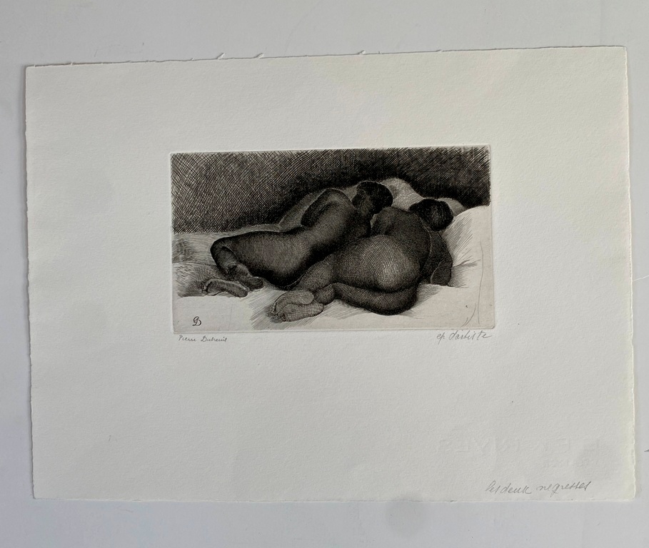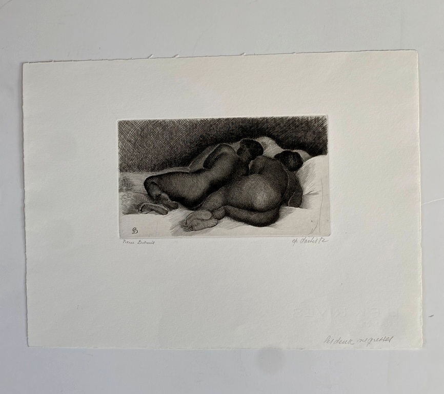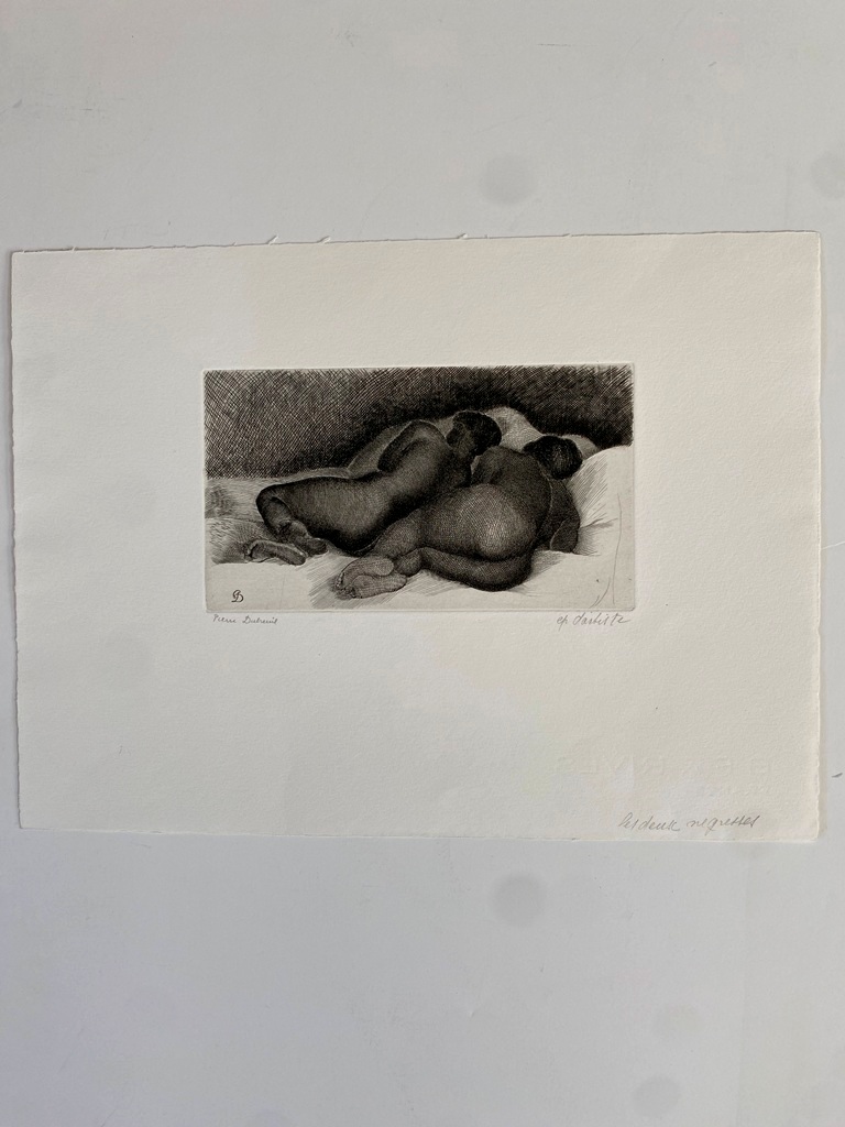 PIERRE DUBREUIL (French 1891-1970). Les Deux Négrettes (The two Black girls), Etching or drypoint. Pencil titled and signed at base. It is an "Épreuve d'Artist"(or artist's proof) work depicting two women lying on their stomachs or sides, their bodies close together, creating a sense of intimacy and languor. They appear to be resting or sleeping, with their heads turned away from the viewer. The focus is entirely on the curvaceous forms of the human body. Unframed. Not mounted or laid down. - Image: 4.5 x 8 inches; Sheet: 11 x 15 inches Estimate $150-250