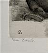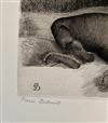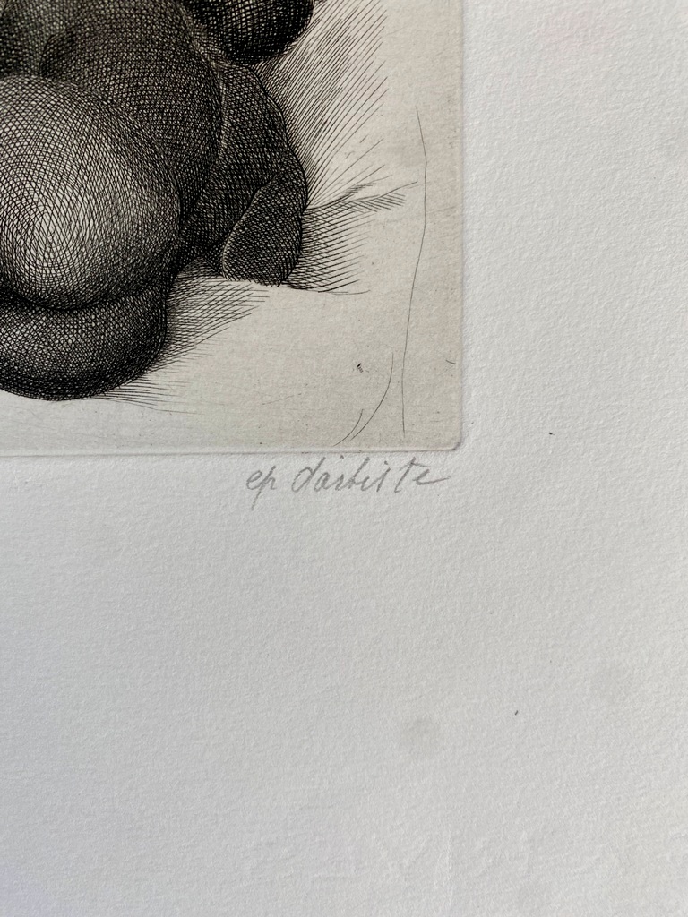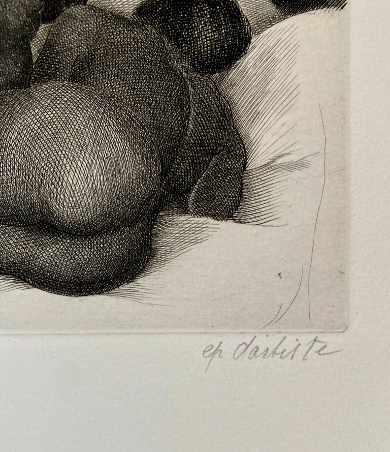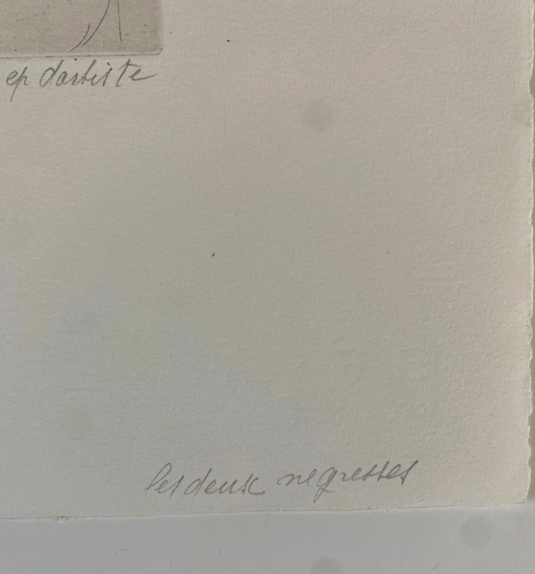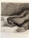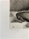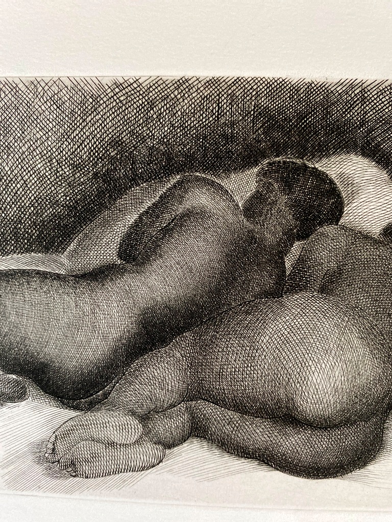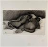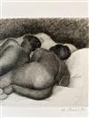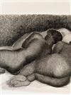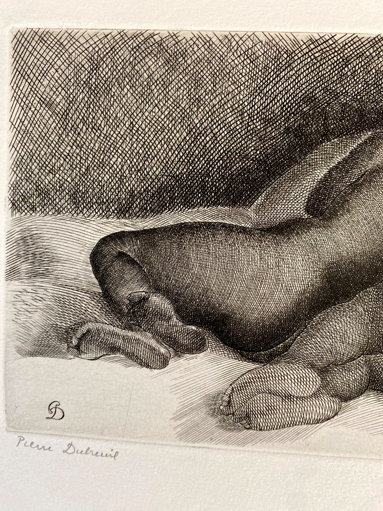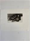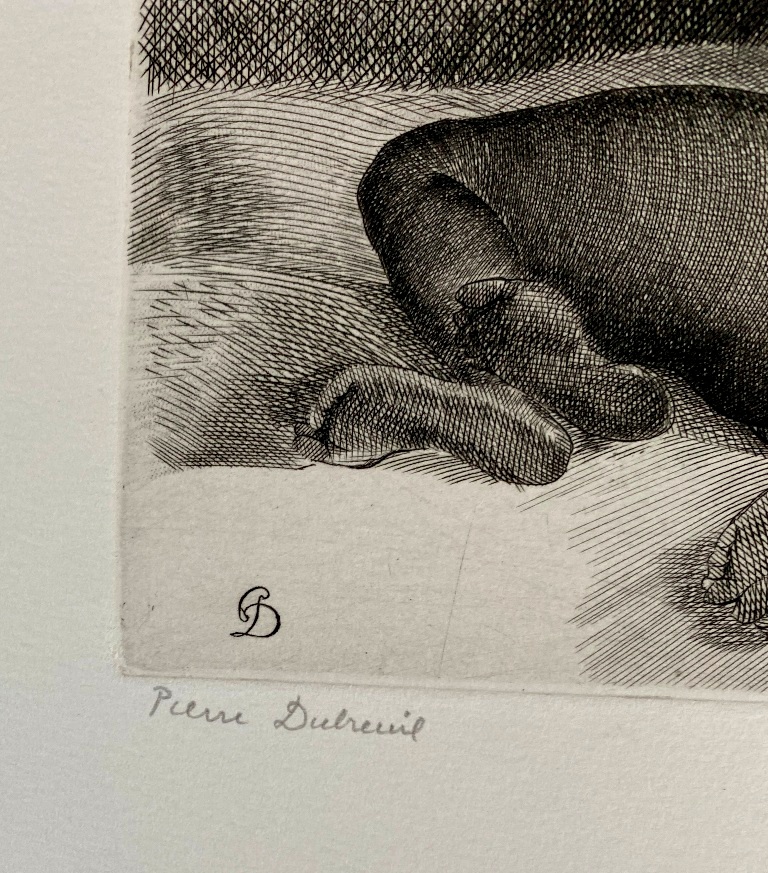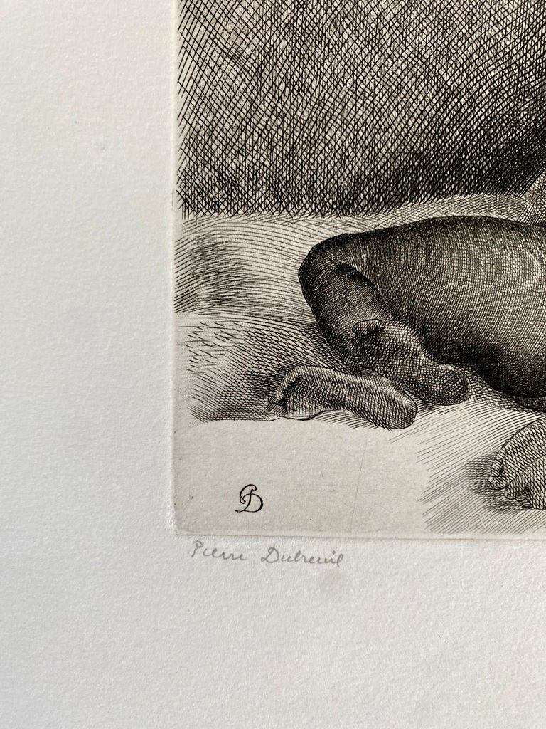 PIERRE DUBREUIL (French 1891-1970). Les Deux Négrettes (The two Black girls), Etching or drypoint. Pencil titled and signed at base. It is an "Épreuve d'Artist"(or artist's proof) work depicting two women lying on their stomachs or sides, their bodies close together, creating a sense of intimacy and languor. They appear to be resting or sleeping, with their heads turned away from the viewer. The focus is entirely on the curvaceous forms of the human body. Unframed. Not mounted or laid down. - Image: 4.5 x 8 inches; Sheet: 11 x 15 inches Estimate $150-250