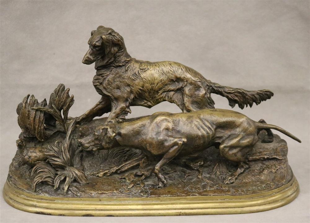 PIERRE-JULES MENE (French, 1810-1879). Pointer Dogs Hunting, Patinated bronze. Signed on base: "P J Mene" - Size: H: 9 inches Long: 15.5 inches Wide: 8 inchesEstimate $300-400