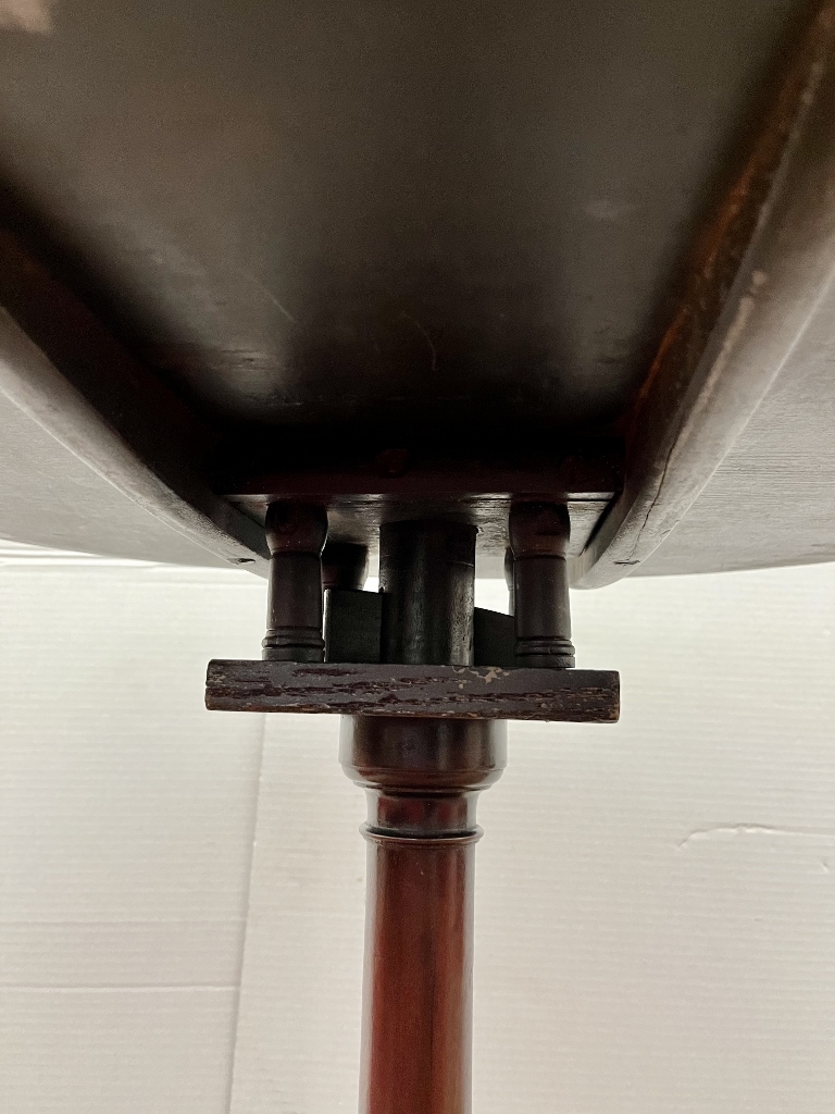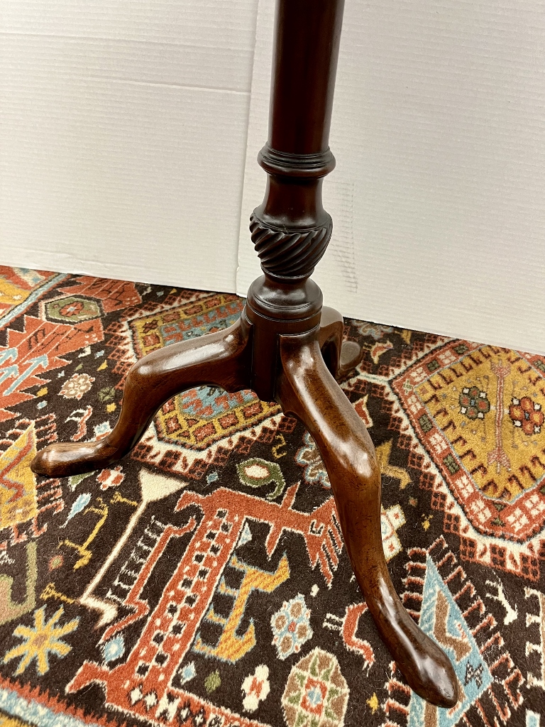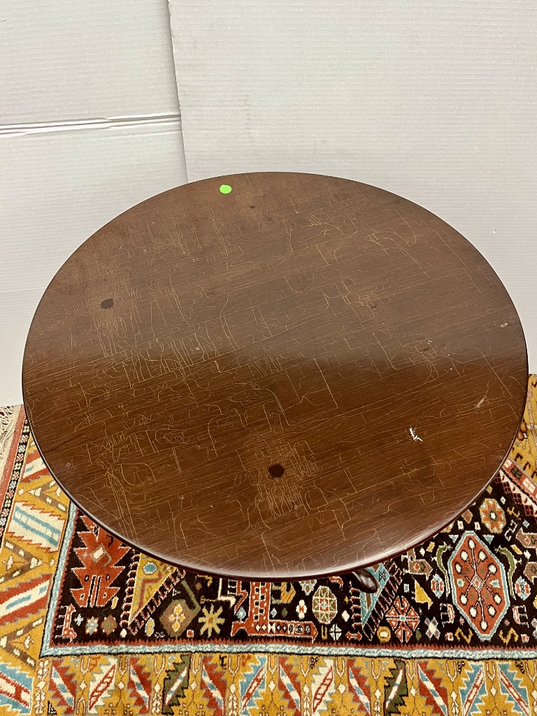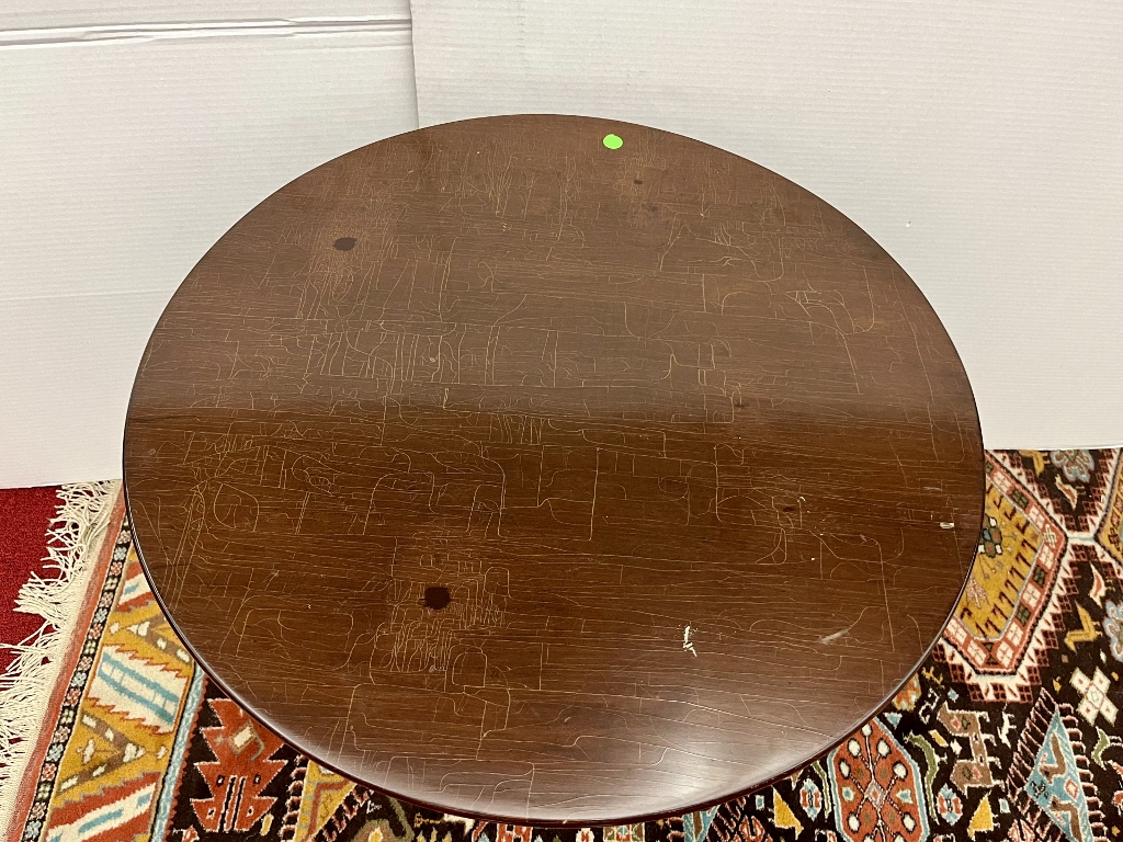 QUEEN ANNE STYLE CARVED MAHOGANY TILT-TOP TEA TABLE. Plain circular top over ring-and-urn turned base raised on three cabriole legs H: 27 in.; top, D: 26 3/4 in.Estimate $100-150