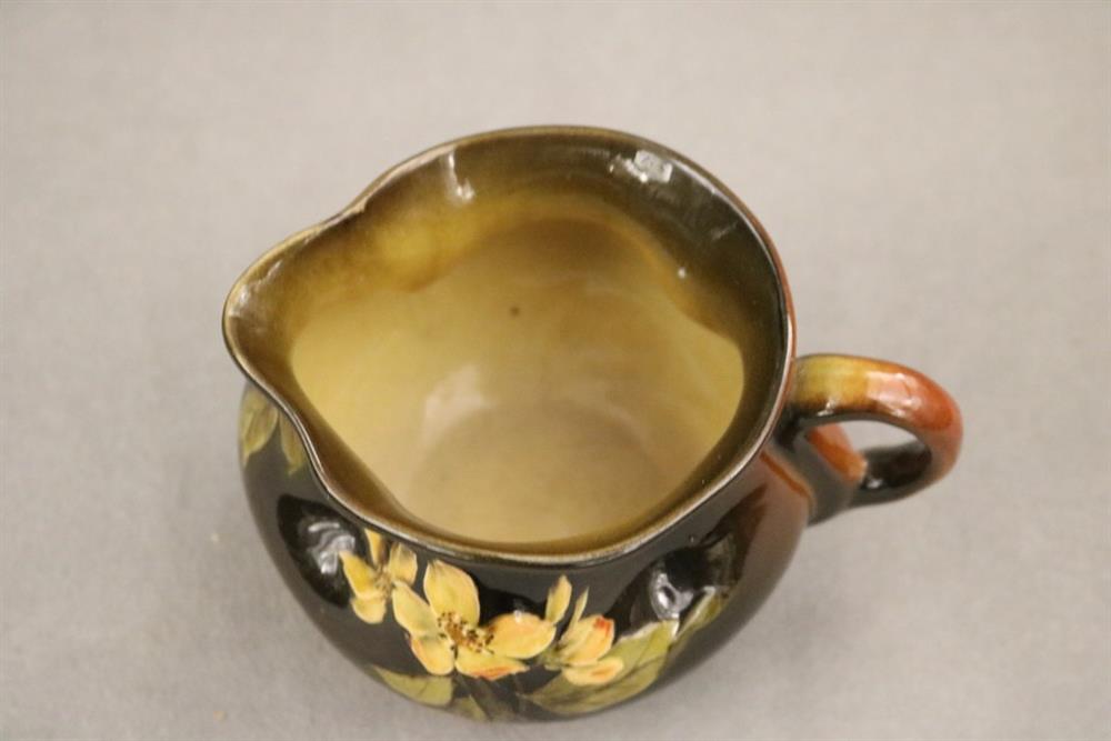 ROOKWOOD ART POTTERY HAND-PAINTED CREAMER. late 19th century. Signed with incised initials under foot. Pinched bun-form wiht projecting spout; floral blossom decoration with stems and leaves - H: 2 5/8 in.Estimate $150-250