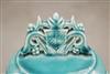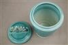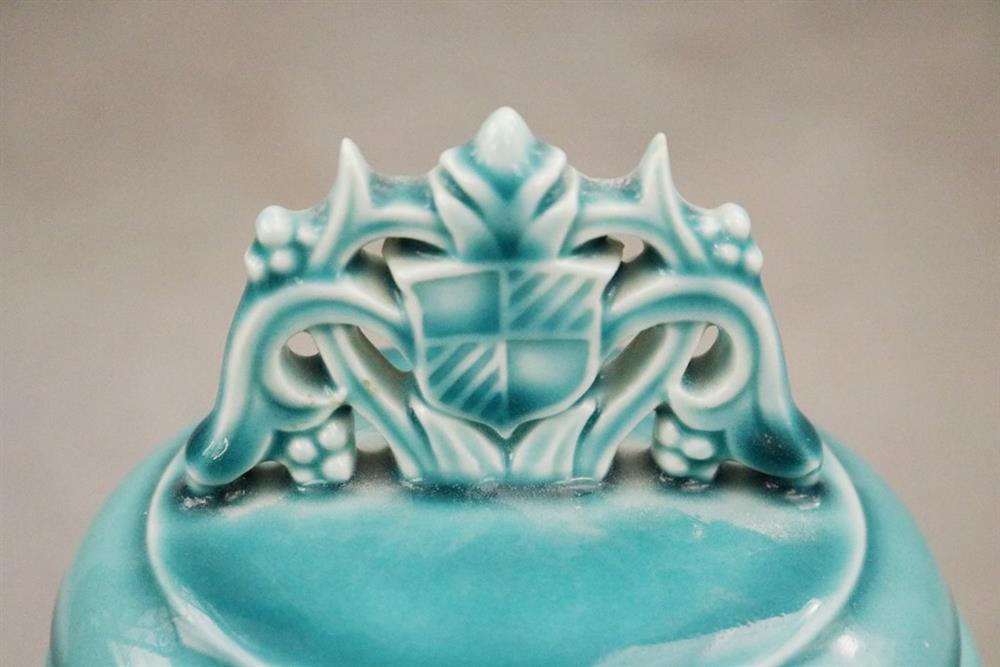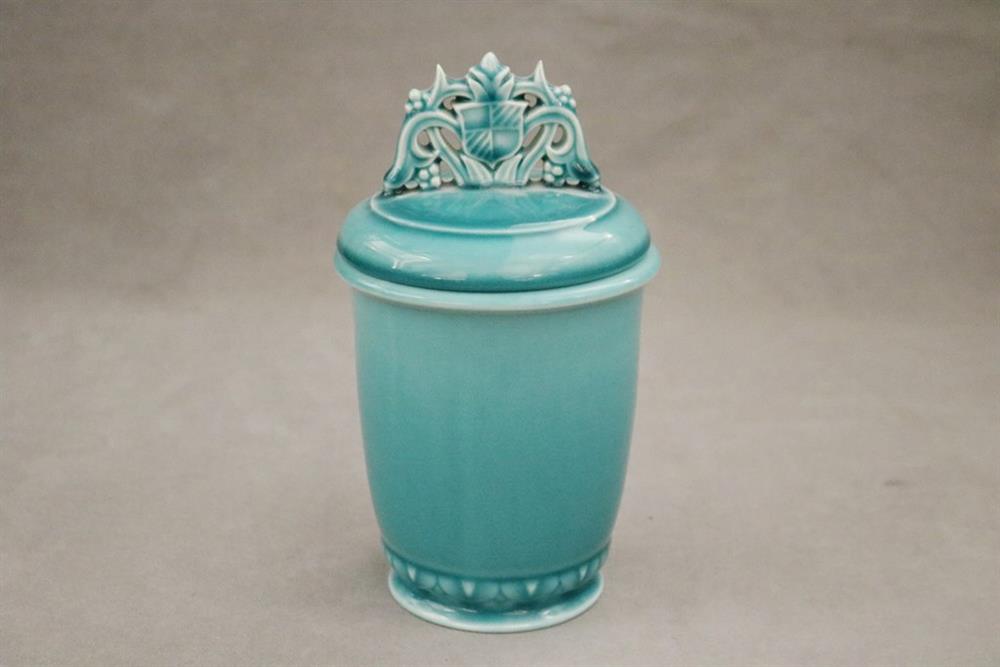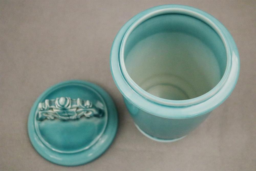 ROOKWOOD ART POTTERY MONOCHROME GLAZE TWO-PIECE LIFT-COVER CIGAR JAR, 1940. shape number 6477, Cover has pierced shield, scroll, and berry finial - H: 8 3/4 in.Estimate $75-122
