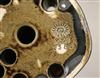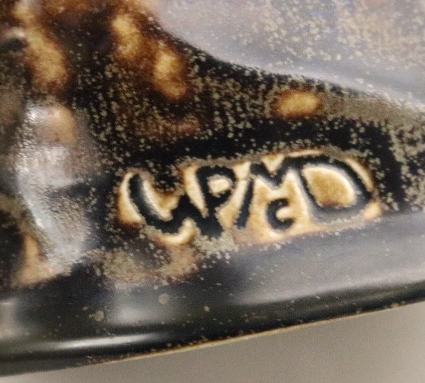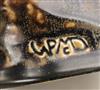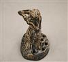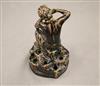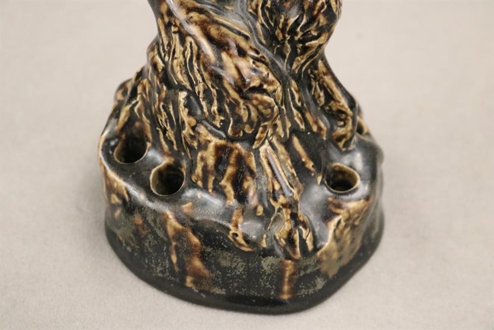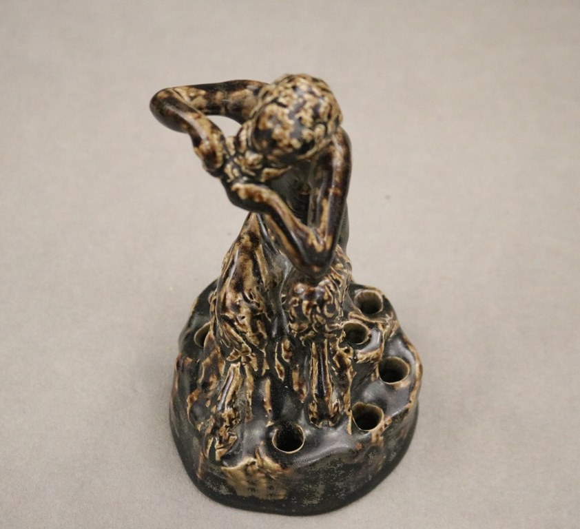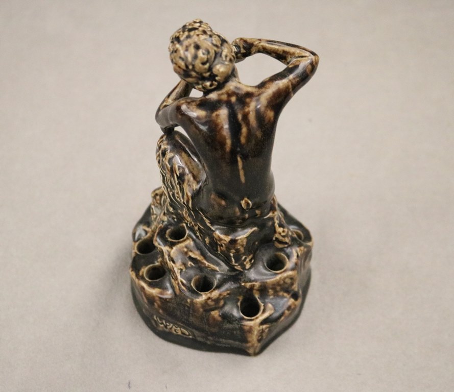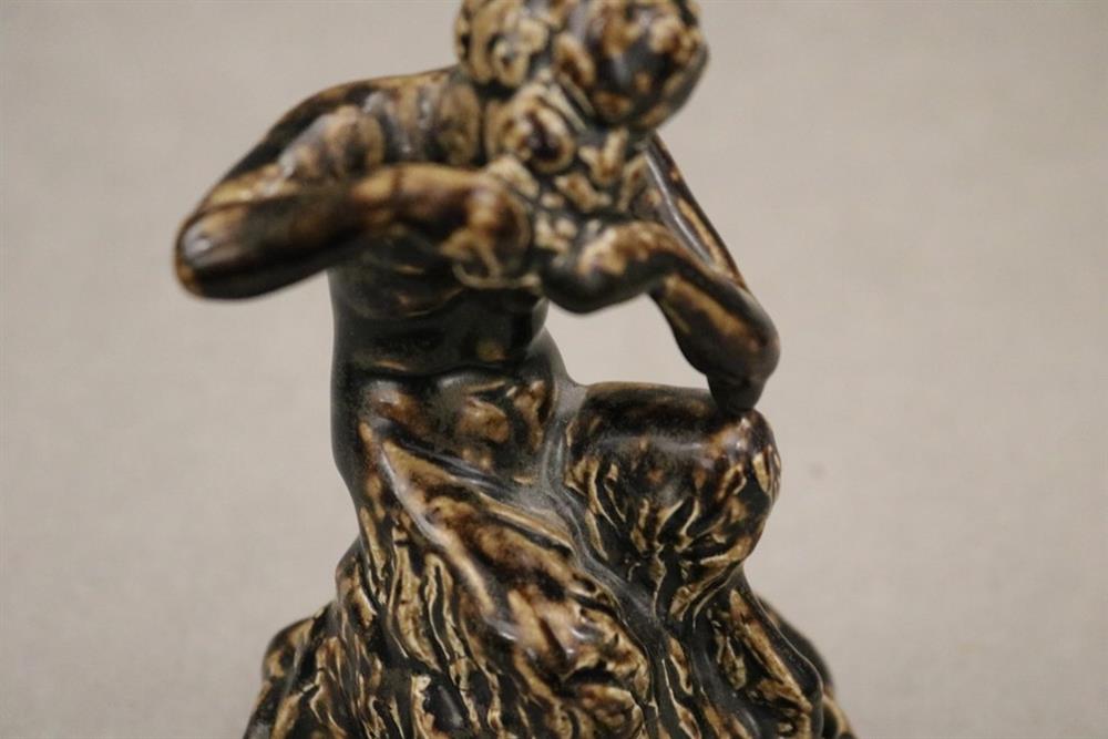 ROOKWOOD ART POTTERY SATYR FLOWER FROG. 1922. Mold mark 2580 Depicts a satyr seated on tree trunk and playing flute. - H: 6 3/4 in.Estimate $150-250