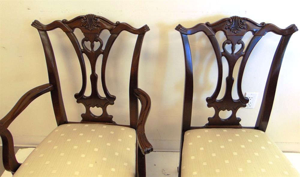 SET EIGHT CHIPPENDALE STYLE CARVED MAHOGANY, SLIP-SEAT DINING CHAIRS. Including pair open-arm chairs and six sidechairs. Shell crests over flaring pierced splats; cabriole legs end in claw-and-ball feetEstimate $200-300