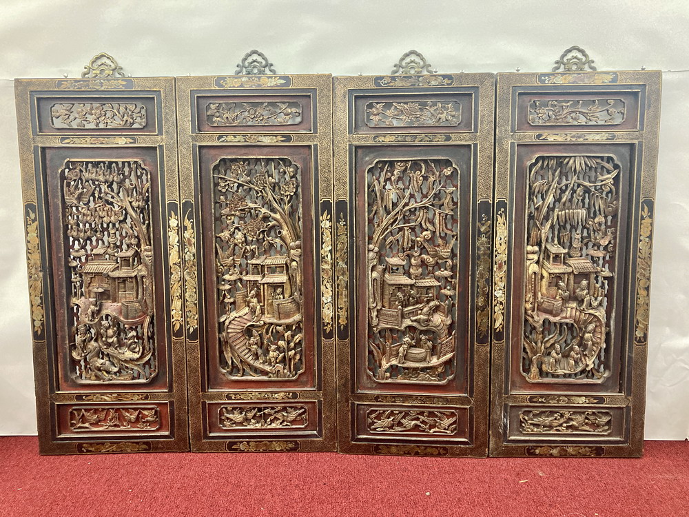 SET FOUR 19TH CENTURY CHINESE CARVED AND PAINTED WOODEN PANELS. Each pierced and carved with scenes of figures in pavilion landscapes; red, black and gilt decoration - Each, 37 3/4 in. x 15 1/4 in.Estimate $600-800
