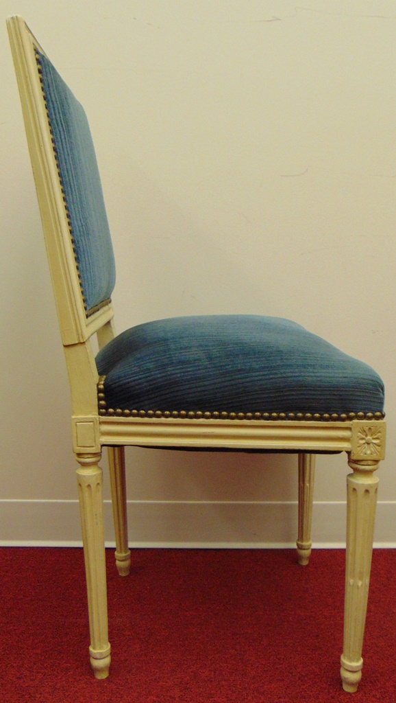 SET FOUR LOUIS XVI STYLE CREAM-PAINTED BLUE UPHOLSTERED SIDE CHAIRS. Estimate $300-400 In good condition. Lots of chips to the chairs.