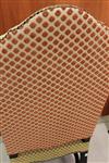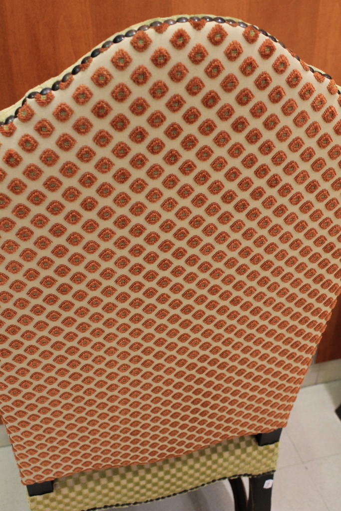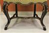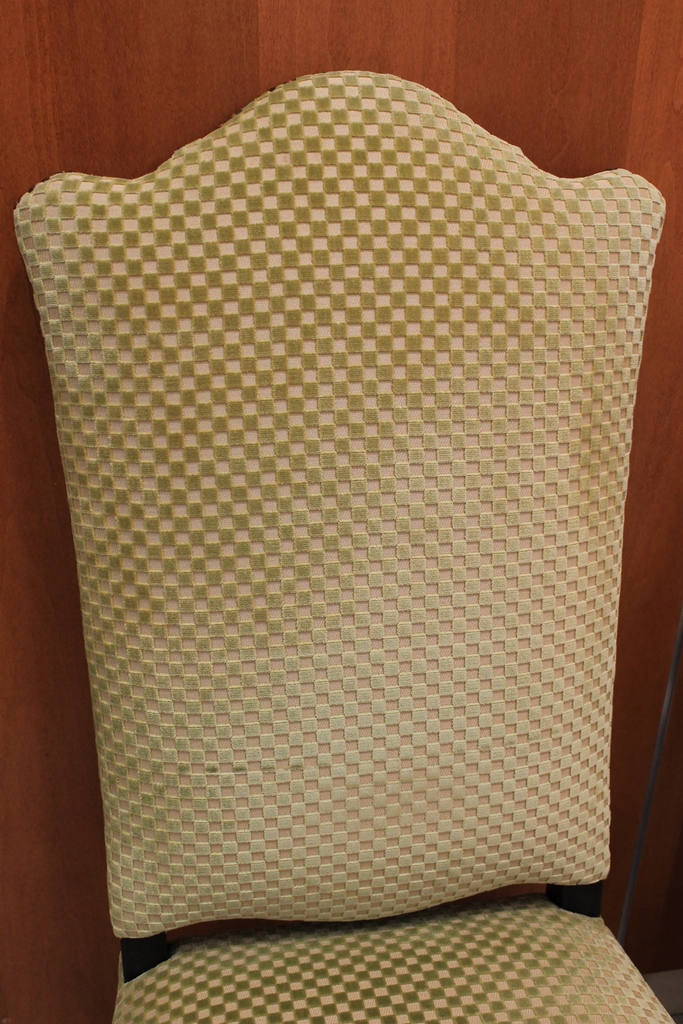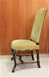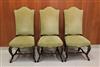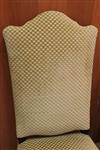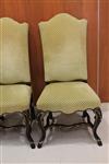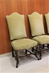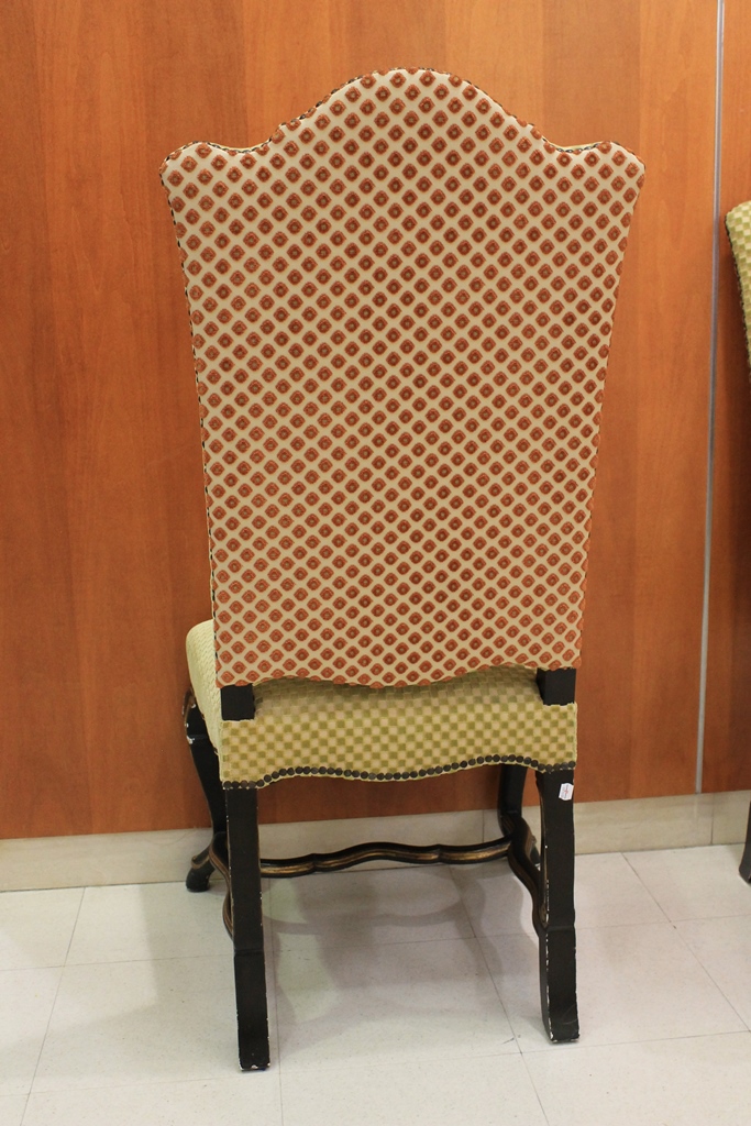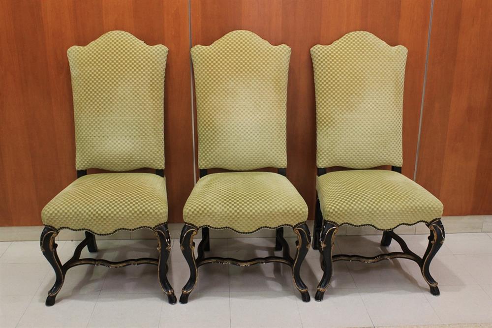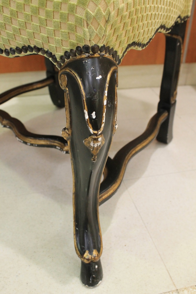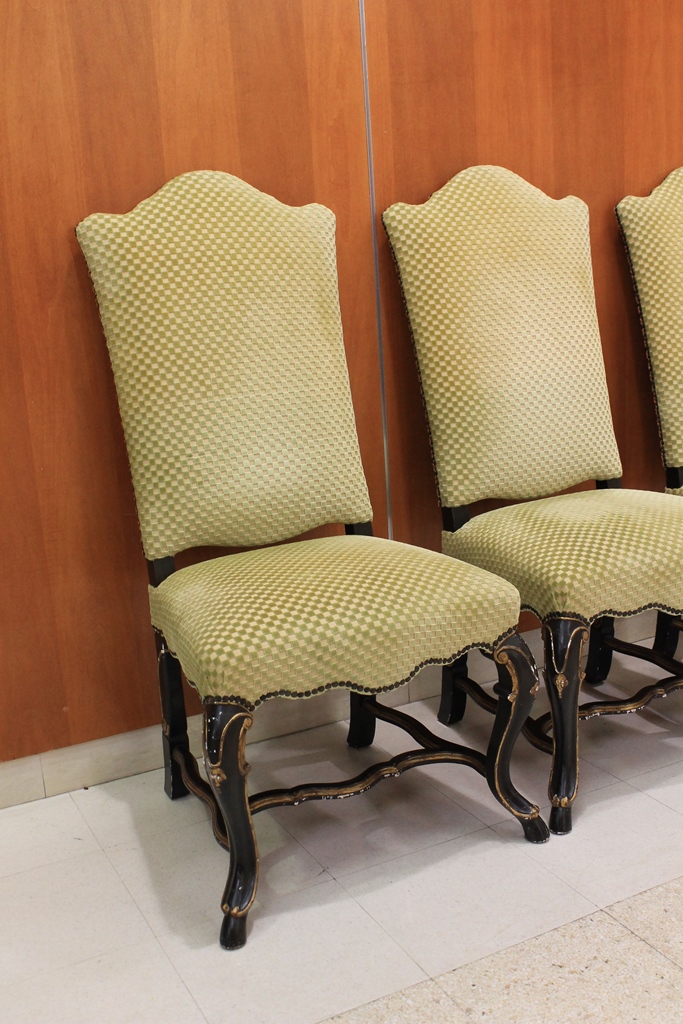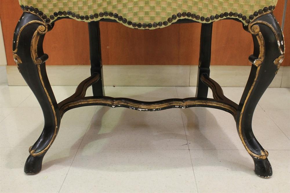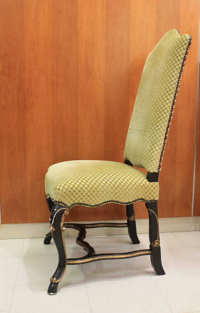 SET OF EIGHT CONTINENTAL STYLE UPHOLSTERED DINING SIDE CHAIRS IN A MODIFIED LOUIS XV TASTE. High shaped, domed backs; carved black lacquer cabriole legs with shaped, flat H-stretchers and gilt highlights; hoof front feet; textured plush cut velvet upholstery with brass nailhead trim Estimate $1,500-2,500