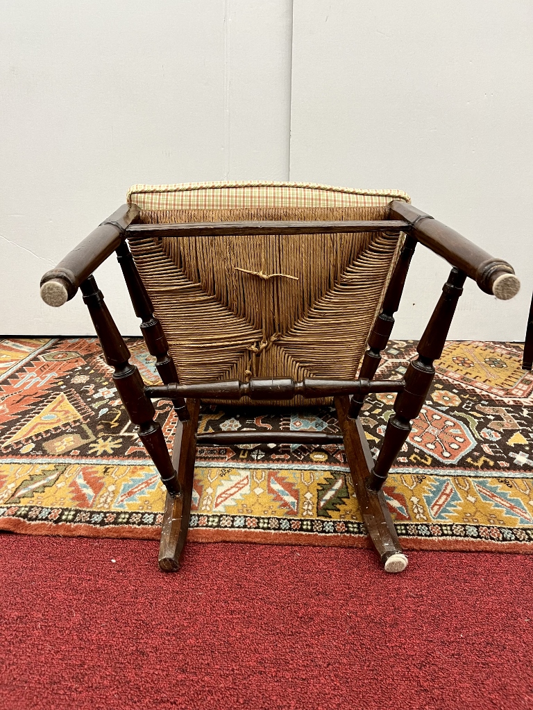 SET SIX FRENCH COUNTRY FRUITWOOD RUSH-SEAT SIDECHAIRS. Pierced splats; tie-on plaid fabric covered seat cushionsEstimate $250-350