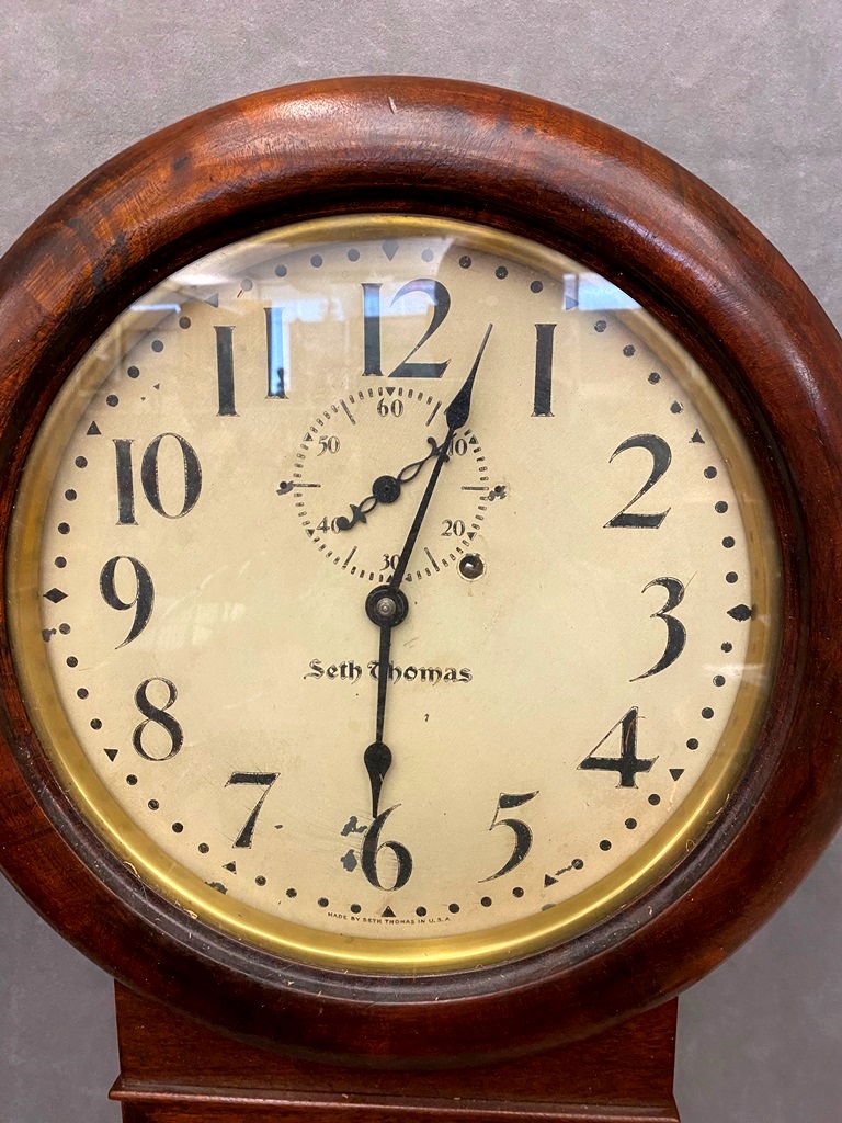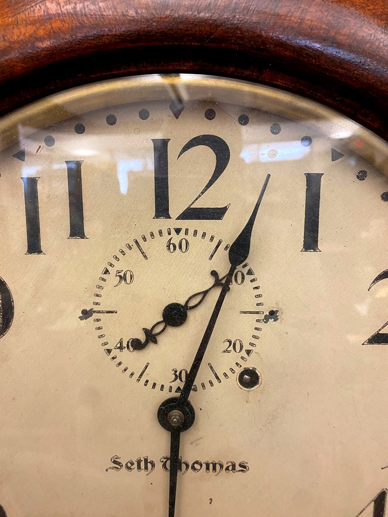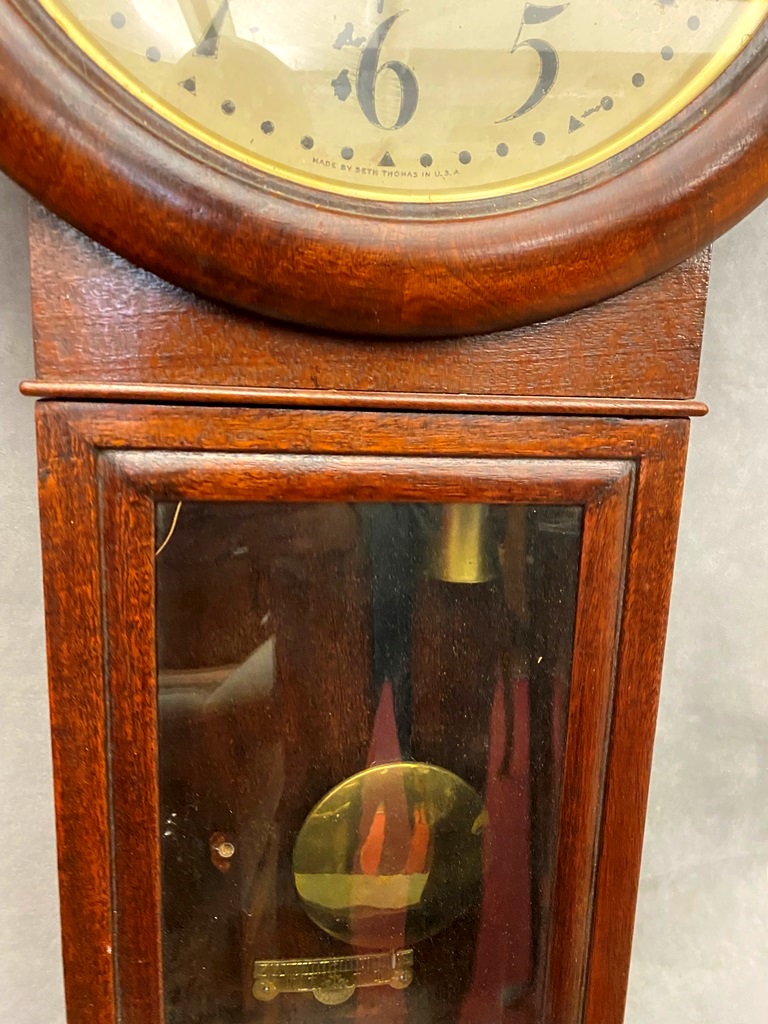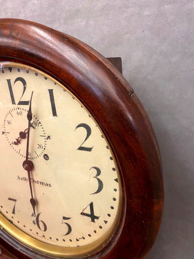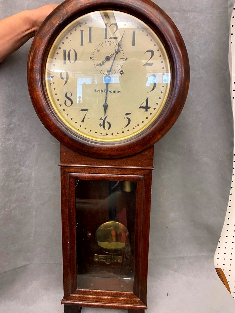 SETH THOMAS OAK CASE PENDULUM WALL CLOCK, late 19th century. Circular face with black stenciled Roman numerals and subsidiary seconds dial' glazed pendulum window. - H: 35 3/4 in.Estimate $150-250