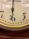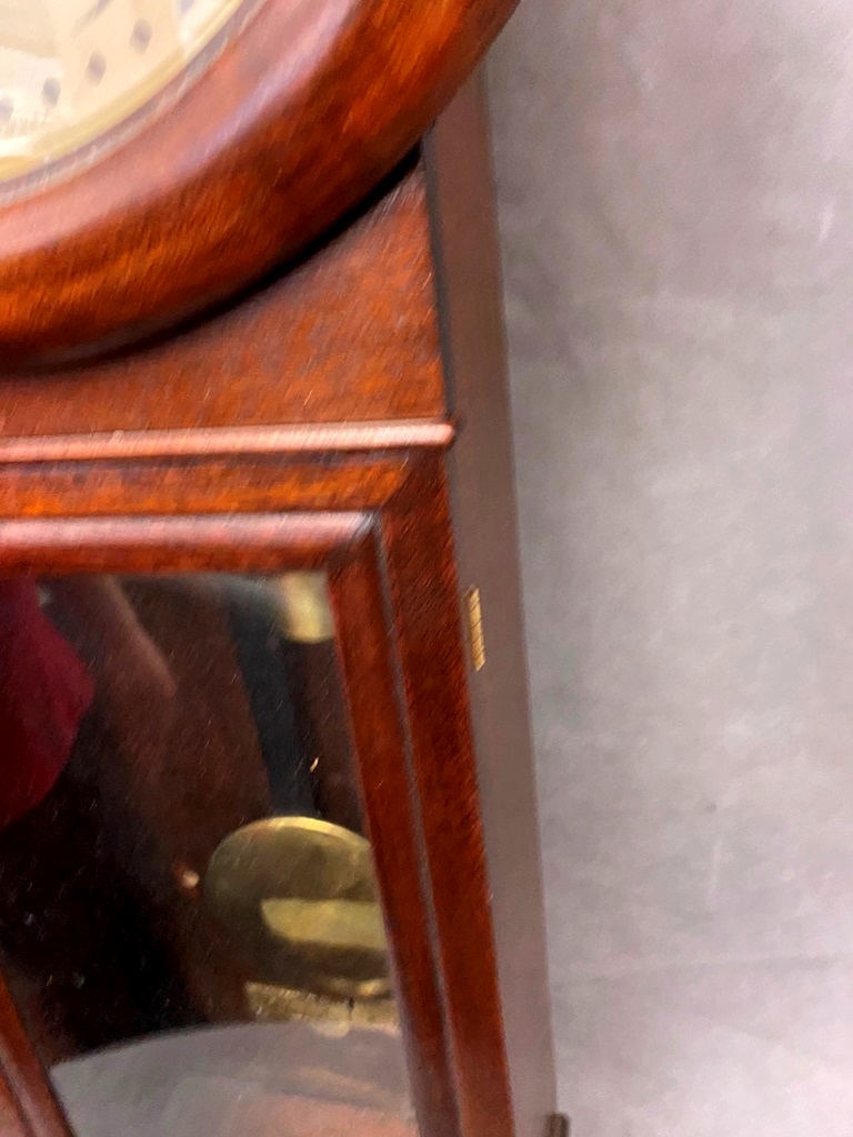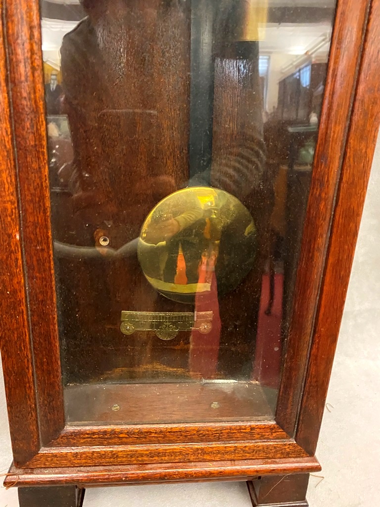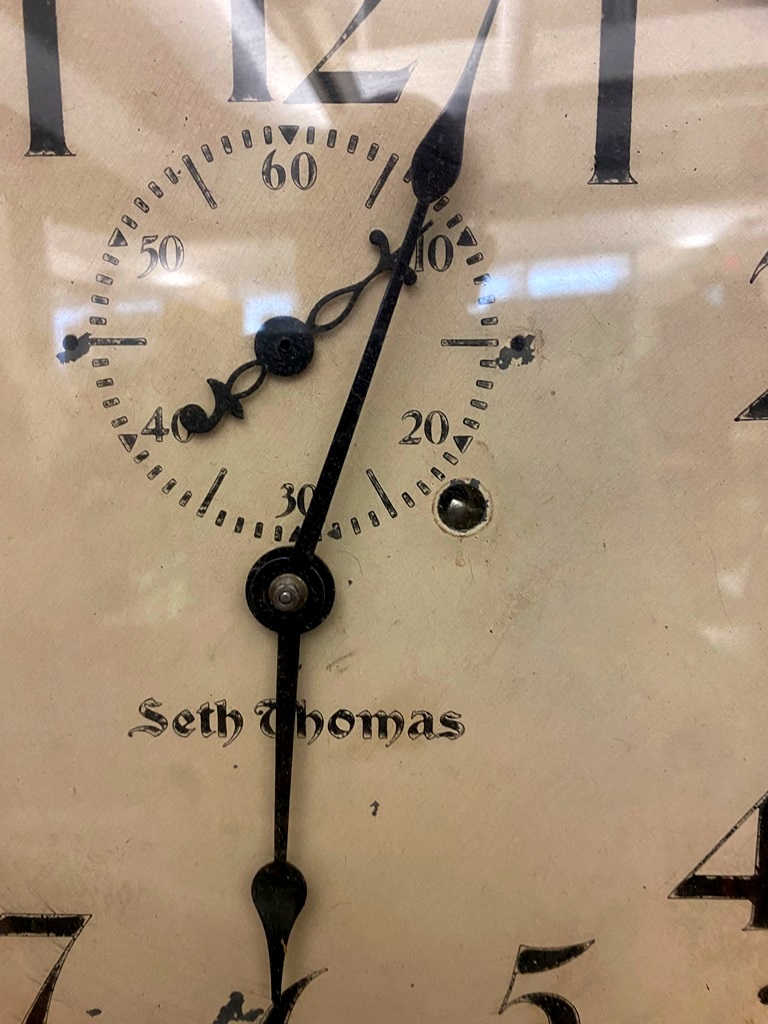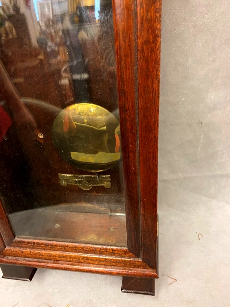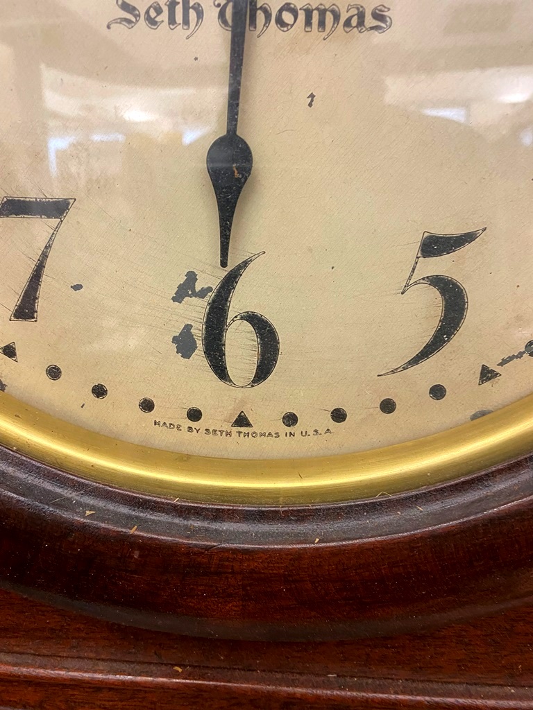 SETH THOMAS OAK CASE PENDULUM WALL CLOCK, late 19th century. Circular face with black stenciled Roman numerals and subsidiary seconds dial' glazed pendulum window. - H: 35 3/4 in.Estimate $150-250