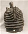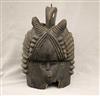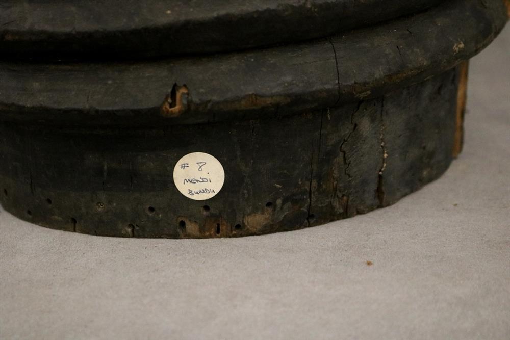 SIERRA LEONE SANDE MENDE HELMET SOWEI MASK. Mende helmet mask, specifically a Sowei mask, originating from Sierra Leone. These masks are traditionally used by the Sande (or Bundu/Bundu) women's secret societies of the Mende people in Sierra Leone and Liberia. The masks are worn by high-ranking members of the Sande society, known as the ndoli jowei among the Mende, during ceremonies such as initiations, funerals, and judicial proceedings. - Height: 18 inches. Estimate $120-180