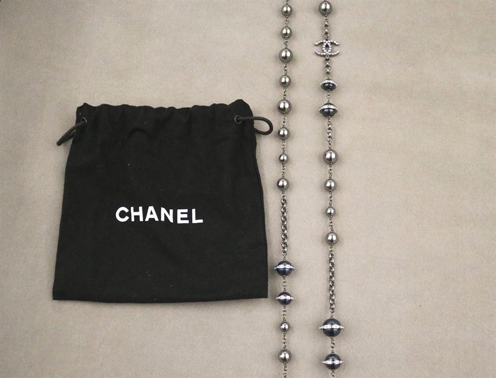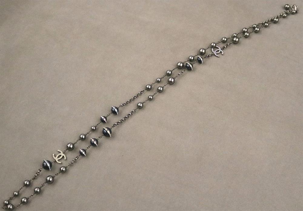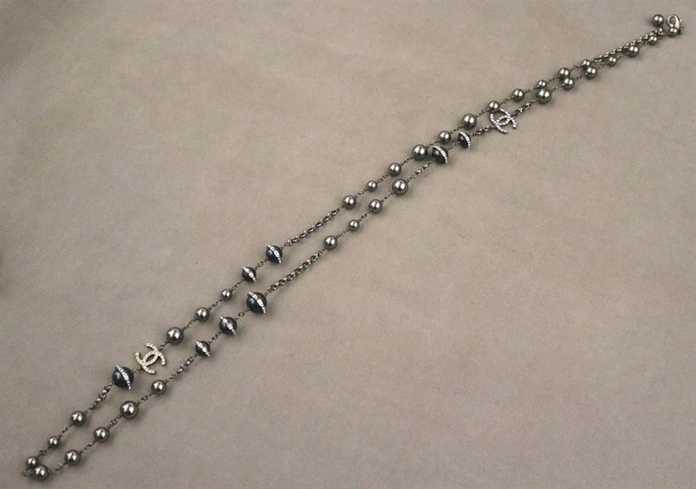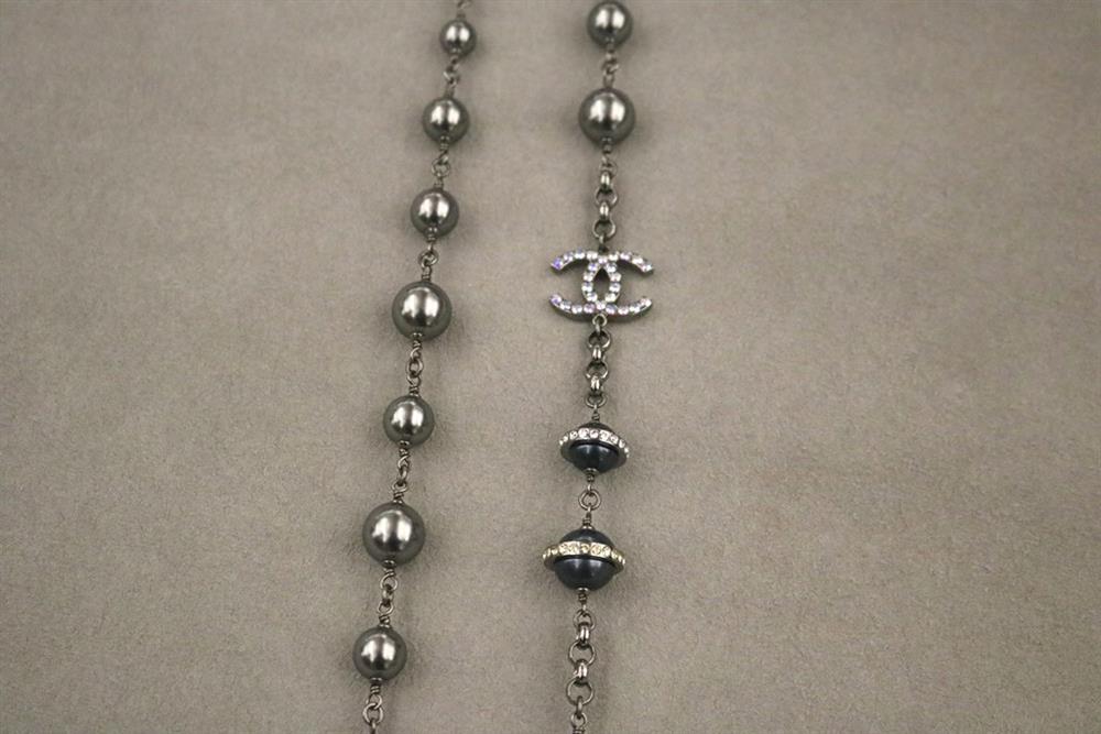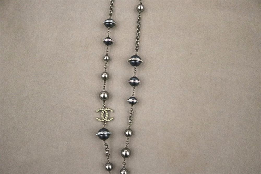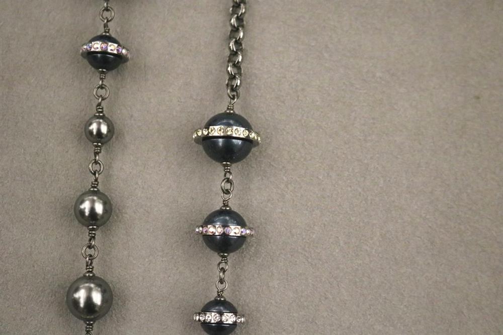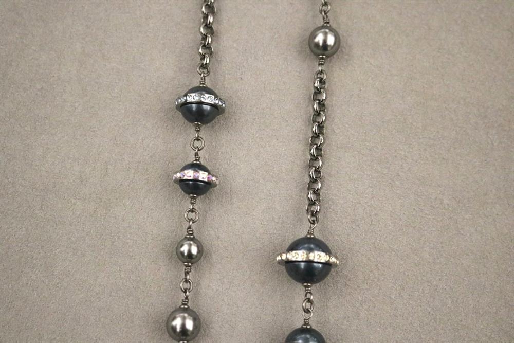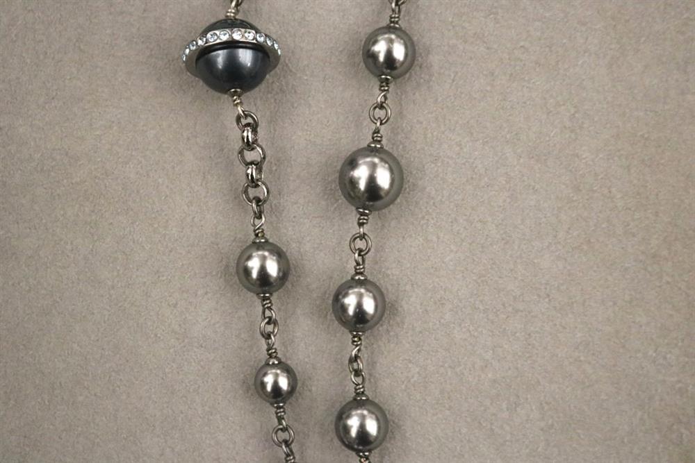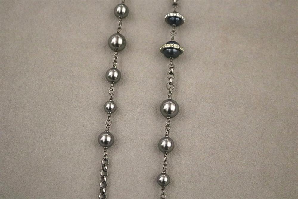 SIGNED CHANEL FAUX GRAY AND BLACK PEARL AND RHINESTONE FLEXIBLE-LINK NECKLACE, Round links spaced with gray faux pearls and black faux pearls encircled by rhinestones; two rhinestone-set logo links; clasp marked "Chanel A17-K/Made in France." With Chanel black storage pouch. L: 50 in. Estimate $800-1,200