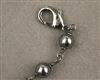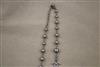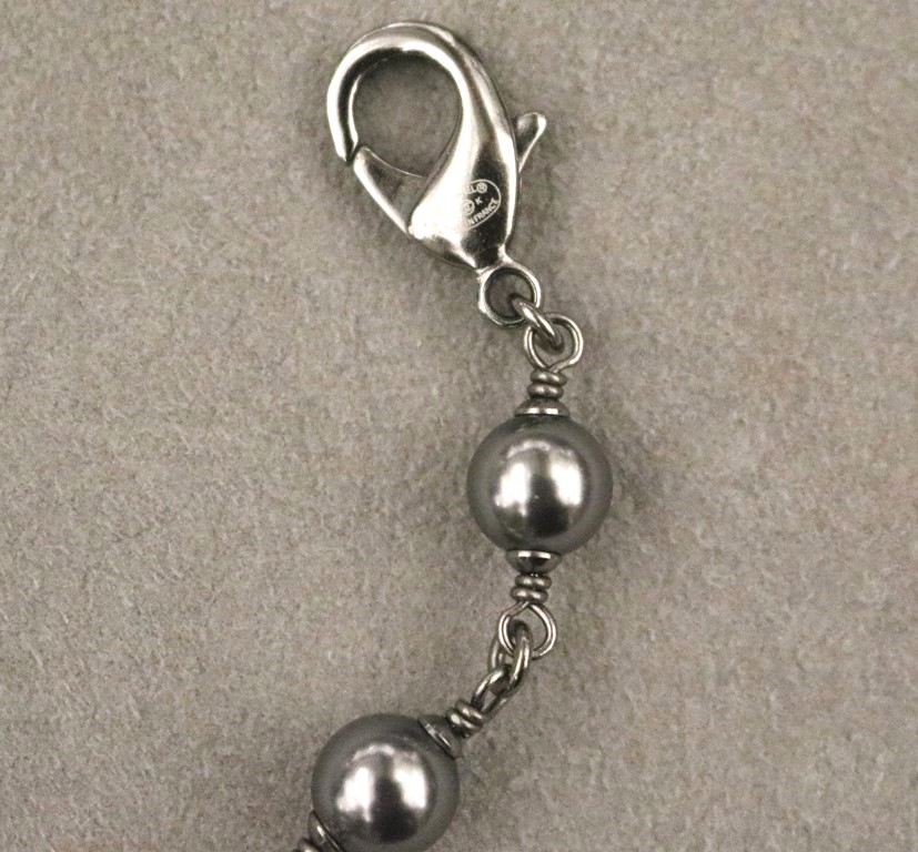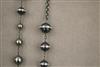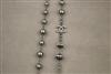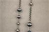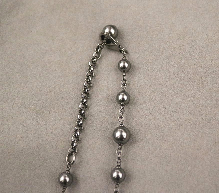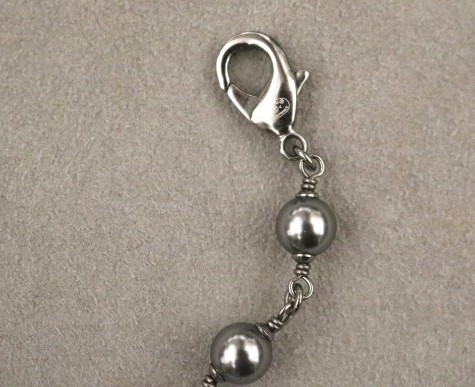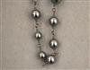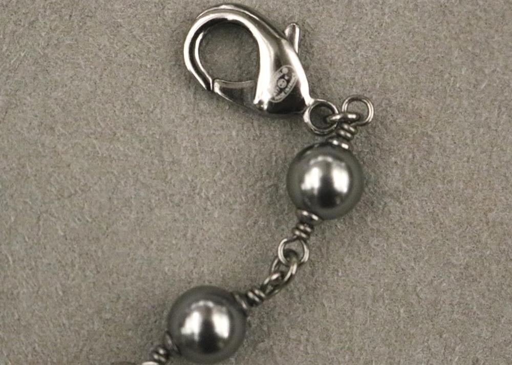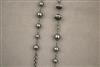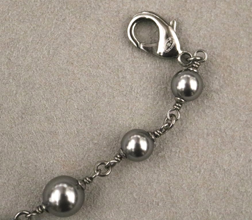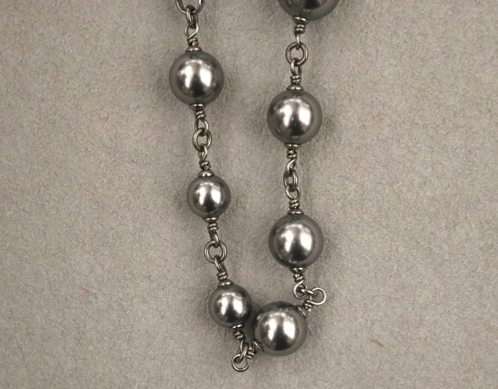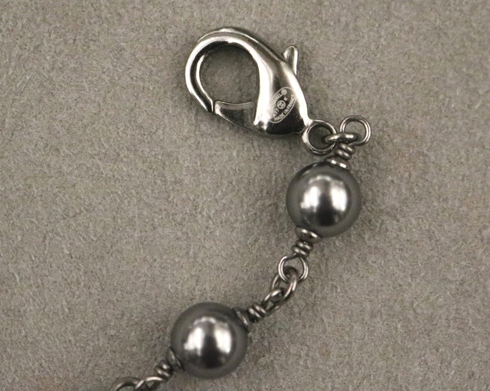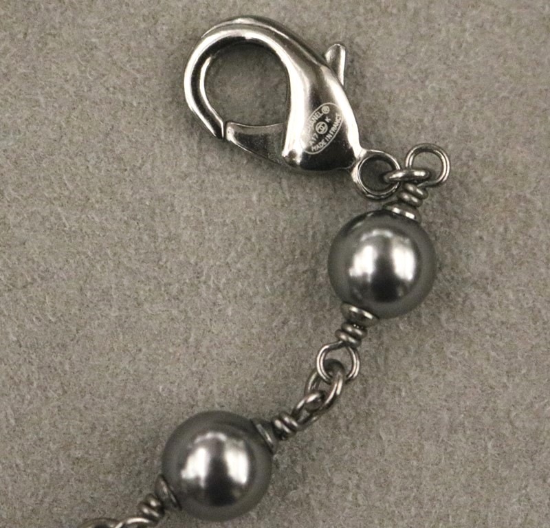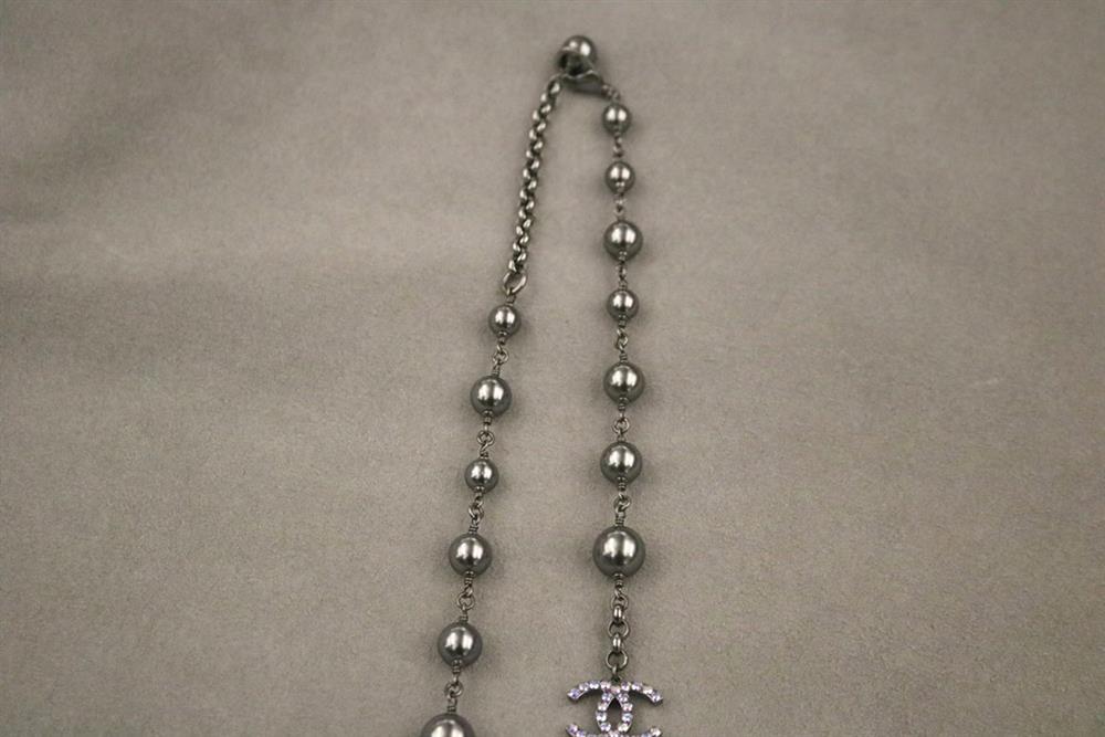 SIGNED CHANEL FAUX GRAY AND BLACK PEARL AND RHINESTONE FLEXIBLE-LINK NECKLACE, Round links spaced with gray faux pearls and black faux pearls encircled by rhinestones; two rhinestone-set logo links; clasp marked "Chanel A17-K/Made in France." With Chanel black storage pouch. L: 50 in. Estimate $800-1,200