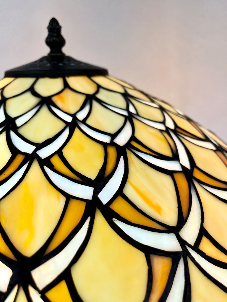 SLAG ART GLASS TWO-LIGHT TABLE LAMP WITH FISH-SCALE PATTERN DOMED SHADE. Cream. light brown and light blue shade tiled with cabochon jewel enhancements; patinated bronze base. H: 26 in.; shade: D: 17 in.Estimate $250-350
