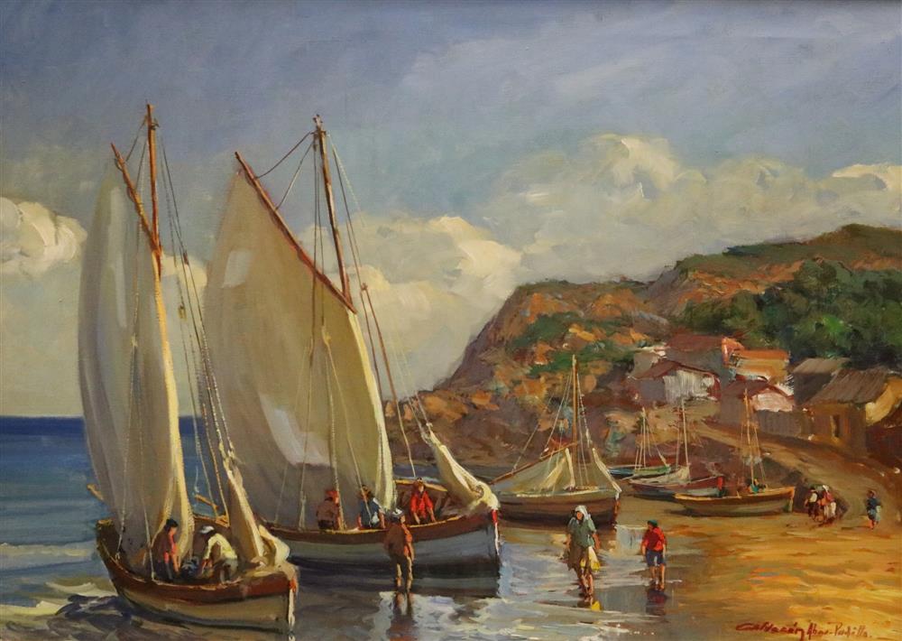 SPANISH SCHOOL (20th century). Early Morning View of the Beach, Oil on canvas. Indecipherable signature and dated lower right hand corner. Framed. - Sight (approx.): 19 x 27 inches (excluding frame)Estimate $150-250