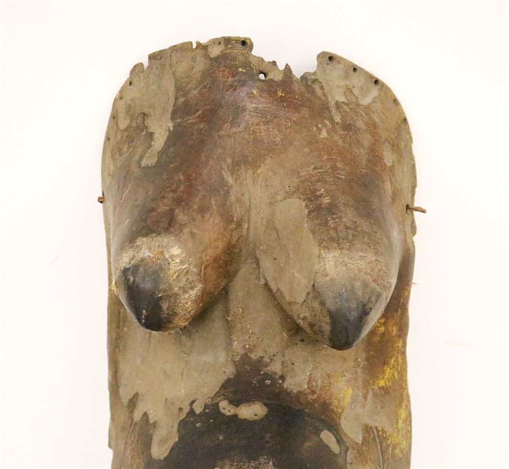 TANZANIAN MAKONDE LIPIKO BODY WOODEN HELMET MASK, 20th century. Patinated hand-carved and incised wooden body mask. Body masks of the female figure are an important protective symbol in Makonde society. Such masks are used for masquerade dances by the adult spiritual leaders as they celebrate initiation rites that mark the entrance of young boys and girls into adulthood after they were taught the skills of adulthood, traditional songs, dances, costumes, and cultural secrets ("Bortolot"). Additionally, they were used to honor the recently deceased. Collected in the field - height: 20 inches. Estimate $150-200