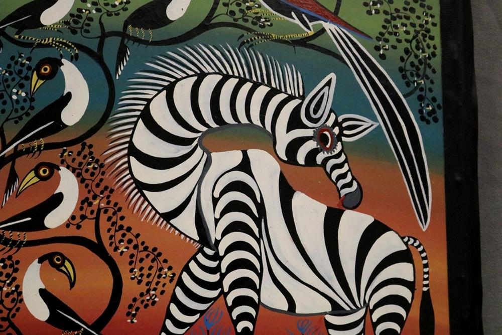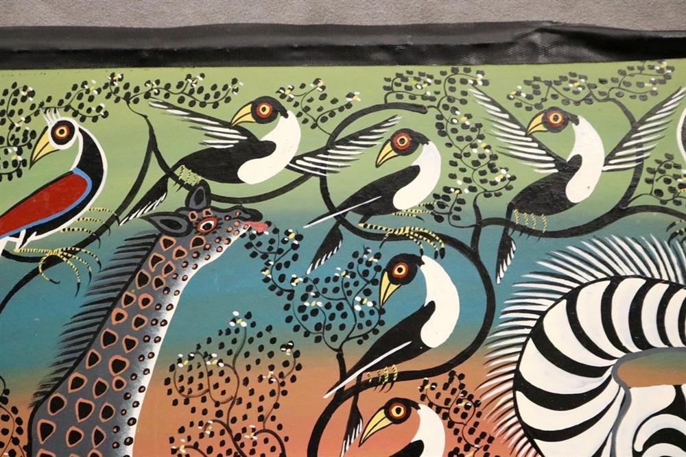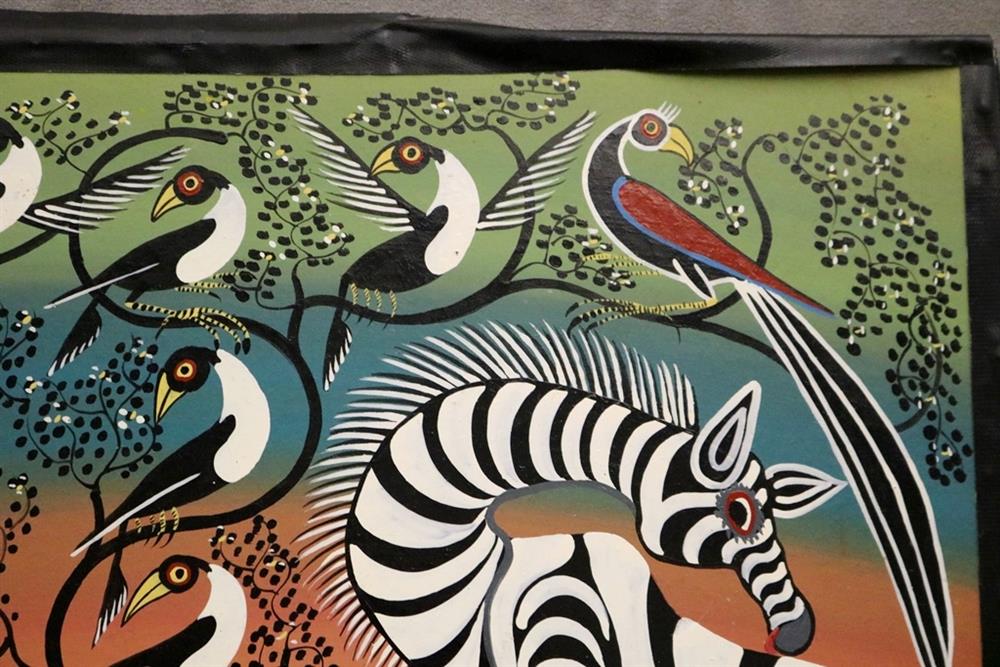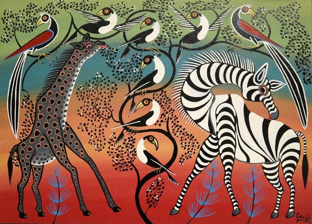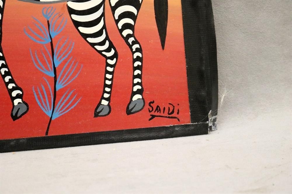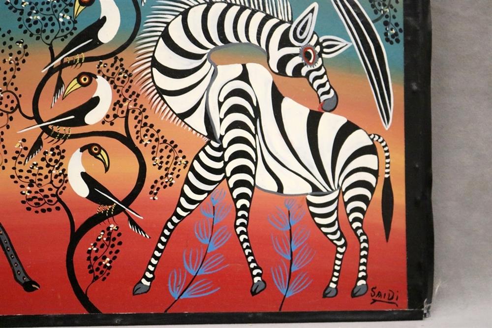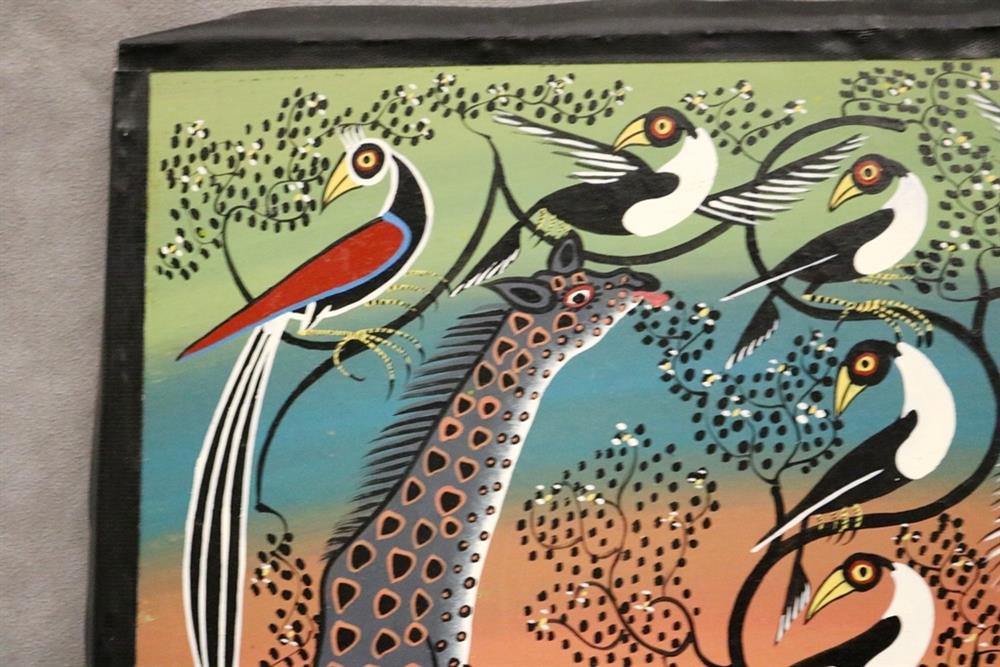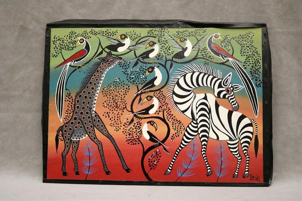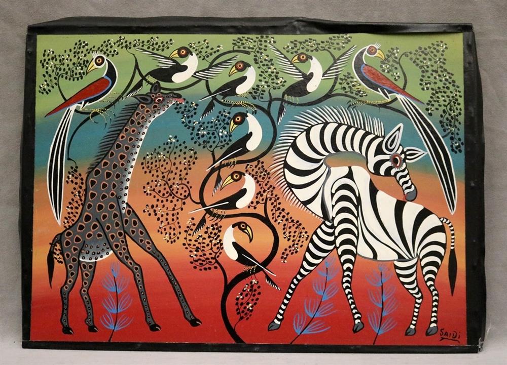 TANZANIAN SCHOOL (20th century). Giraffes among Birds, Oil on board. Signed "SAIDI" lower right hand corner. Unframed. - 15 x 21 inchesEstimate $80-120