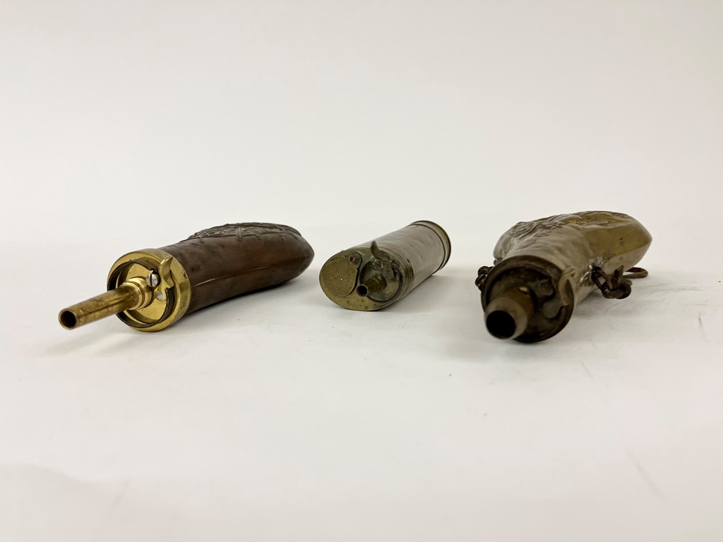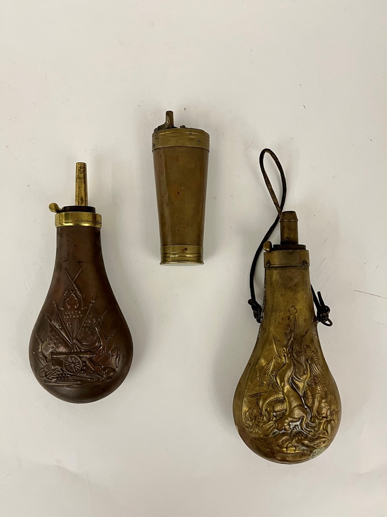 THREE 19TH CENTURY GUNPOWDER FLASKS. Two drop-shape with relief decoration. Largest, L: 8 in.Estimate $100-150