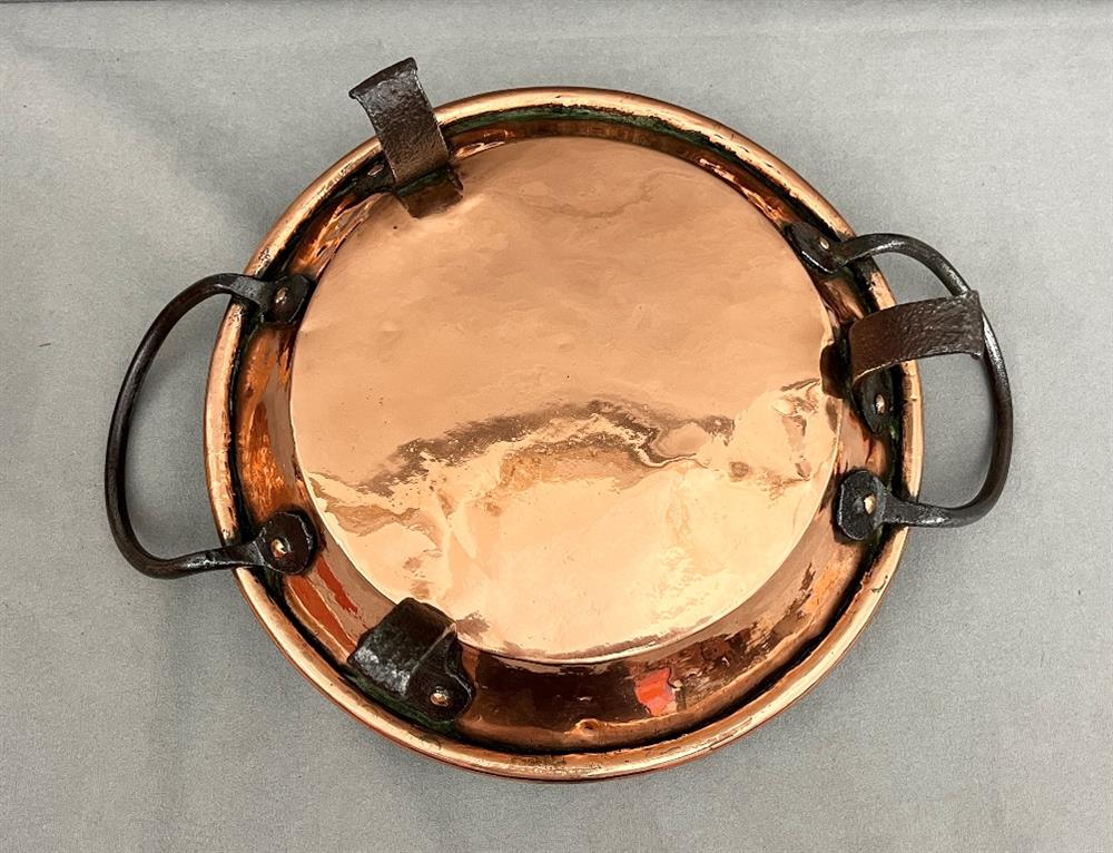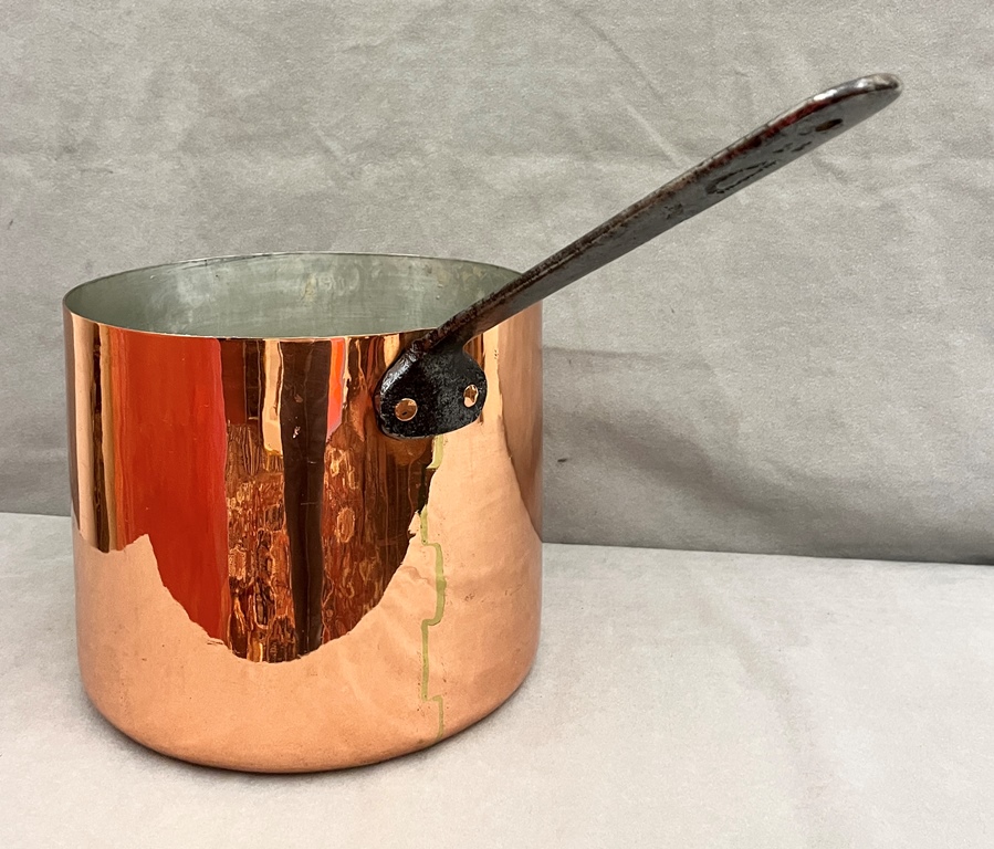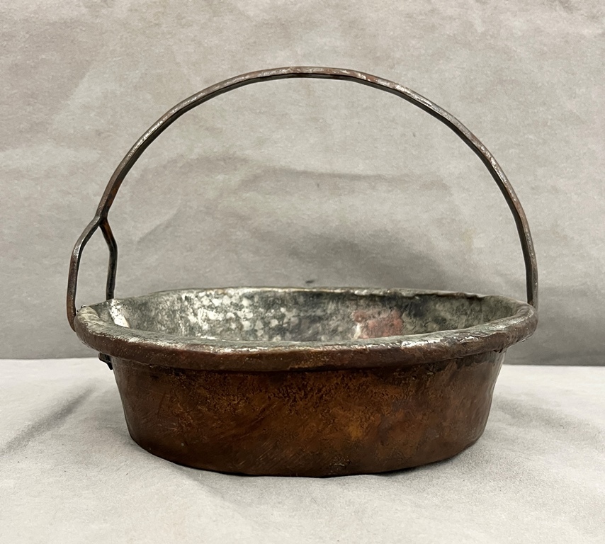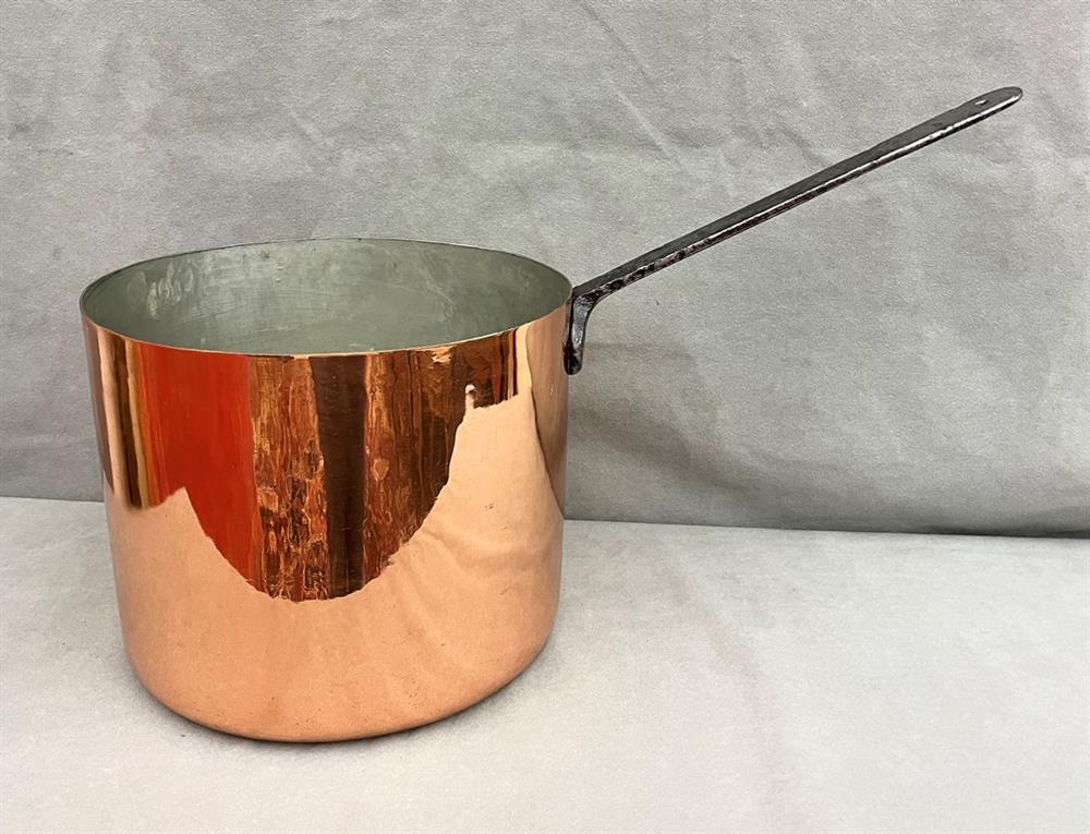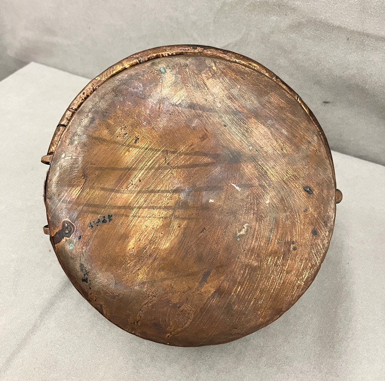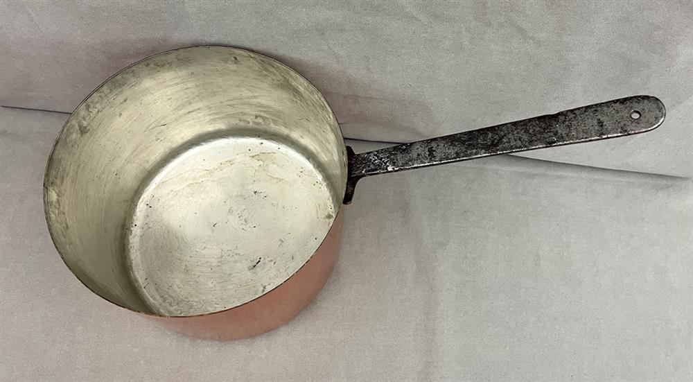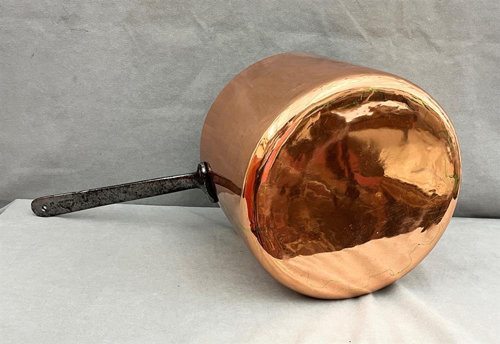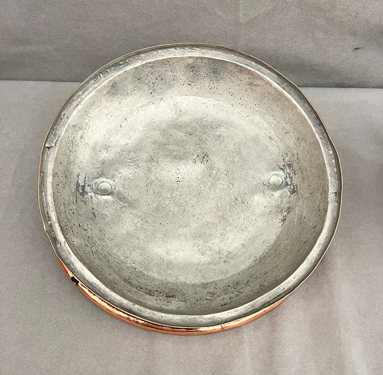 THREE ANTIQUE COPPER VESSELS INCLUDING LARGE COPPER POT SIGNED PAUL BAYER, PHILADELPHIA, AND FRENCH COPPER TOURTIERE. Pot, circa 1880, dovetailed; Pot, H: 9 1/2 in. D: 11 5/8 in. . Tourtiere, . mid 19th century, and tin lined loop handle pan, D: 10 in. Estimate $300-400