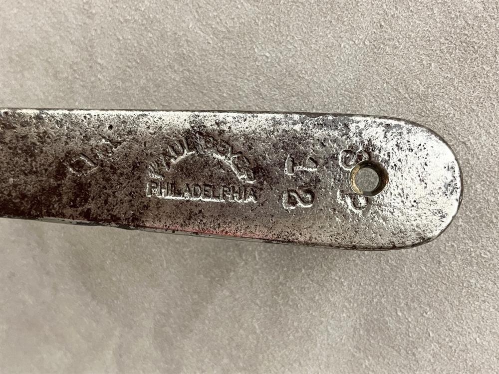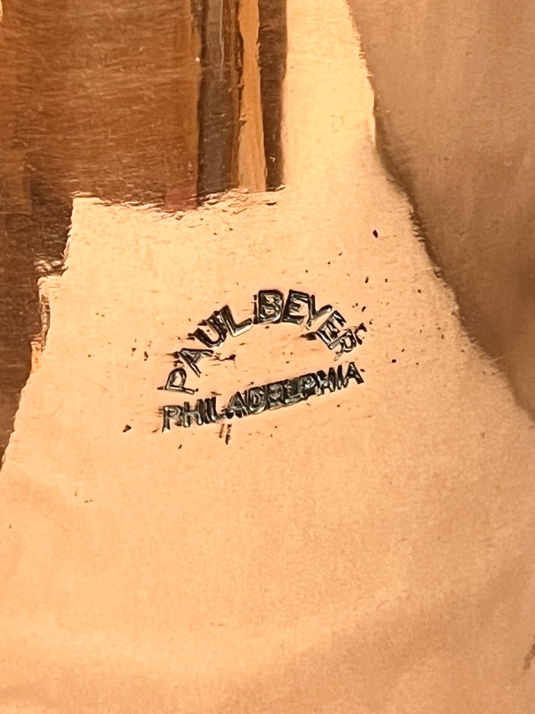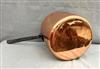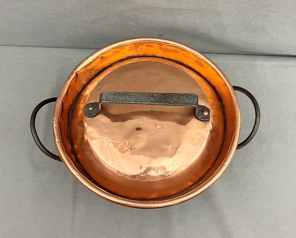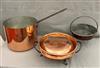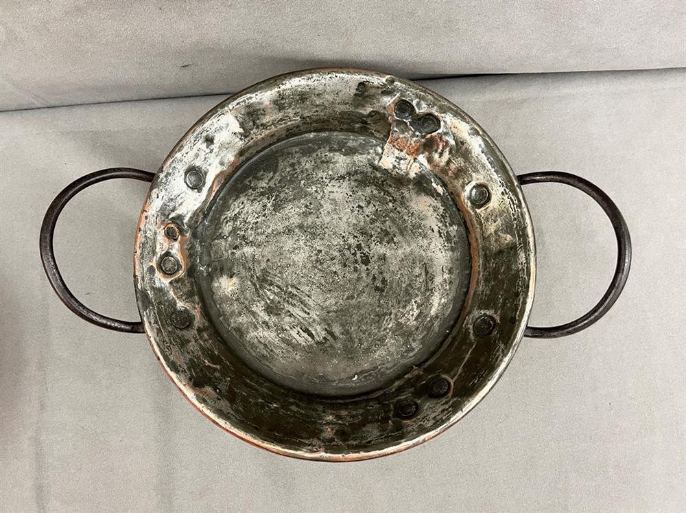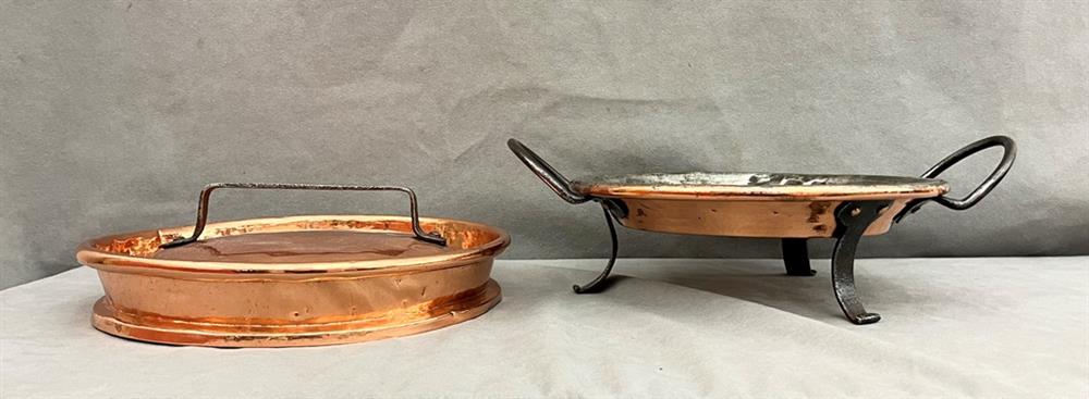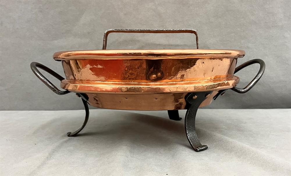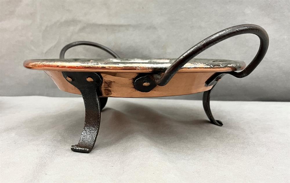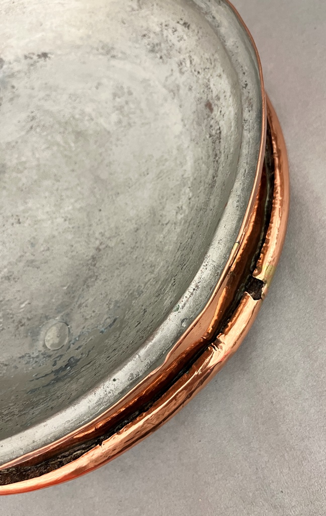 THREE ANTIQUE COPPER VESSELS INCLUDING LARGE COPPER POT SIGNED PAUL BAYER, PHILADELPHIA, AND FRENCH COPPER TOURTIERE. Pot, circa 1880, dovetailed; Pot, H: 9 1/2 in. D: 11 5/8 in. . Tourtiere, . mid 19th century, and tin lined loop handle pan, D: 10 in. Estimate $300-400